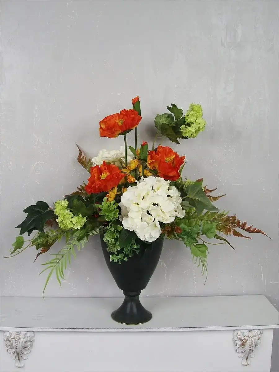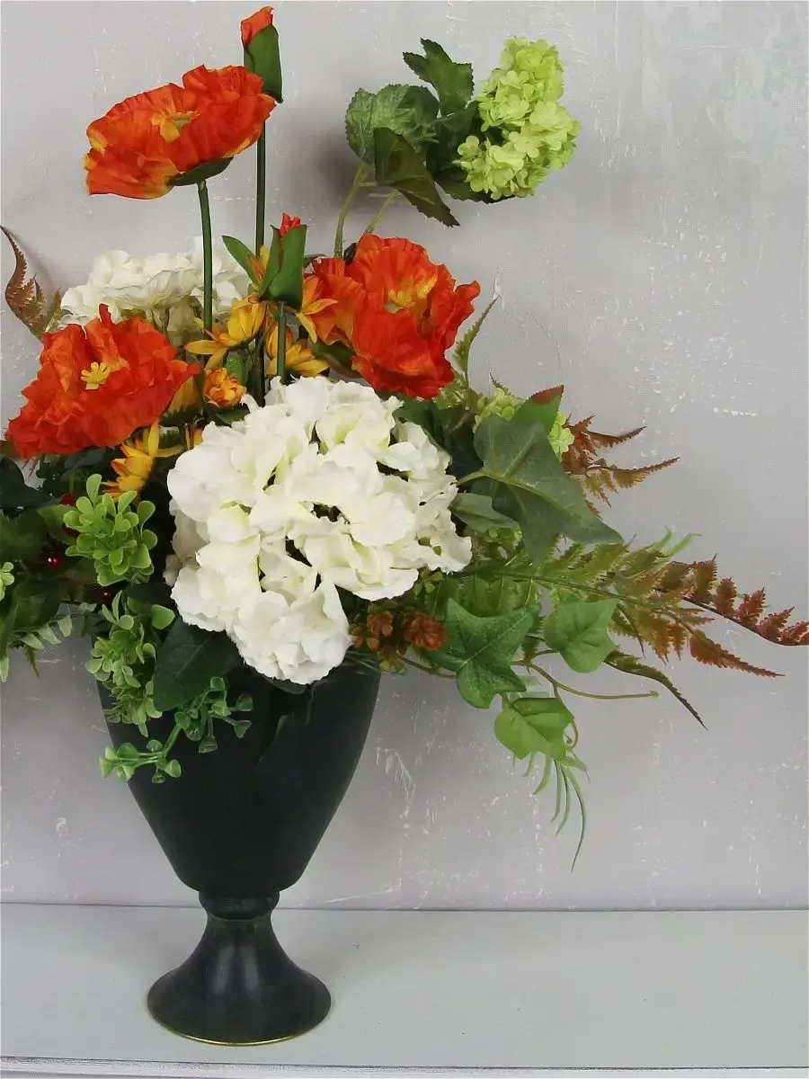 Авторская композиция выполнена из высококачественных искусственных растений. Металлическая ваза прекрасно дополнит любой интерьер. Размер композиции ш55*в53*г35 см. Высота вазы 23 см.