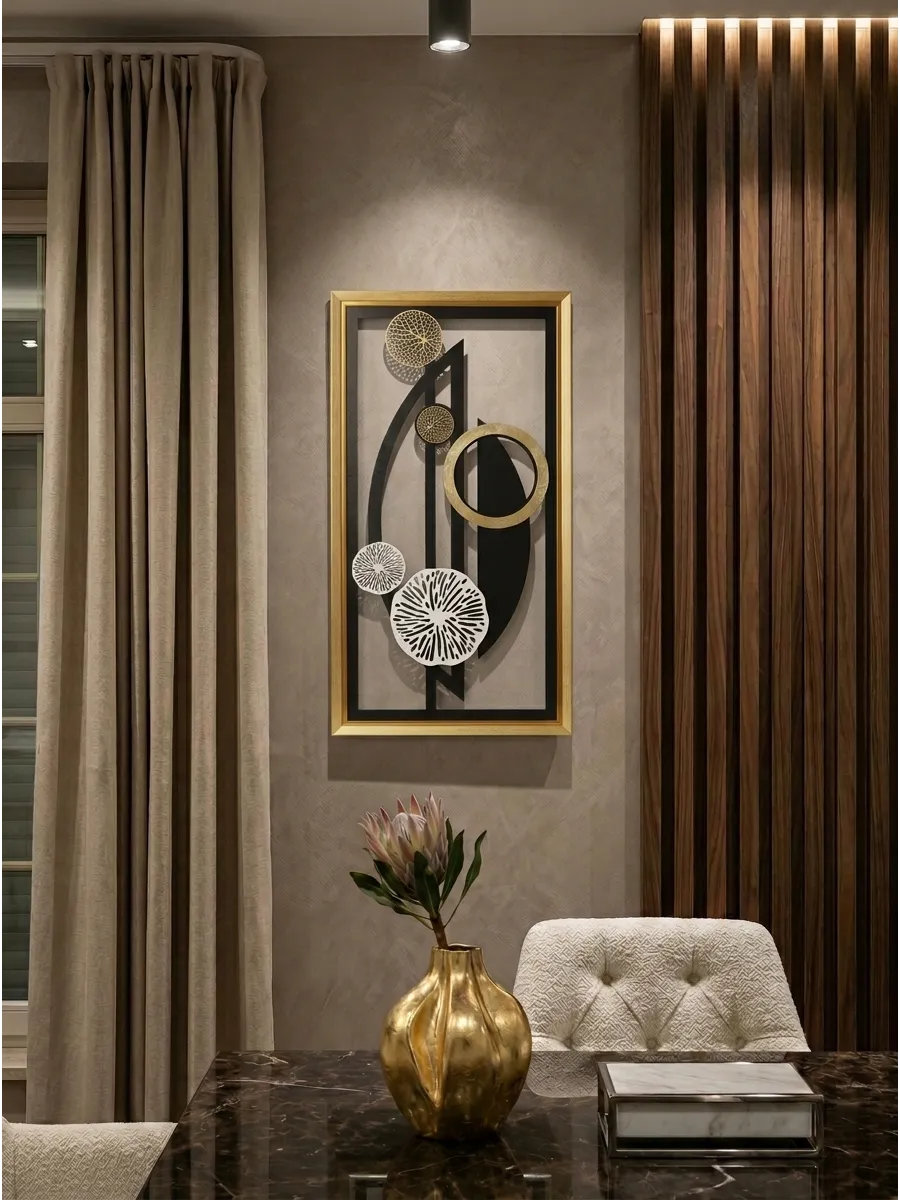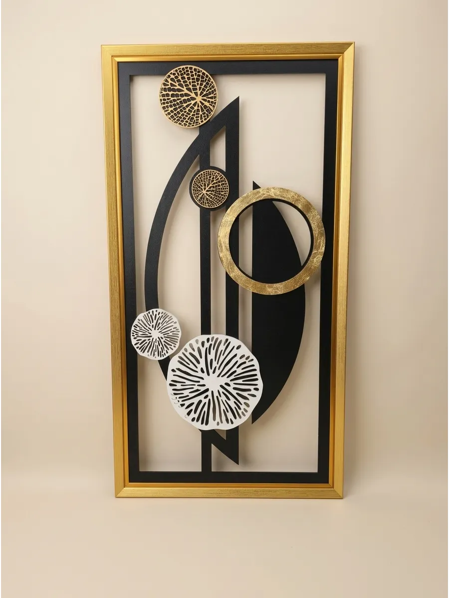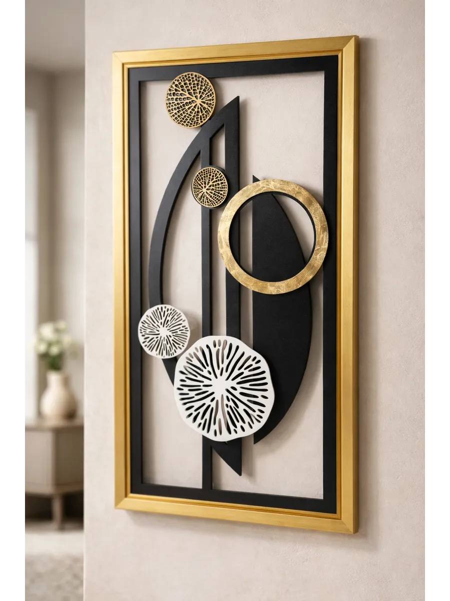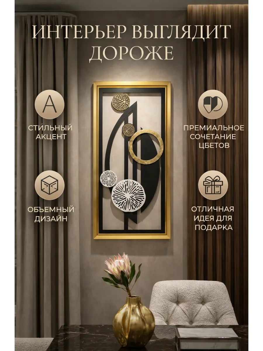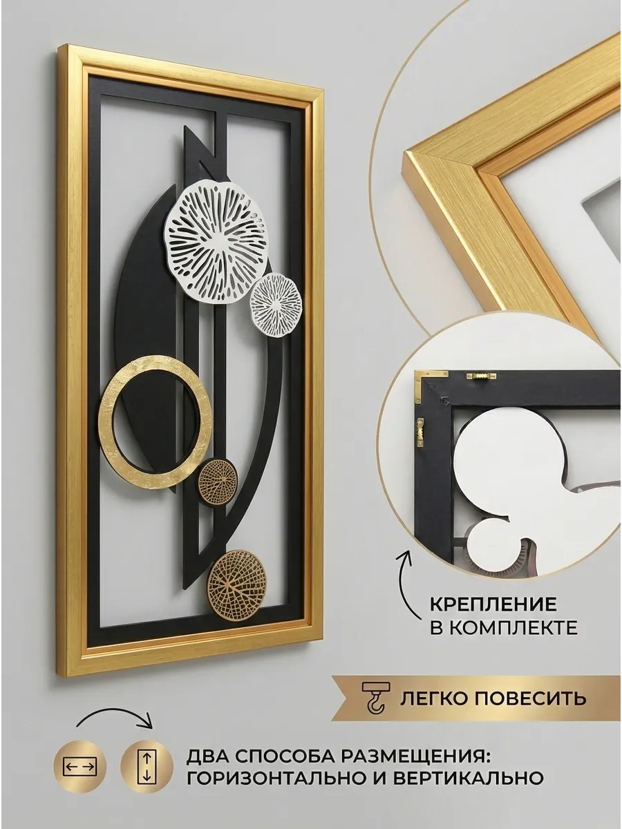 Декор настенный "Абстракция" от HOME GALLERY - это уникальное и стильное дополнение к интерьеру вашего дома. Изготовленный из МДФ в багетной раме из полиуретана. Размеры 85*45 см позволяют легко интегрировать его в любую комнату: гостиную, спальню или кухню. Установка декорация осуществляется с помощью зубчатого зацепа, что обеспечивает его прочное и надежное крепление на стене. Панно с объемными деталями - это идеальный выбор для тех, кто ценит уникальный дизайн и высокое качество. Большой настенный декор для современного интерьера в золотой раме станет украшением вашего дома или офиса.