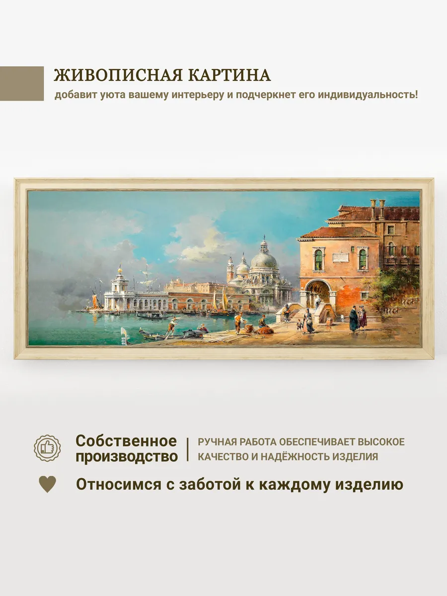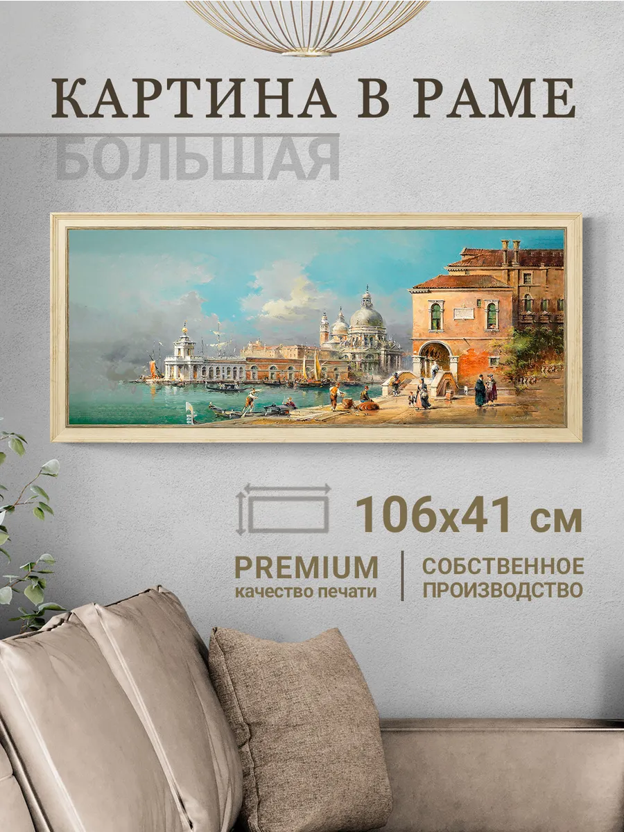 Картина напечатана на натуральном холсте, покрыта лаком. Холст наклеен на ХДФ, чтобы избежать провисания. Размер по холсту 100*40 см, размер картины с рамой 106*46 см. Картина будет прекрасно смотреться как самостоятельно, так и в композиции с другими картинами этой коллекции.