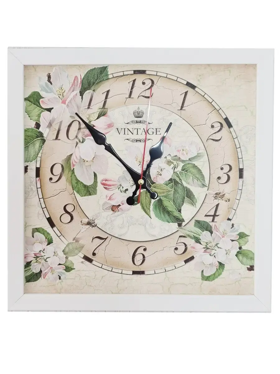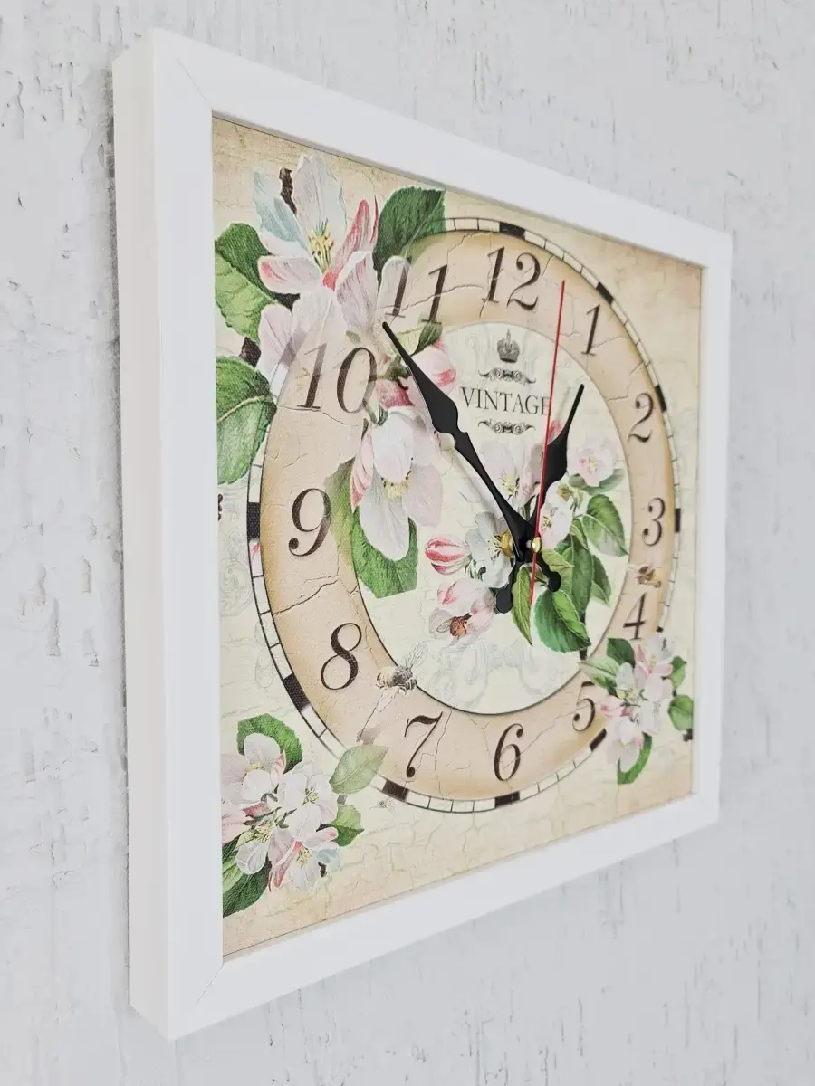 Настенные часы в лаконичной белой раме. Циферблат напечатан на натуральном холсте, покрыт лаком. Размер часов 33*33 см, глубина 3 см. Механизм бесшумный на одной батарейке ААА. Батарейка в комплект не входит.