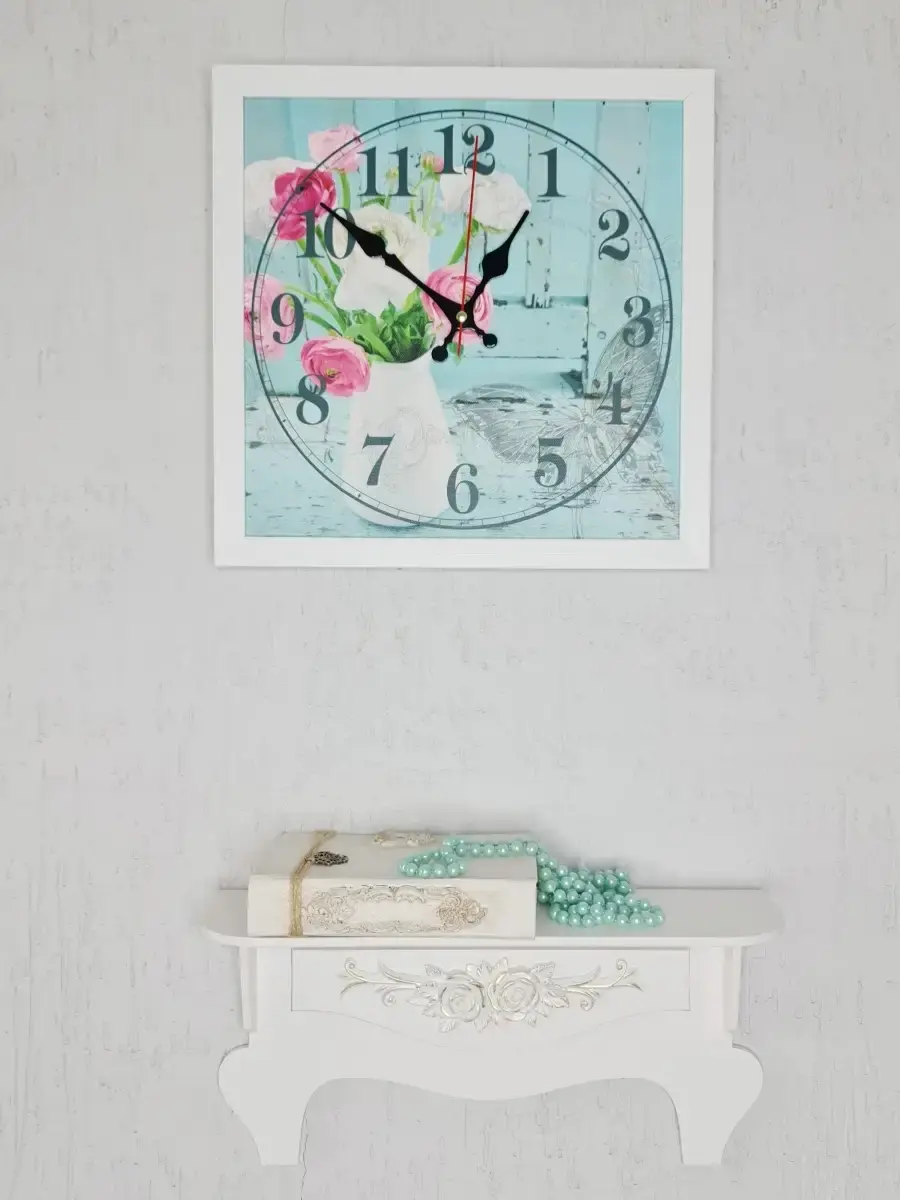 Настенные часы в лаконичной белой раме. Циферблат напечатан на натуральном холсте, покрыт лаком. Размер часов 33*33 см, глубина 3 см. Механизм бесшумный на одной батарейке ААА. Батарейка в комплект не входит.