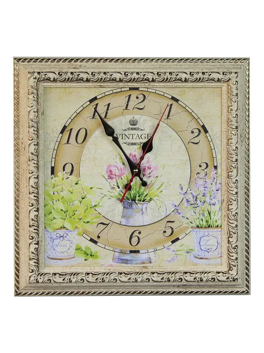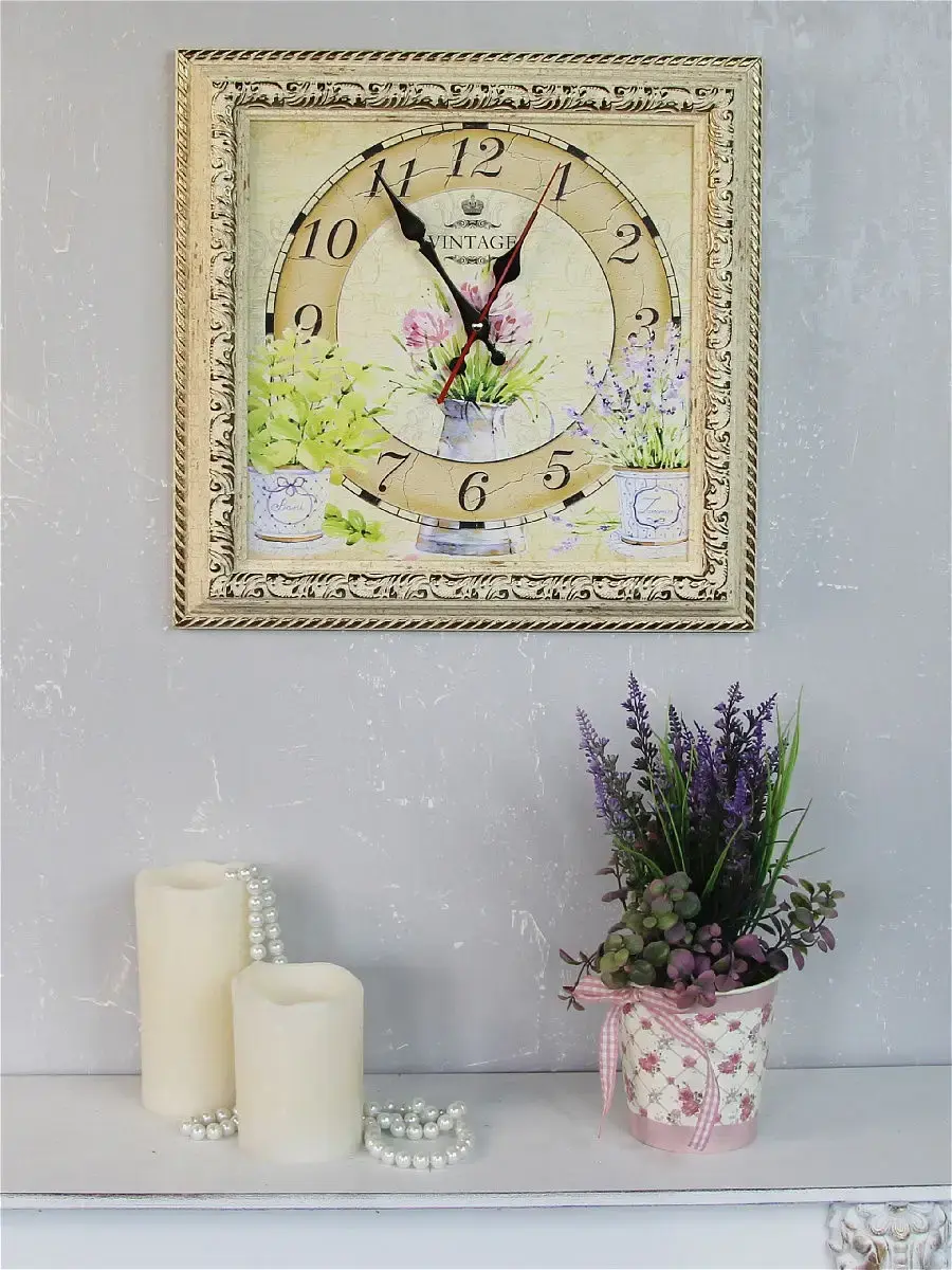 Настенные часы в красивой багетной раме с деликатной позолотой. Циферблат напечатан на натуральном холсте, покрыт лаком. Размер часов 38*38 см, глубина 5 см. Механизм бесшумный на одной батарейке ААА. Батарейка в комплект не входит. Часы сочетаются с полкой арт.15497754