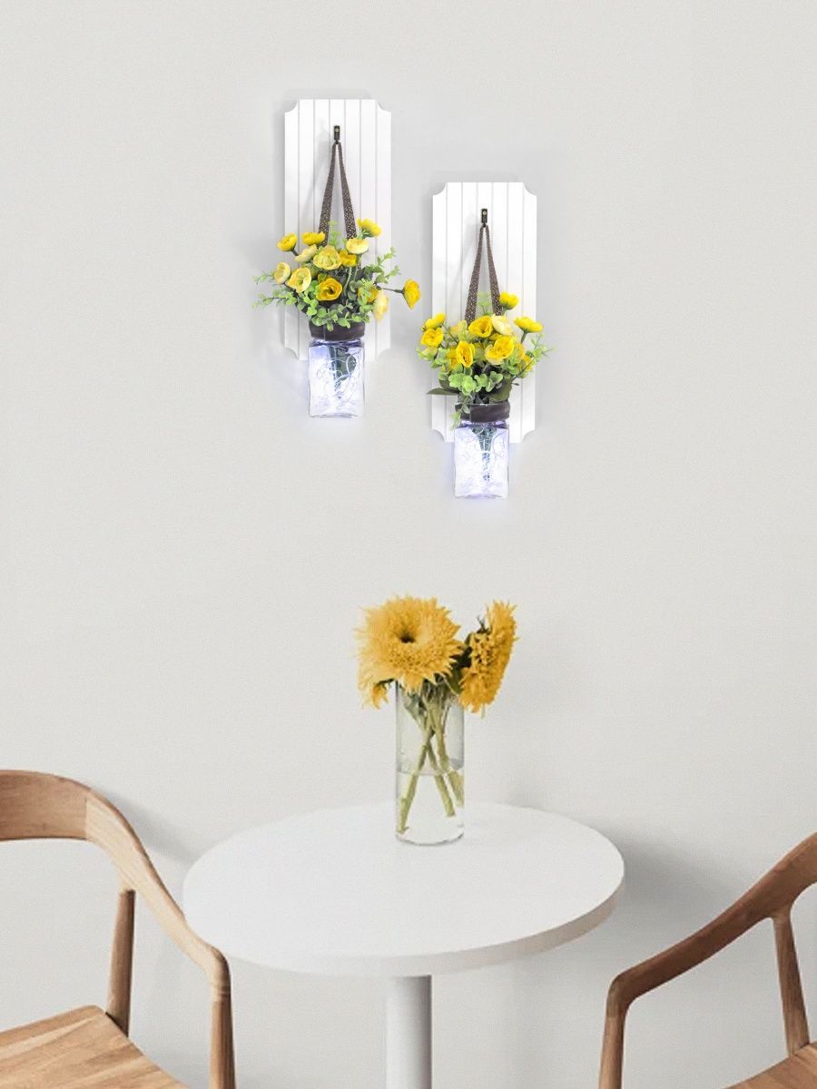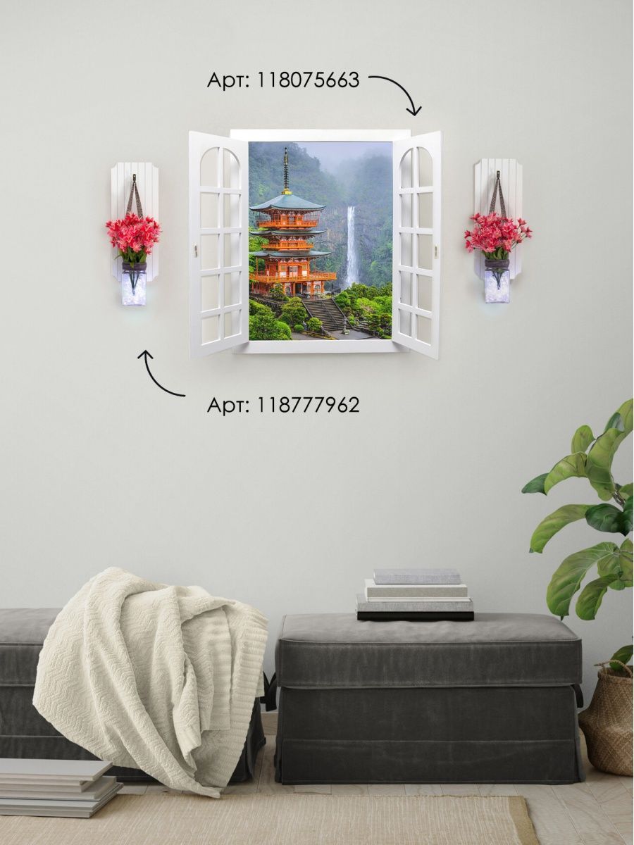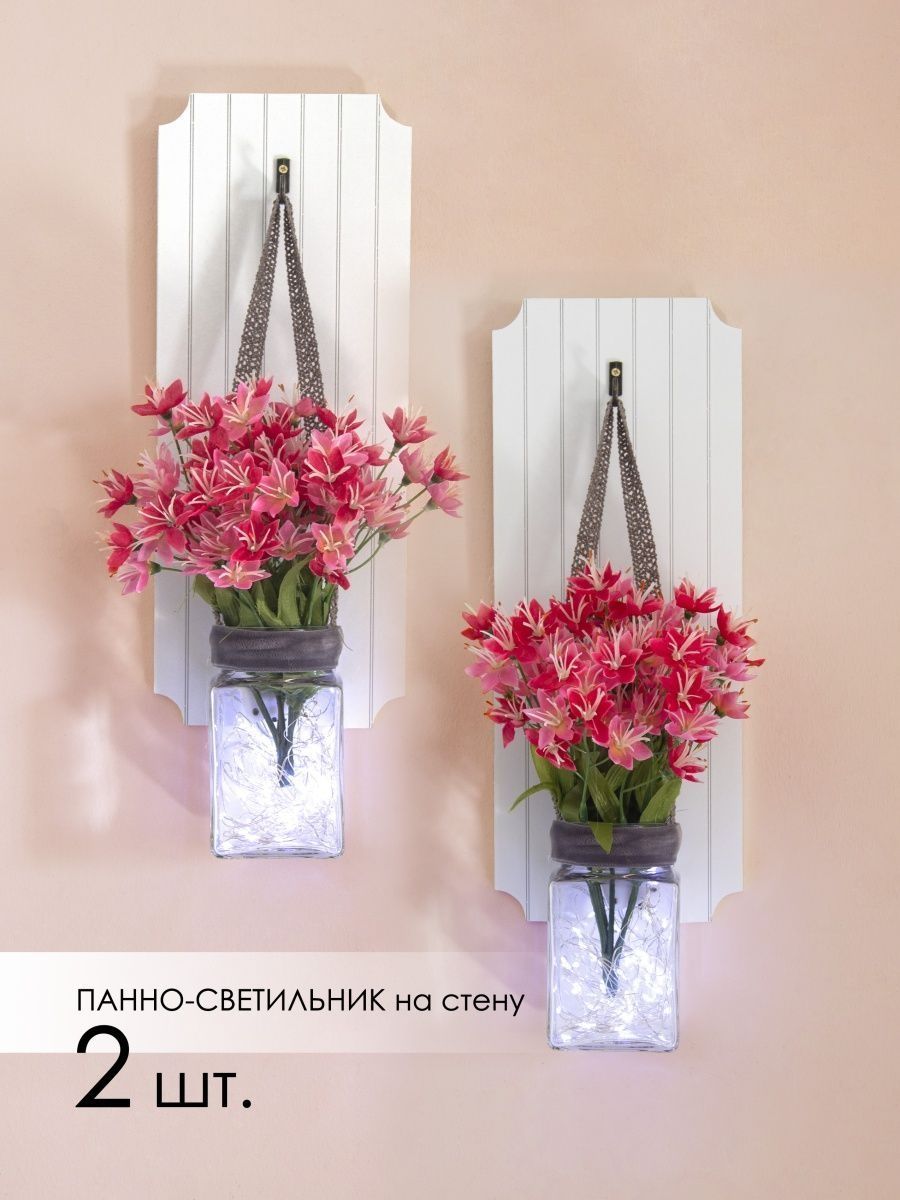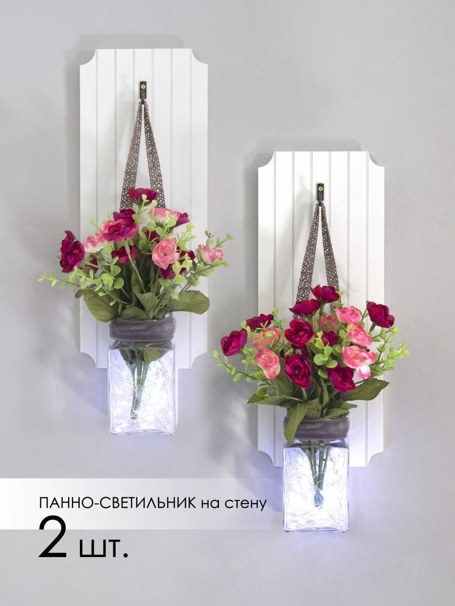 Два настенных панно с цветами и подсветкой - оригинальное и изысканное украшение интерьера. Панно настенное со светодиодными светильниками - практичный элемент декора. Композицию с цветами можно использовать как ночник в вечернее время. В комплекте идет светодиодная лента 2 метра с двумя круглыми батарейками. Искусственные растения не требуют ухода, а также букет вынимается из вазы(баночки) и его можно в любой момент заменить на какой-либо другой. Настенный декор создаст романтичную атмосферу и уют в доме, и будет хорошим подарком на новоселье, день рождения, годовщину свадьбы, просто так маме, свекрови, теще, супруге, коллеге на любой повод. Включенный светильник-букет сразу превращается в сказочный домашний аксессуар, который не оставит равнодушным ни одного ребенка. Крепление для стены идет в комплекте. Комплект хорошо сочетается с фальш-окнами: арт. 118075663, зеркалами: арт. 96674812 и другими изделиями бренда Elenadecor.