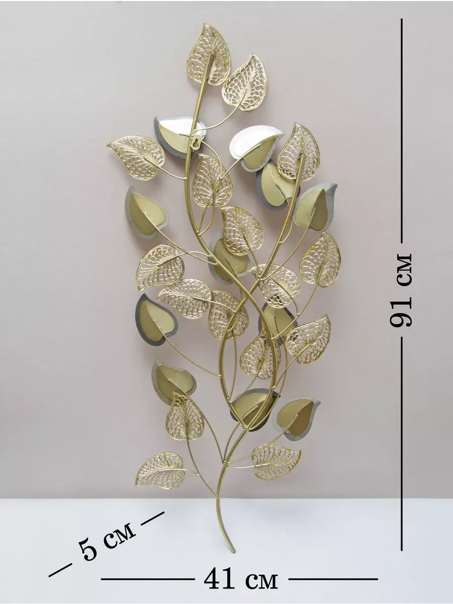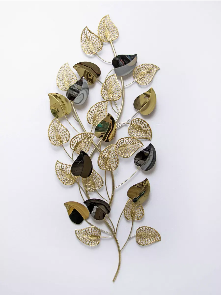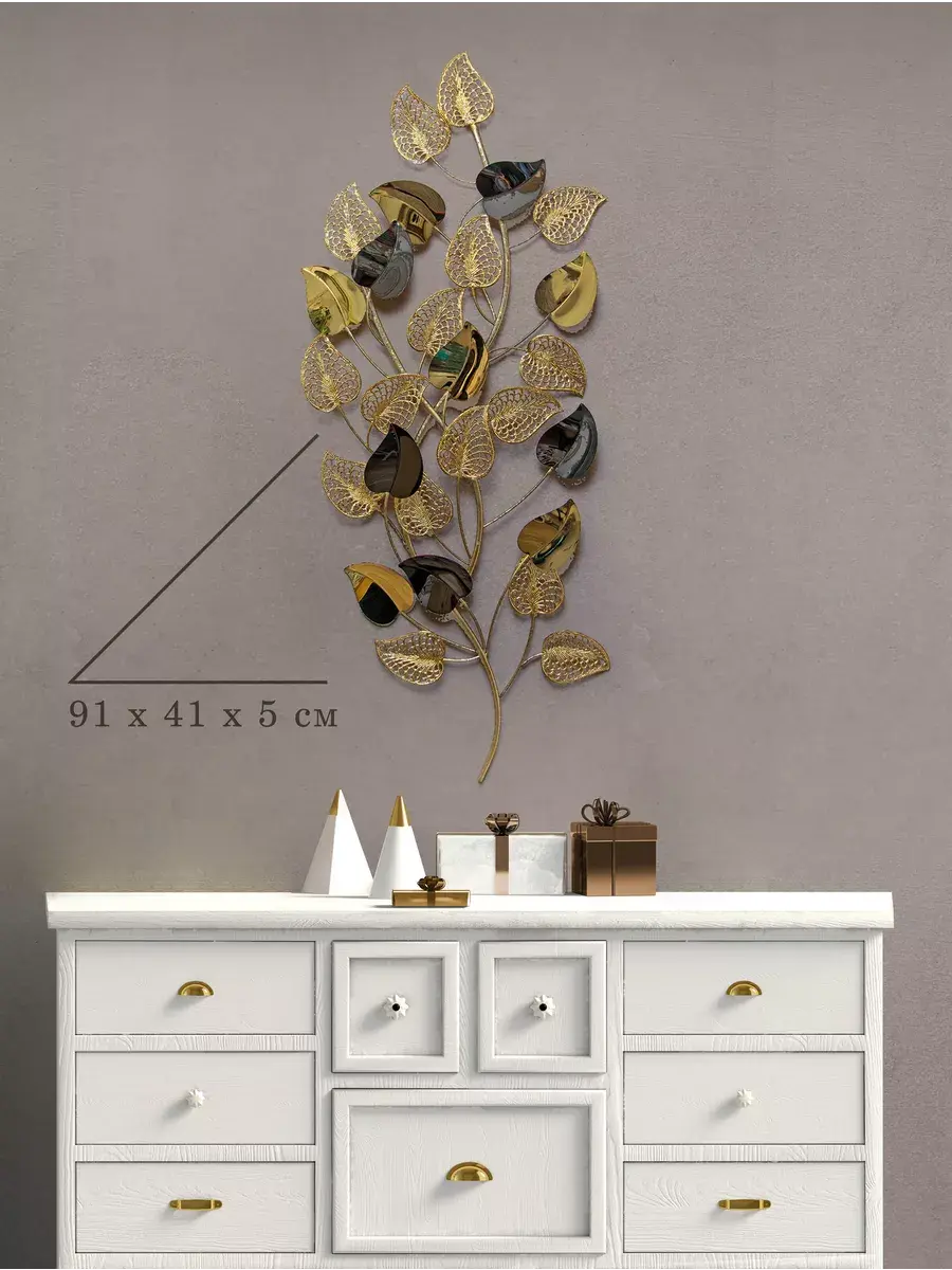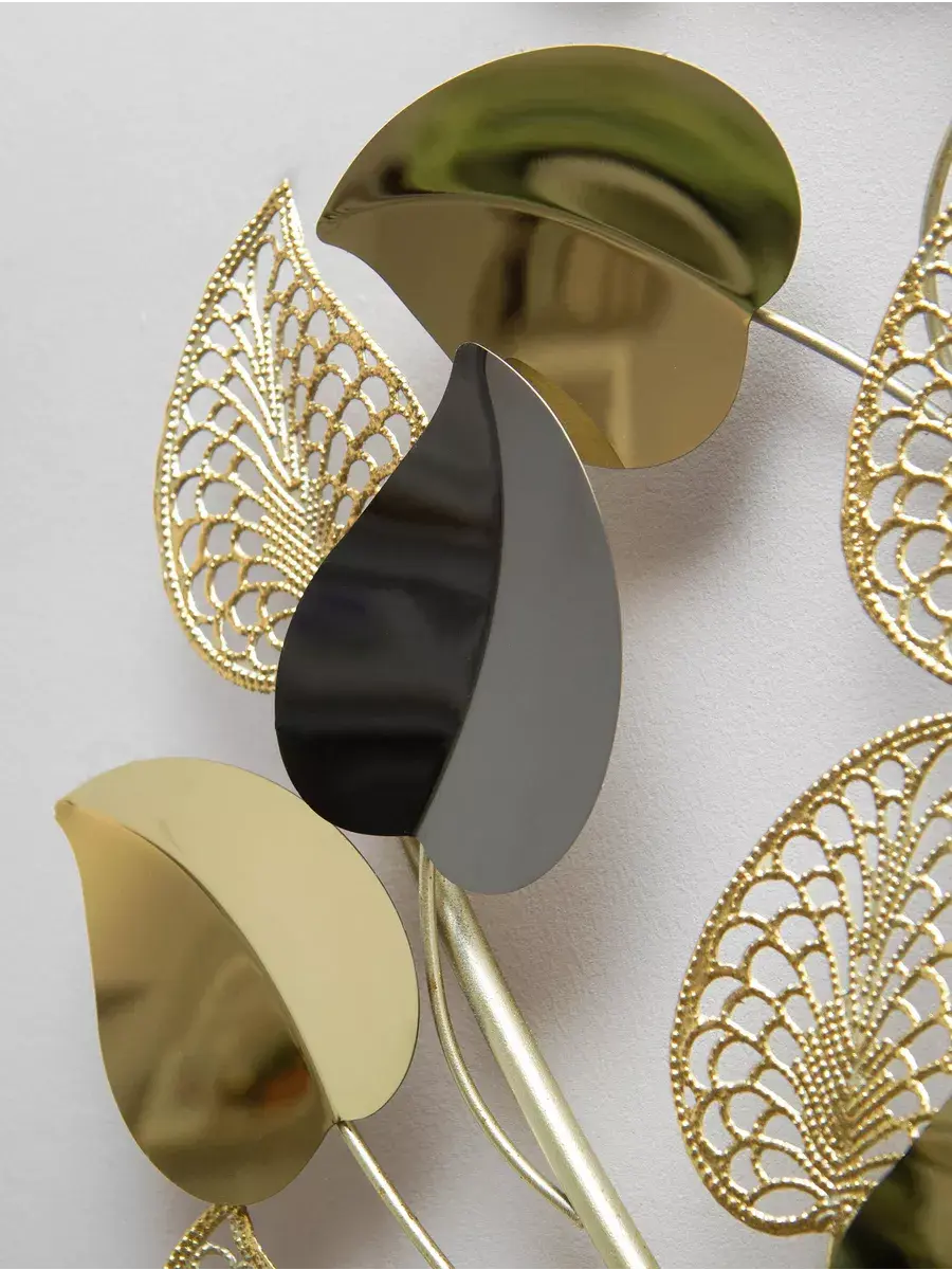 Панно настенное декоративное металлическое "Золотые листья". Декорация настенная с объёмными деталями в современном стиле. Панно изготовлено и покрашено вручную. Сочетает в себе как глянцевые зеркальные элементы, так и золотисто-матовые. Панно предназначено для украшения стен гостиной или спальни. Размер панно составляет 41х91х5 см. Это прекрасное объёмное металлическое панно "Золотые листья" придаст вашему интерьеру элегантный и изысканный вид. Размеры 91*41 см позволят идеально вписать его в любое пространство. Изготовлено из высококачественного металла, панно обладает прочностью и долговечностью. Уникальный дизайн в виде золотых листьев придаст вашему дому неповторимость и эстетичность. Будьте на шаг впереди с модным и стильным панно "Золотые листья". Подарите это изделие вашей дочери, коллеге или сестре. Материал изготовления - металл. Это не хрупкий товар, а его цвет универсален для любого интерьера. Не упустите возможность приобрести красивую настенную декорацию для своего дома! Размер 91*41*5 см. Крепление для стены в комплекте.
