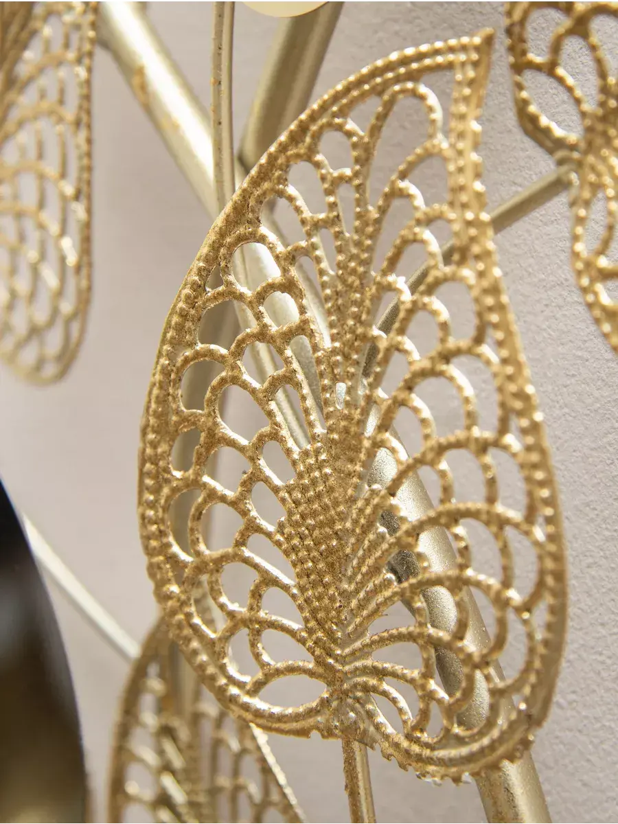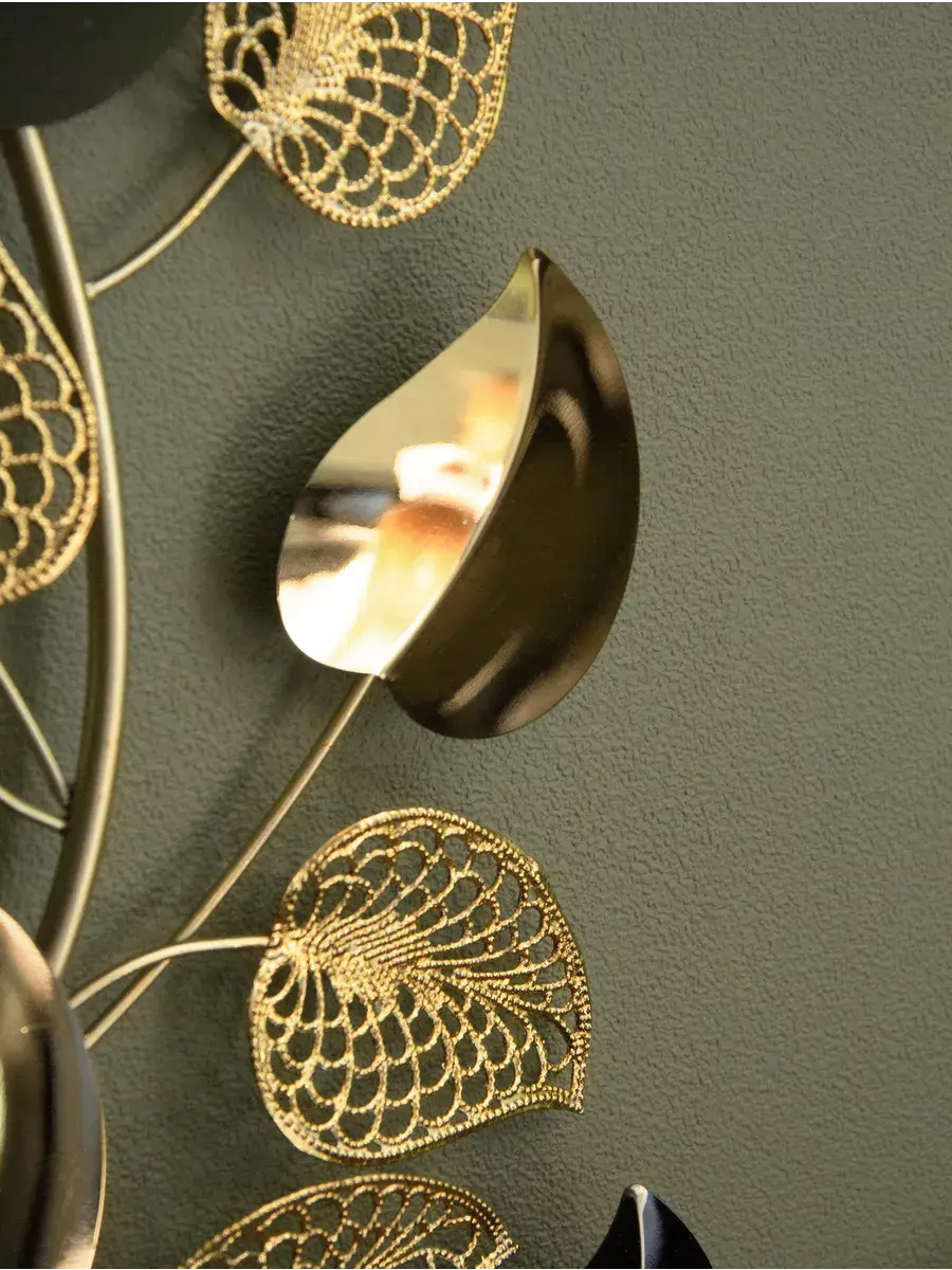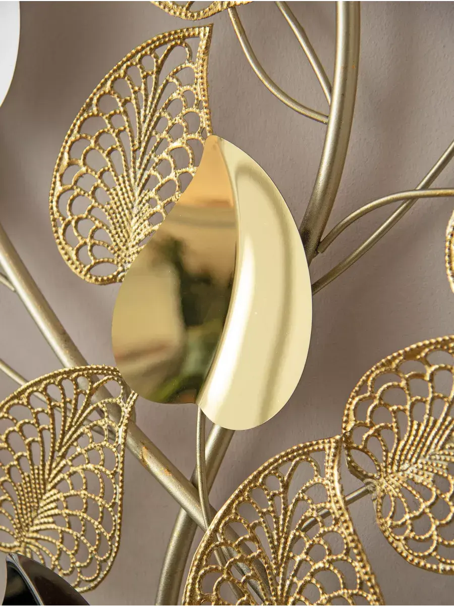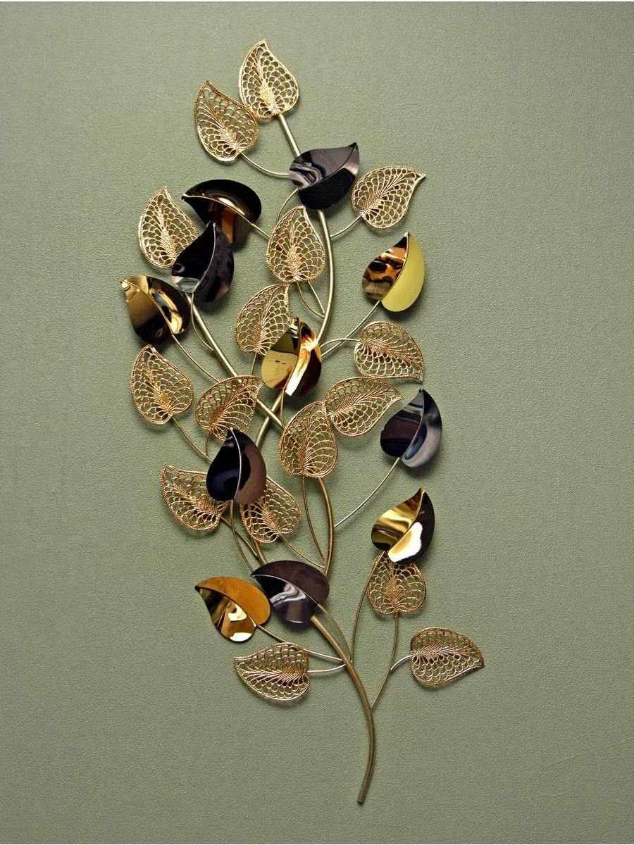 Панно настенное декоративное металлическое "Золотые листья". Декорация настенная с объёмными деталями в современном стиле. Панно изготовлено и покрашено вручную. Сочетает в себе как глянцевые зеркальные элементы, так и золотисто-матовые. Панно предназначено для украшения стен гостиной или спальни. Размер панно составляет 41х91х5 см. Это прекрасное объёмное металлическое панно "Золотые листья" придаст вашему интерьеру элегантный и изысканный вид. Размеры 91*41 см позволят идеально вписать его в любое пространство. Изготовлено из высококачественного металла, панно обладает прочностью и долговечностью. Уникальный дизайн в виде золотых листьев придаст вашему дому неповторимость и эстетичность. Будьте на шаг впереди с модным и стильным панно "Золотые листья". Подарите это изделие вашей дочери, коллеге или сестре. Материал изготовления - металл. Это не хрупкий товар, а его цвет универсален для любого интерьера. Не упустите возможность приобрести красивую настенную декорацию для своего дома! Размер 91*41*5 см. Крепление для стены в комплекте.
