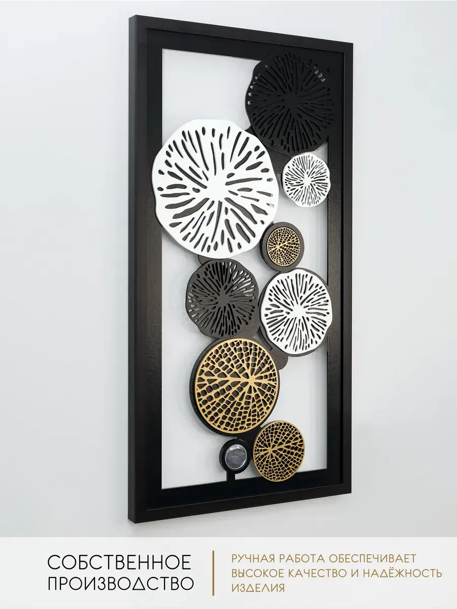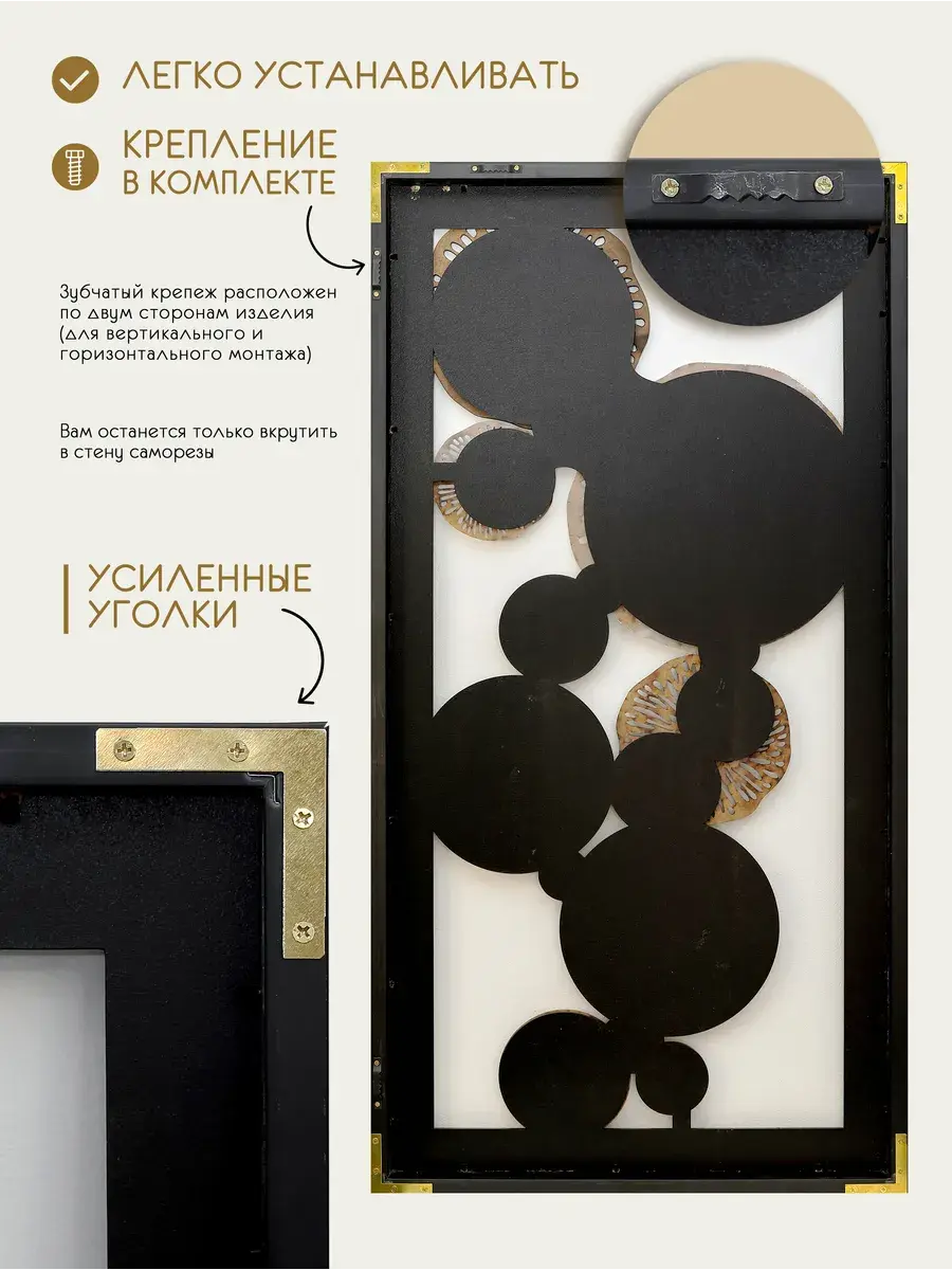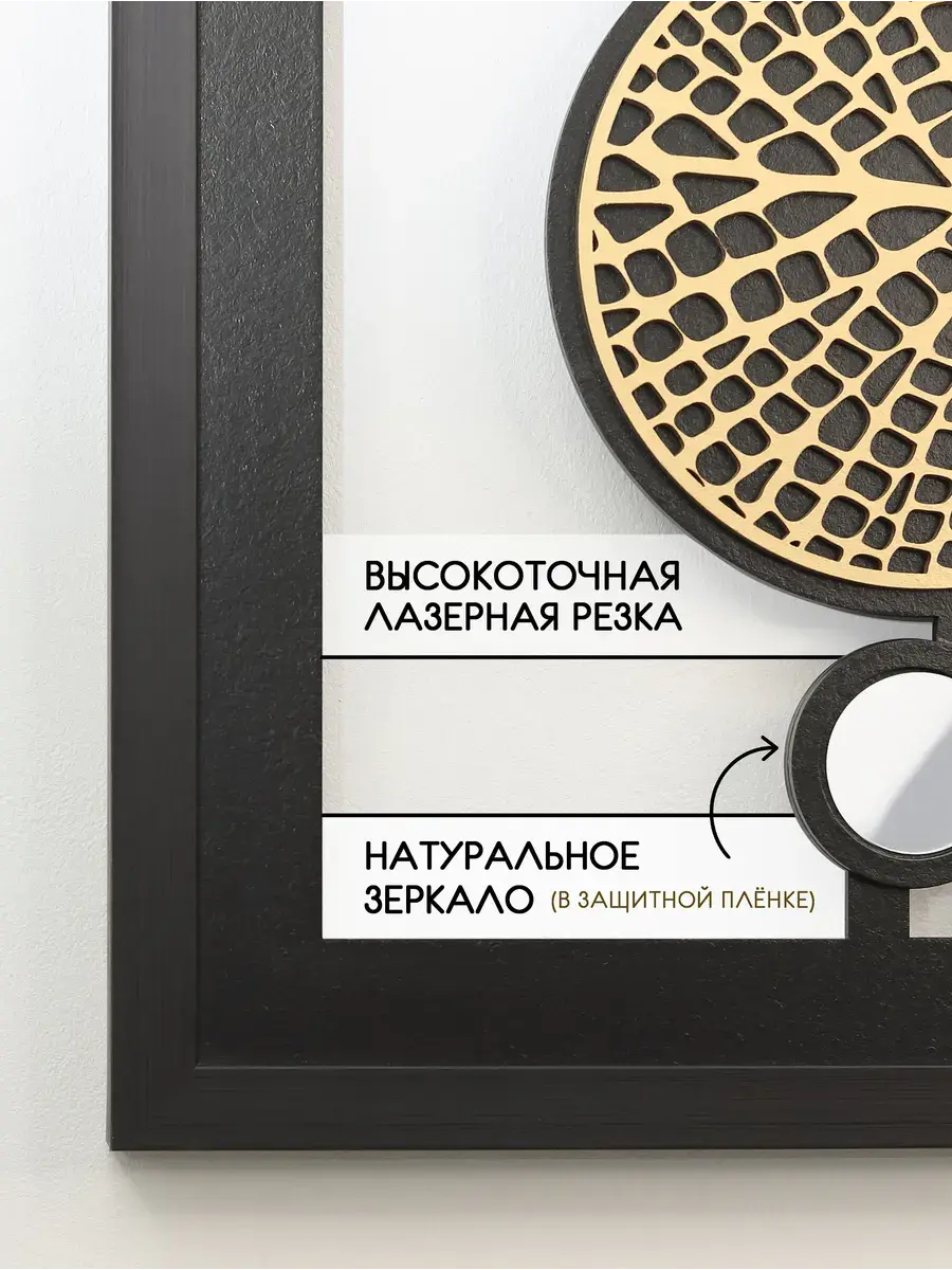 Большое абстрактное панно в раме. Украсьте свои стены с этим оригинальным и уникальным настенным декором - моделью декорации настенной абстракции. Каждый элемент этой художественной скульптуры ручной работы выполнен с любовью и вниманием к деталям. Особый дизайн и золотая рама добавляют шарма и загадочности. Панно на стену с кругами и кольцами - это идеальное украшение для современного интерьера, которое станет привлекательным фокусом в гостиной, спальне или кухне. Современный декор для дома и офиса от бренда HOME GALLERY , это стильный дизайн и высокое качество. Настенное деревянное панно размером 83x43 см с зеркальными элементами создаст чувство гармонии и солнечного настроения в вашем доме. Высокое качество материала гарантирует долгий срок службы изделия. Универсальный зубчатый зацеп обеспечивает надежное крепление на стене. Не упустите возможность приобрести большое настенное панно, которое станет прекрасным подарком для родных и друзей. Позвольте этой настенной декорации привлечь восторженные взгляды и добавить чарующей атмосферы в ваш дом.