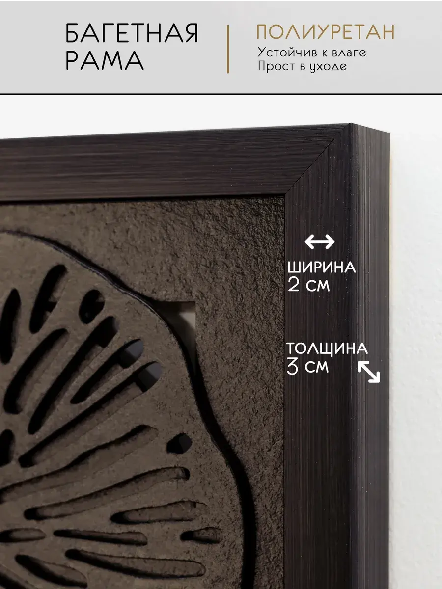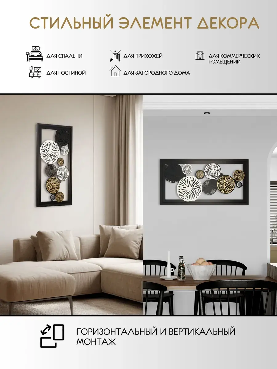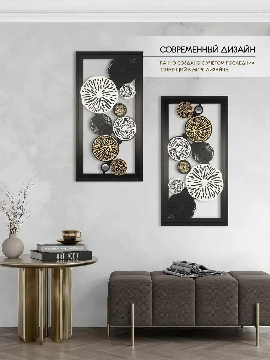 Большое абстрактное панно в раме. Украсьте свои стены с этим оригинальным и уникальным настенным декором - моделью декорации настенной абстракции. Каждый элемент этой художественной скульптуры ручной работы выполнен с любовью и вниманием к деталям. Особый дизайн и золотая рама добавляют шарма и загадочности. Панно на стену с кругами и кольцами - это идеальное украшение для современного интерьера, которое станет привлекательным фокусом в гостиной, спальне или кухне. Современный декор для дома и офиса от бренда HOME GALLERY , это стильный дизайн и высокое качество. Настенное деревянное панно размером 83x43 см с зеркальными элементами создаст чувство гармонии и солнечного настроения в вашем доме. Высокое качество материала гарантирует долгий срок службы изделия. Универсальный зубчатый зацеп обеспечивает надежное крепление на стене. Не упустите возможность приобрести большое настенное панно, которое станет прекрасным подарком для родных и друзей. Позвольте этой настенной декорации привлечь восторженные взгляды и добавить чарующей атмосферы в ваш дом.