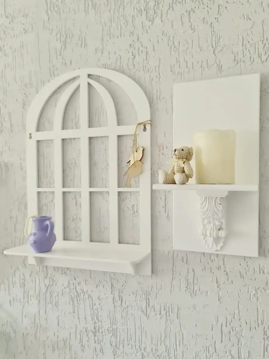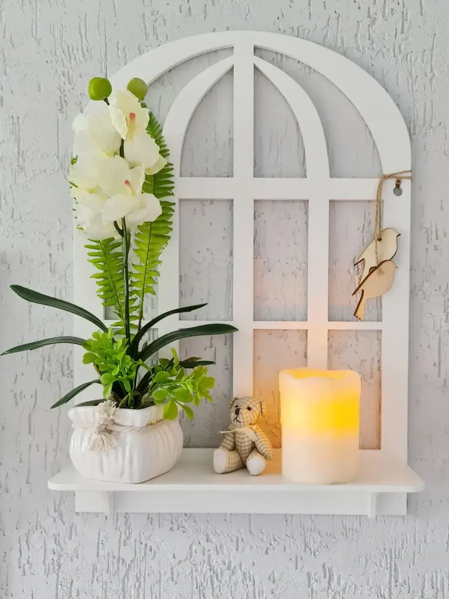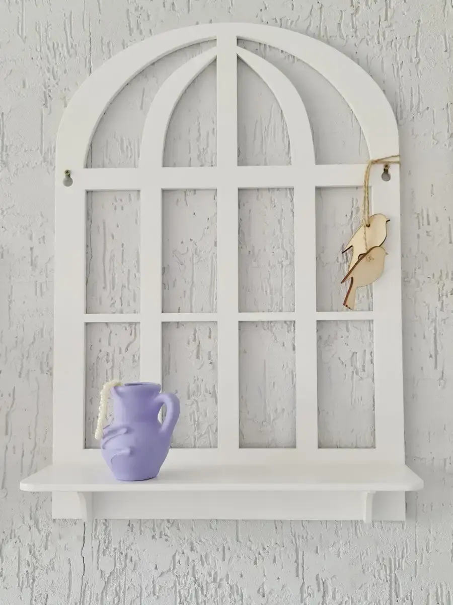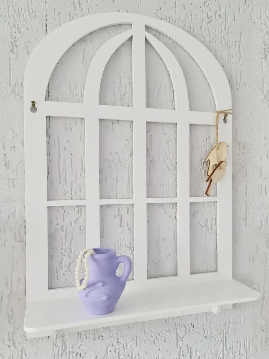 Настенный декор "Окно-арка с полочкой" выполнен из высококачественной березовой фанеры, окрашен акриловой эмалью. Размер 35*50 см, глубина полочки 10 см. Можно сделать зеркальный фон.
