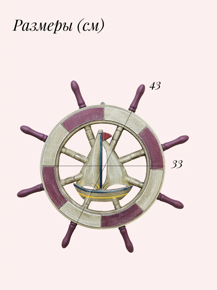 Штурвал изготовлен из натурального дерева. Размер штурвала 43 см. Крепление для стены в комплекте.