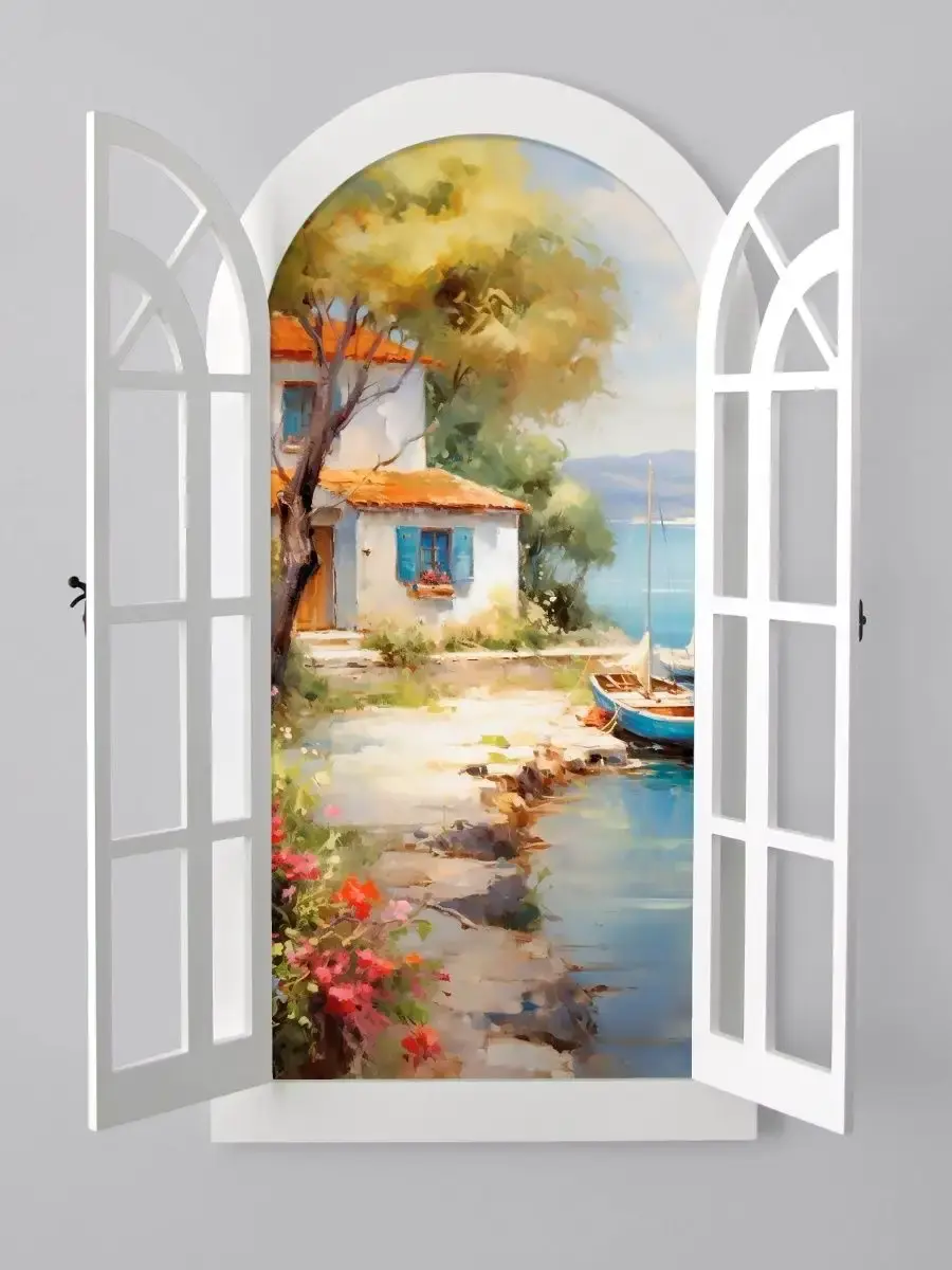 Настенное панно станет идеальным украшение для загородного дома. Рама и ставни изготовлены из мдф 10 мм, покрашены акриловой эмалью на водной основе, цвет белый и молочный (см. в описании цвета). Картина напечатана на бумаге, заламинирована. Размер картины 36х70 см, в развернутом виде 60х70 см. Крепление для стены в комплекте. Изображение менять НЕЛЬЗЯ!