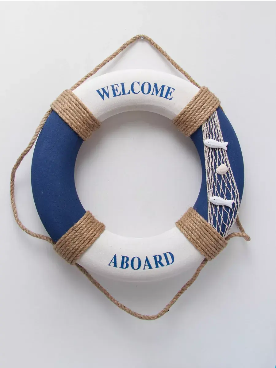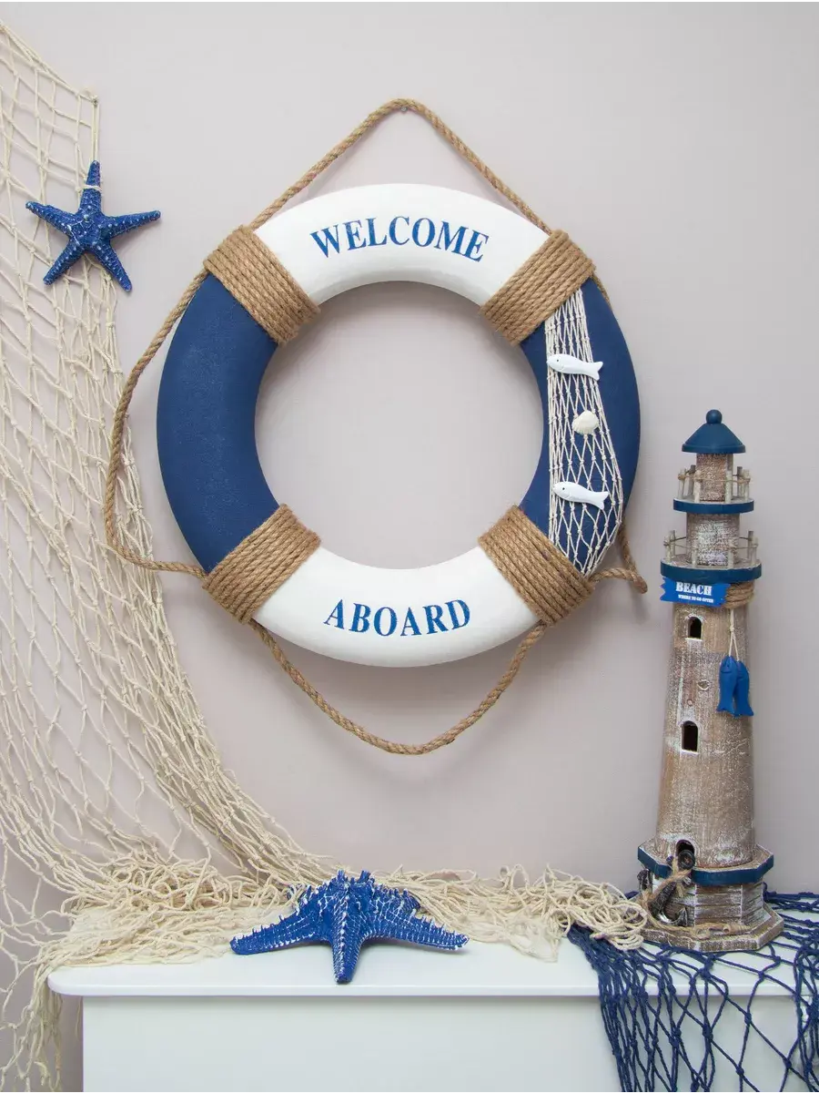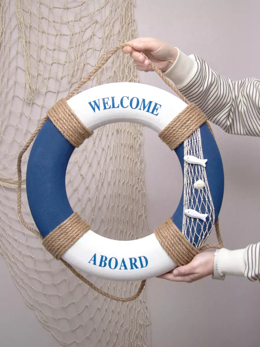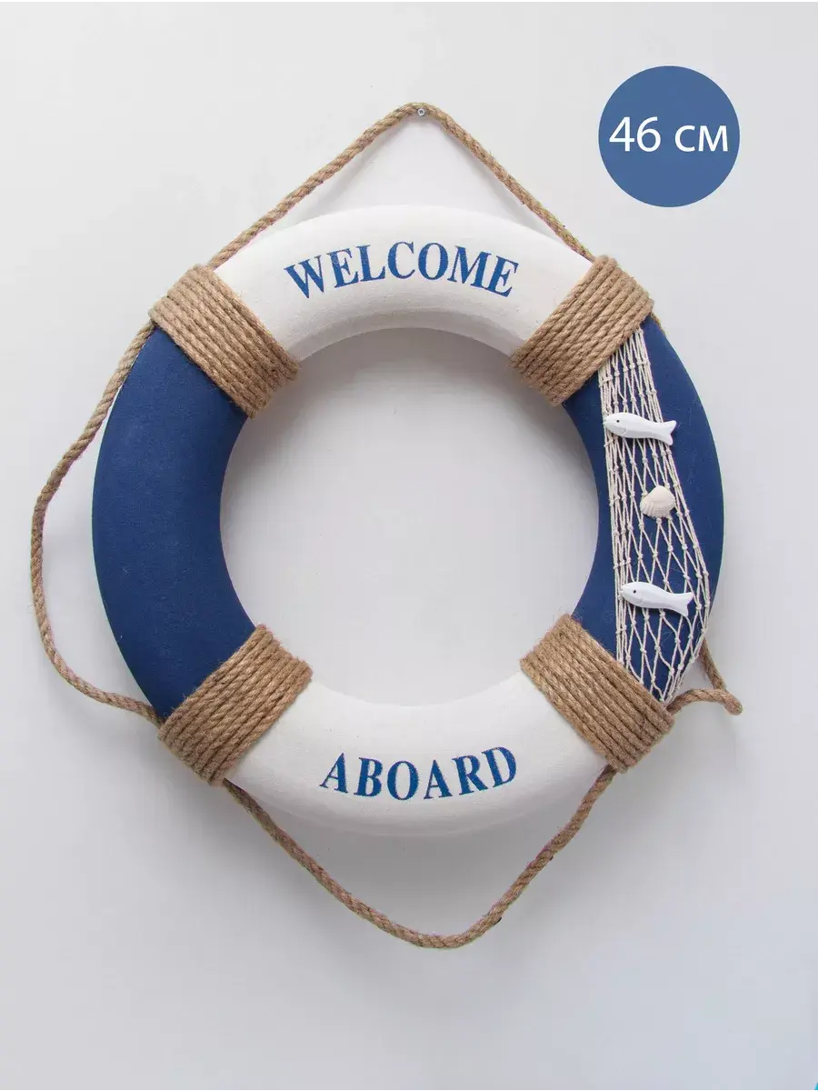 Настенный декор в морской тематике станет прекрасным украшением для детской комнаты или кабинета. Изготовленный вручную, этот элемент интерьера выполнен в виде спасательного круга, что добавляет атмосферу моря и приключений. Декор украшен канатом, что придает ему оригинальный вид и текстуру. Размеры позволят ему гармонично вписаться как в интерьер детского сада, так и в уютное пространство для фото зоны. Панно добавляет веселое настроение и радость в любую комнату. Такой аксессуар не только привлекает внимание, но и создает уникальную атмосферу, способствуя развитию фантазии и воображения у детей. Выбор такого декора позволит легко изменить обстановку и добавить интересные акценты в любой уголок вашего дома. Самая главная комната в доме - детская! Родители стараются сделать детскую комнату максимально уютной, теплой и позитивной. Круг изготовлен из натурального дерева. Диаметр 46 см. Можно дополнить интерьер ванной комнаты в морском стиле. Крепление для стены в комплекте. Множество композиций можно создать с элементами декора в морском стиле от бренда Elenadecor.