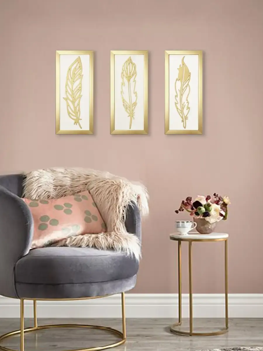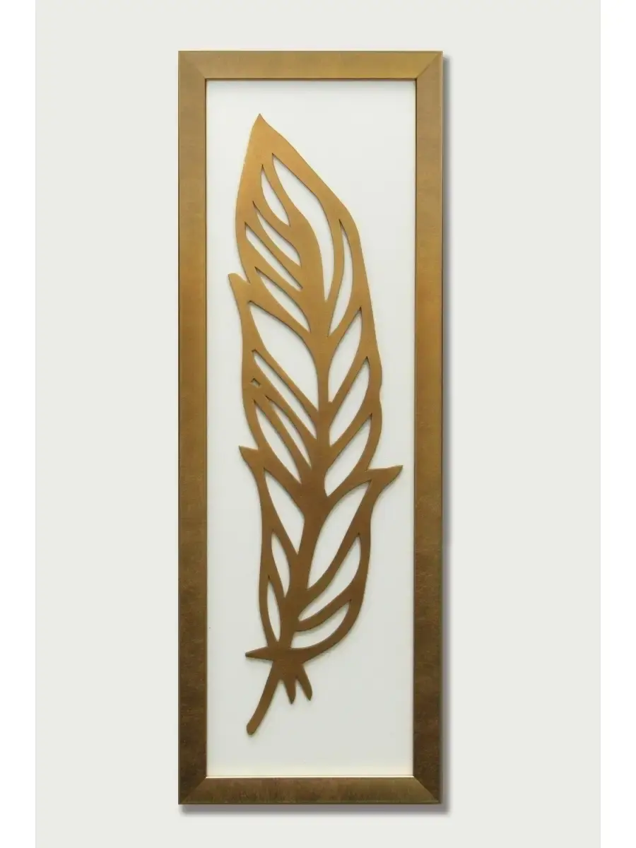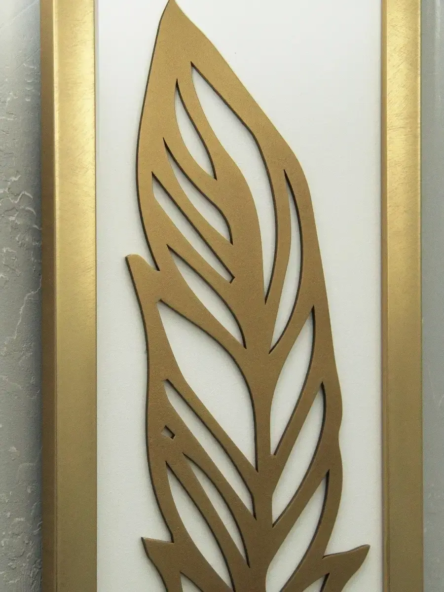 Изысканный настенный декор в современном стиле. Настенный декор для дома это обязательный атрибут для современного интерьера. Объемные настенные панно от бренда HOME GALLERY с резными перьями для уюта дома и офиса. Панно покрыты золотой патиной и оформлено в багет из золотого профиля. Панно подходят для создания композиции из 2х или 3х шт. Размер панно 19х54 см. Крепление для стены в комплекте.