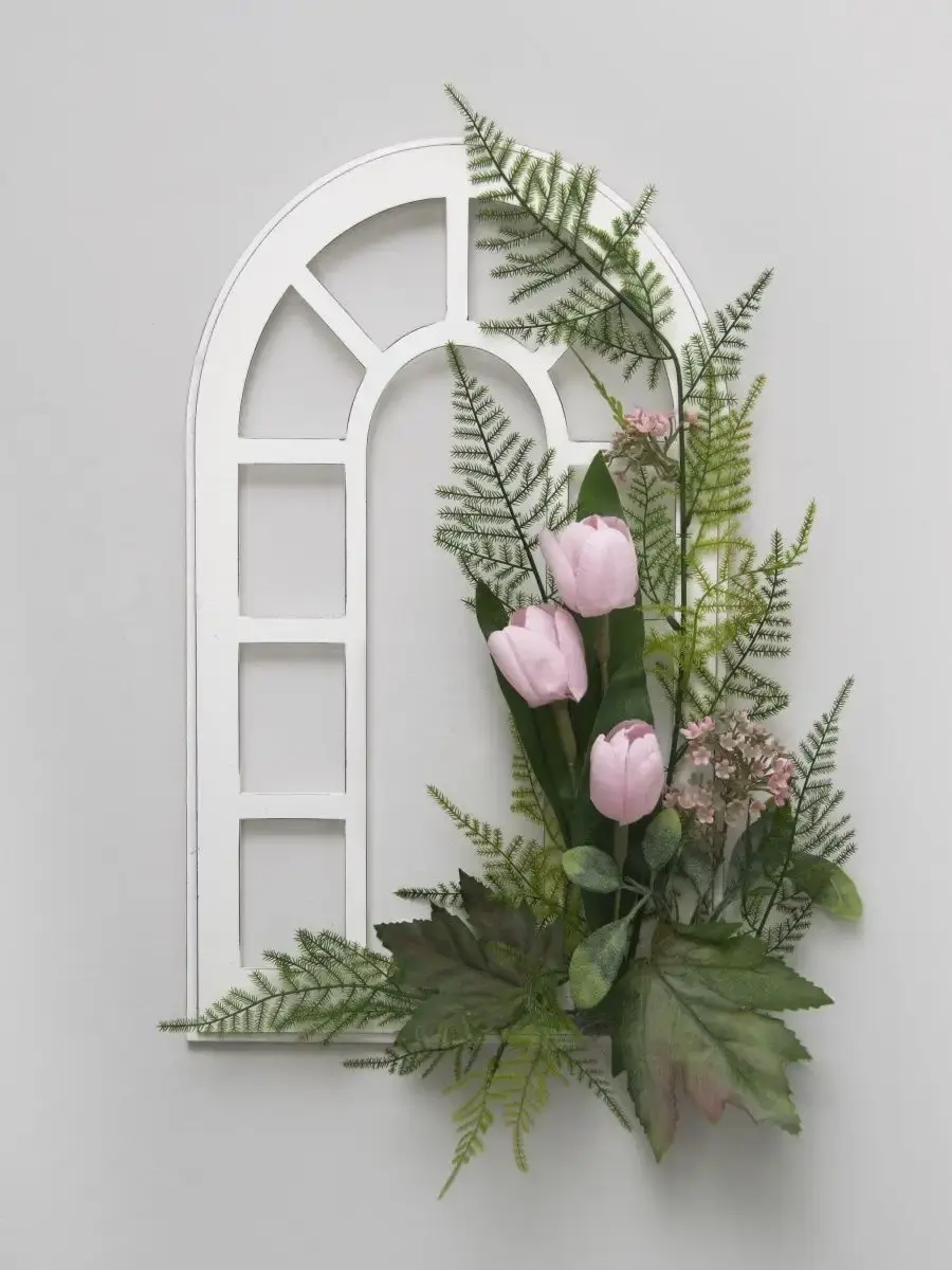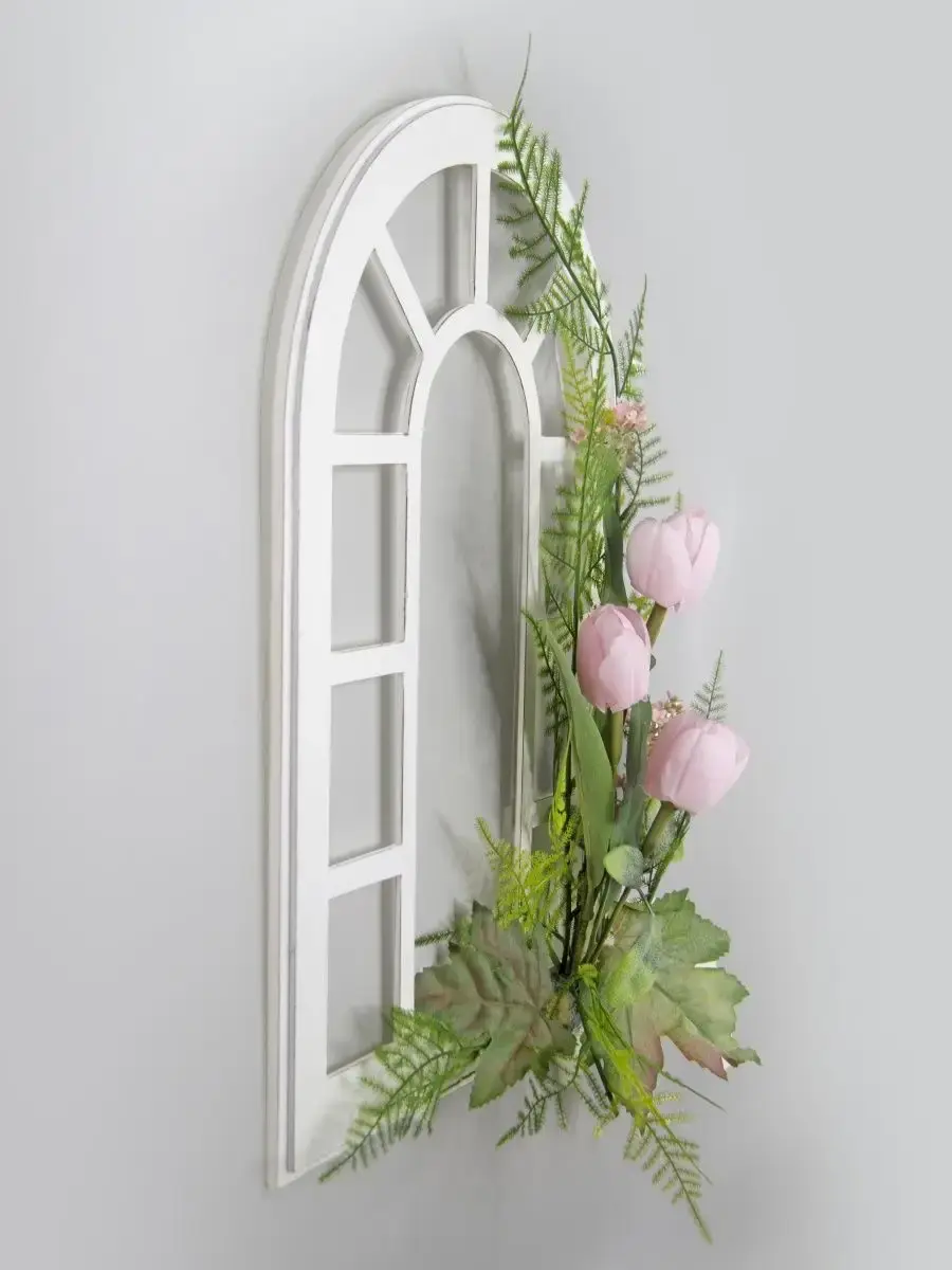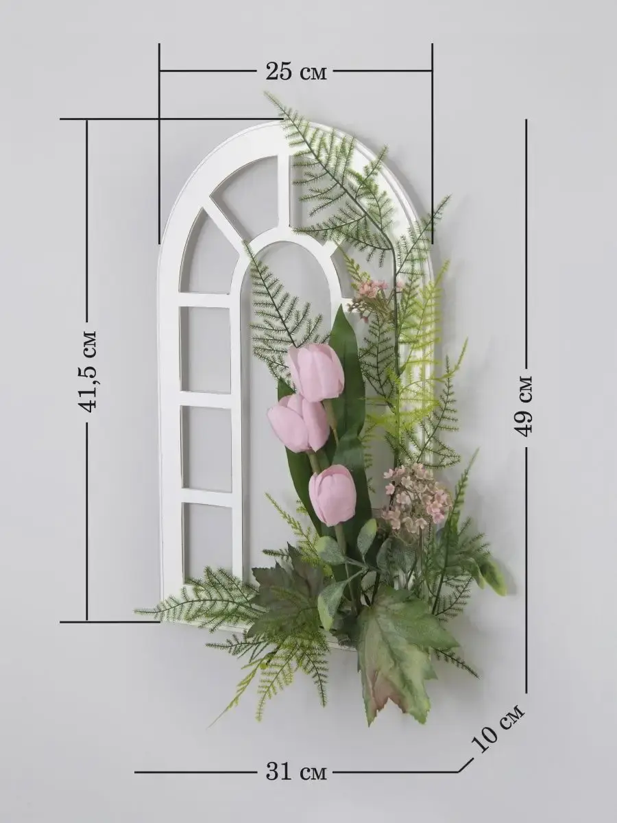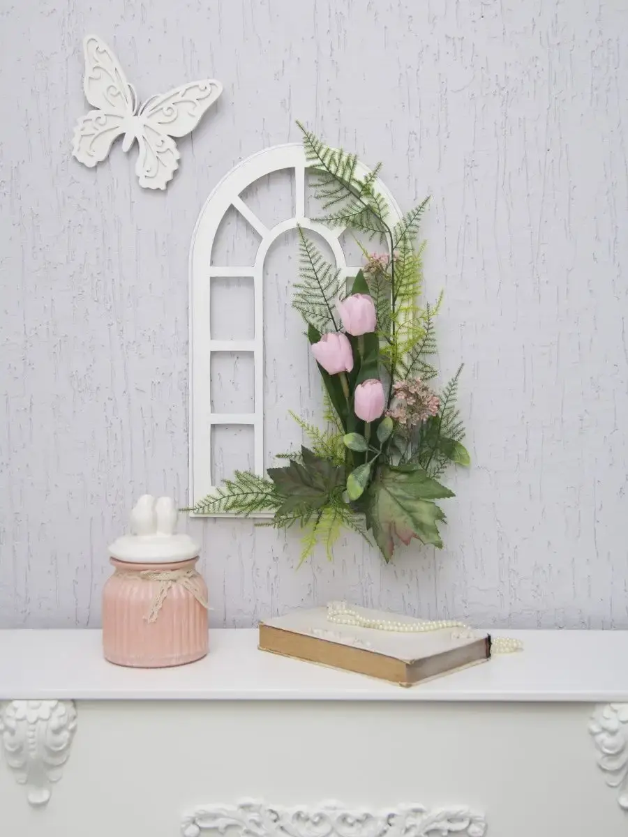 Украшение настенное для интерьера с искусственными интерьерными цветами . Панно с цветами на деревянном окошке, размер окна 25х42 см. Крепление на зубчатый крепеж , саморез для стены в комплекте. Отличное украшение к зеркалу, в прихожей, ванной или для кухни, где живым цветам недостаточно света. Фальш-окно Всегда будут радовать и добавлять уюта в дом. По желанию самостоятельно можно дополнить светодиодными нитями (светодиодной гирляндой). Уход : обдуть феном, протирать влажной тканью , обработать антистатиком..