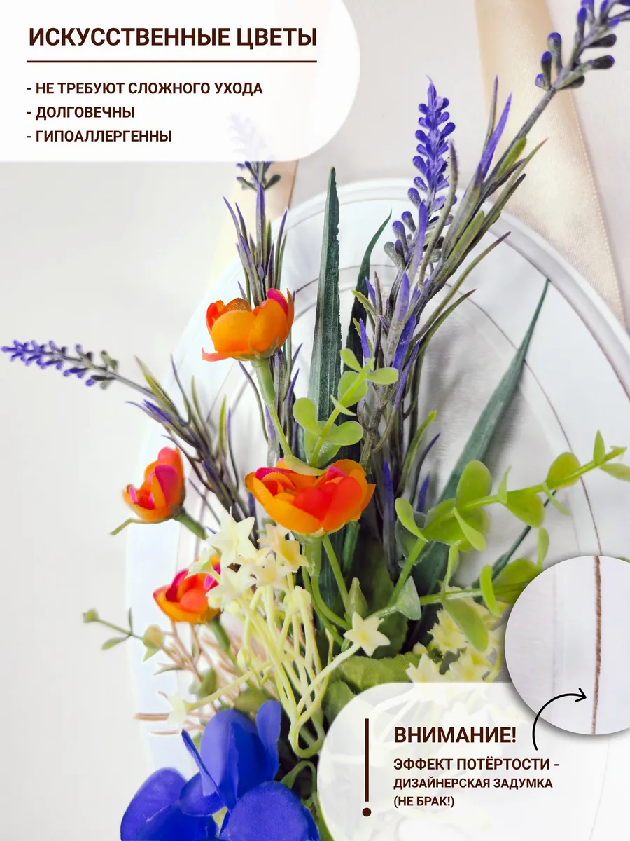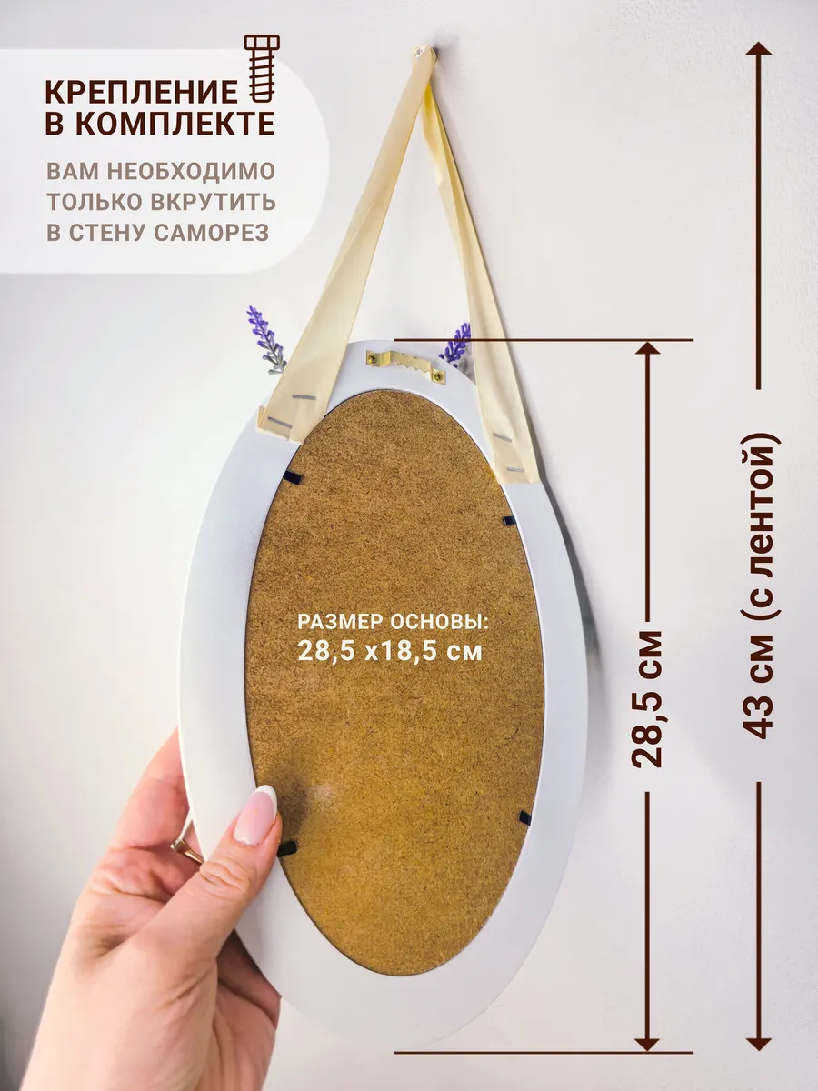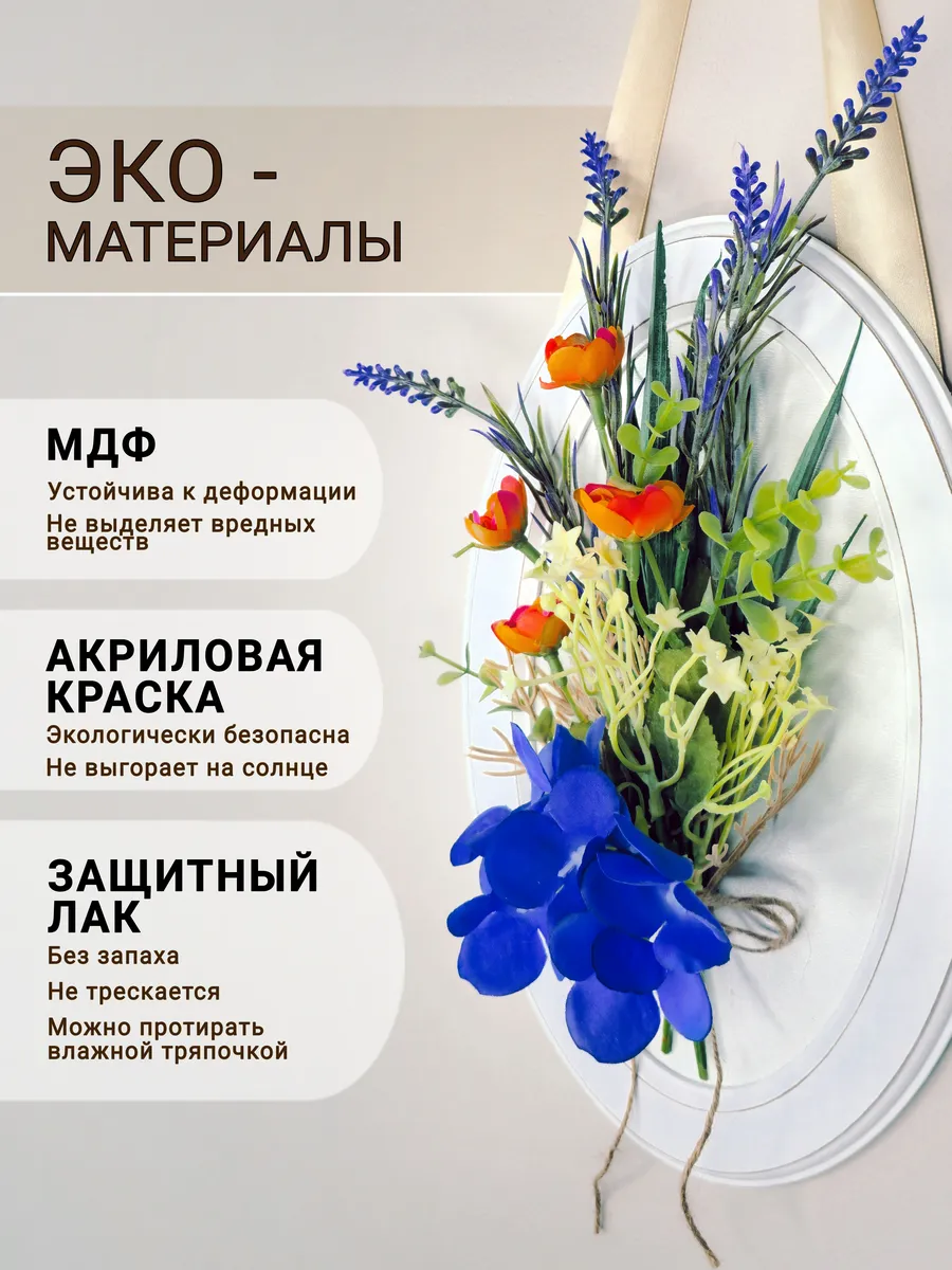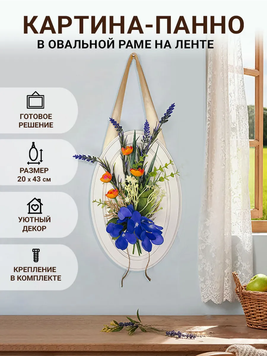 Эффектное настенное панно с яркой цветочной композицией станет стильным акцентом в интерьере дома, дачи или уютного кафе. Белая овальная рама в сочетании с мягкой атласной лентой придаёт декору аккуратный и завершённый вид. Размер панно 20*42 см