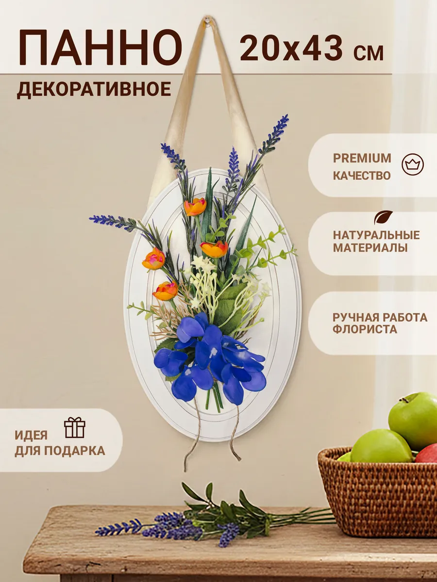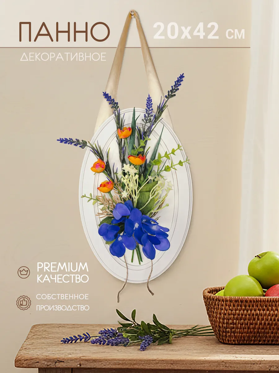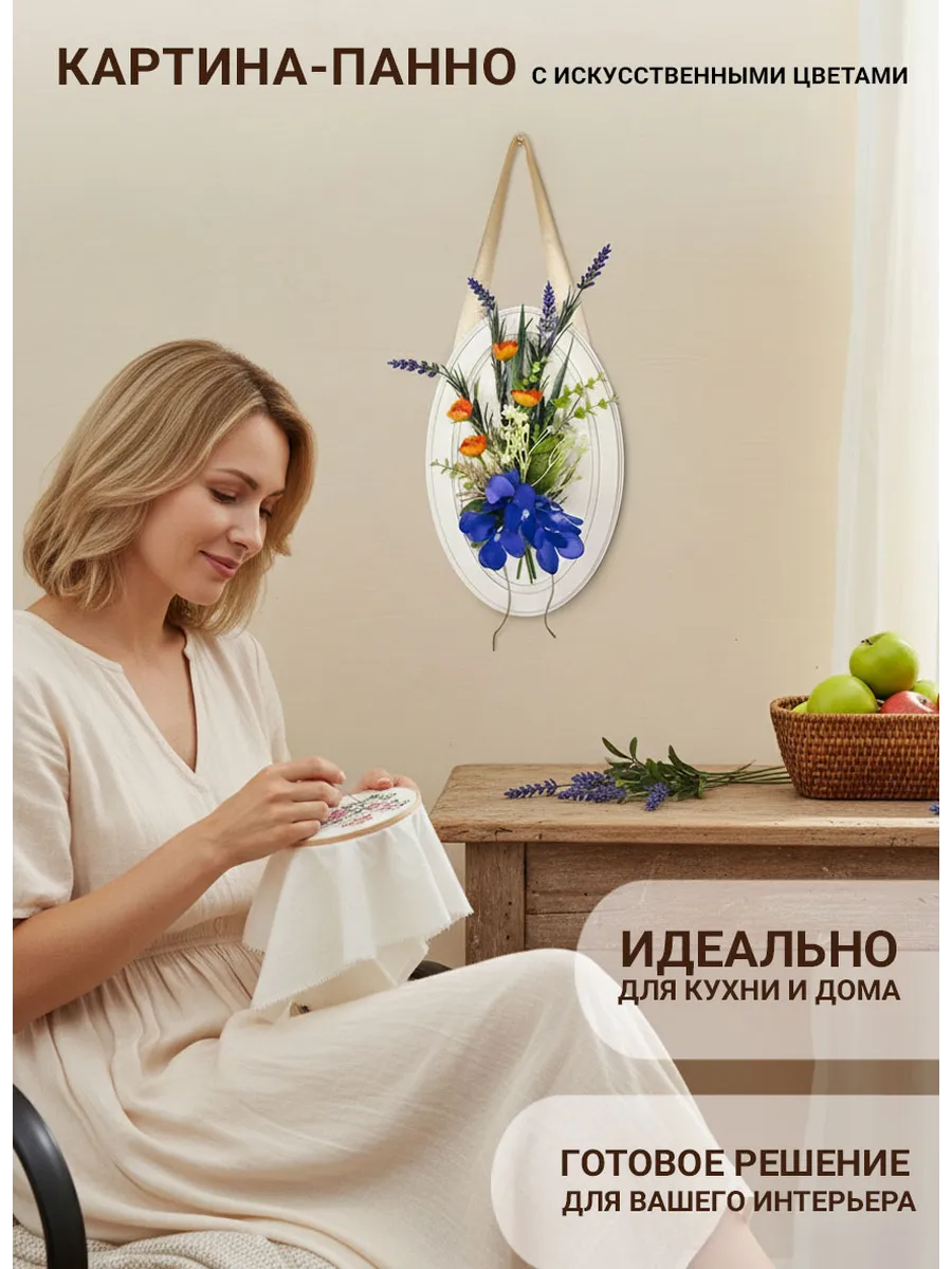 В композиции гармонично сочетаются насыщенные синие цветы, яркие оранжевые бутоны, нежная лаванда и натуральная зелень. Контрастные оттенки делают панно выразительным, но при этом универсальным для разных стилей интерьера.