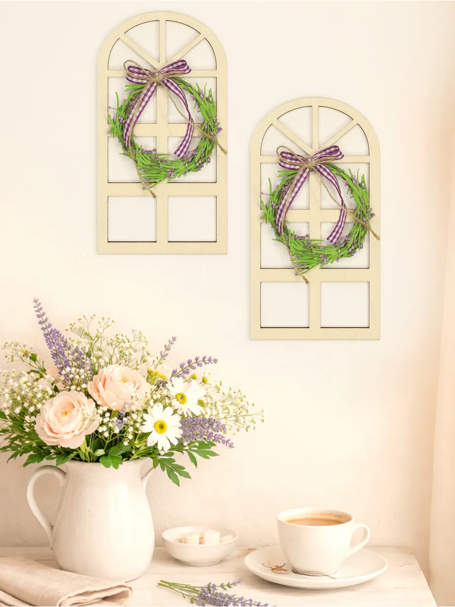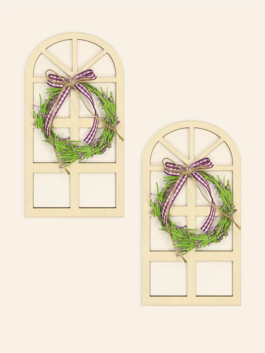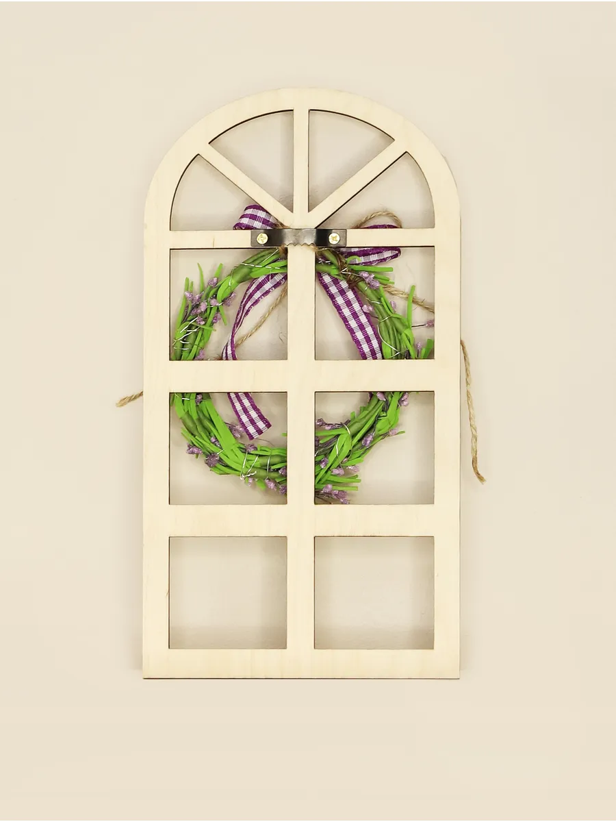 Два маленьких декоративных окошка с веночками из лаванды для декора стен. Панно изготовлены из березовой фанеры, без покрытия, задекорированы ленточками и веточками лаванды. Размеры окошек 12*21 см. Крепление для стены в комплекте. Украшение для интерьера в стиле Прованс и шебби-шик.