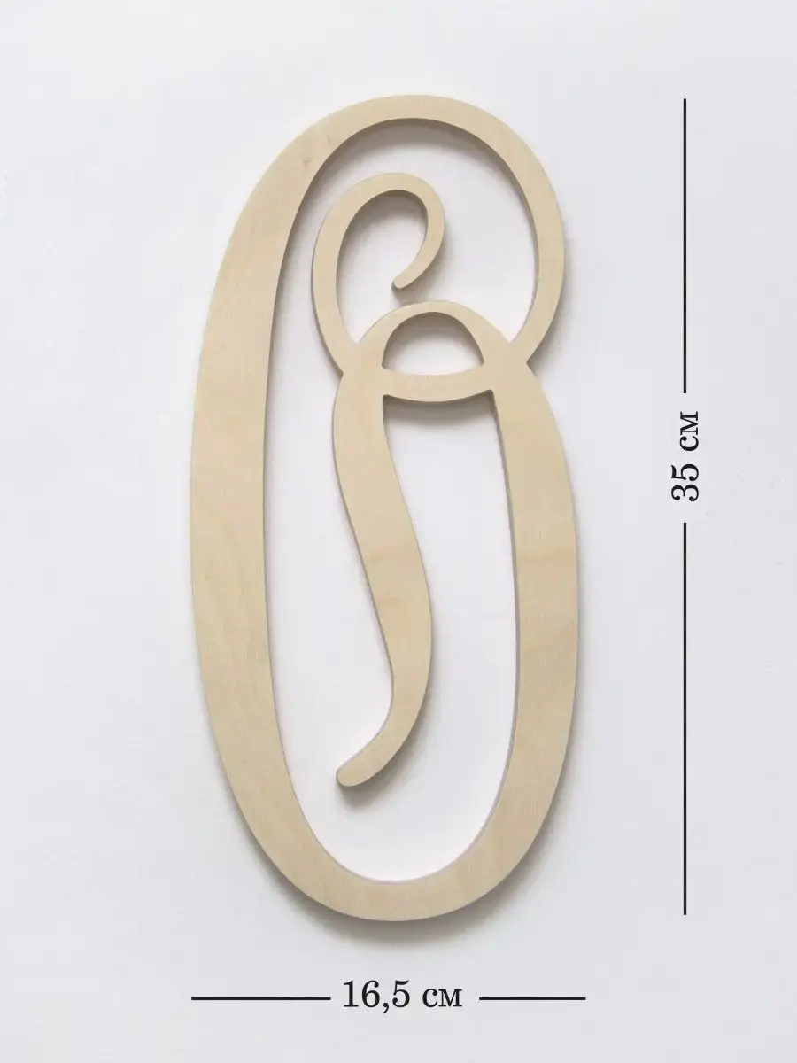 Изготовлена из березовой фанеры толщиной 19 мм, не окрашена, что позволяет придать буквам индивидуальность. Можно покрыть лаком, морилкой, акриловой краской на ваш вкус. Высота букв 33-35 см, ширина, соответственно, 29-35 см