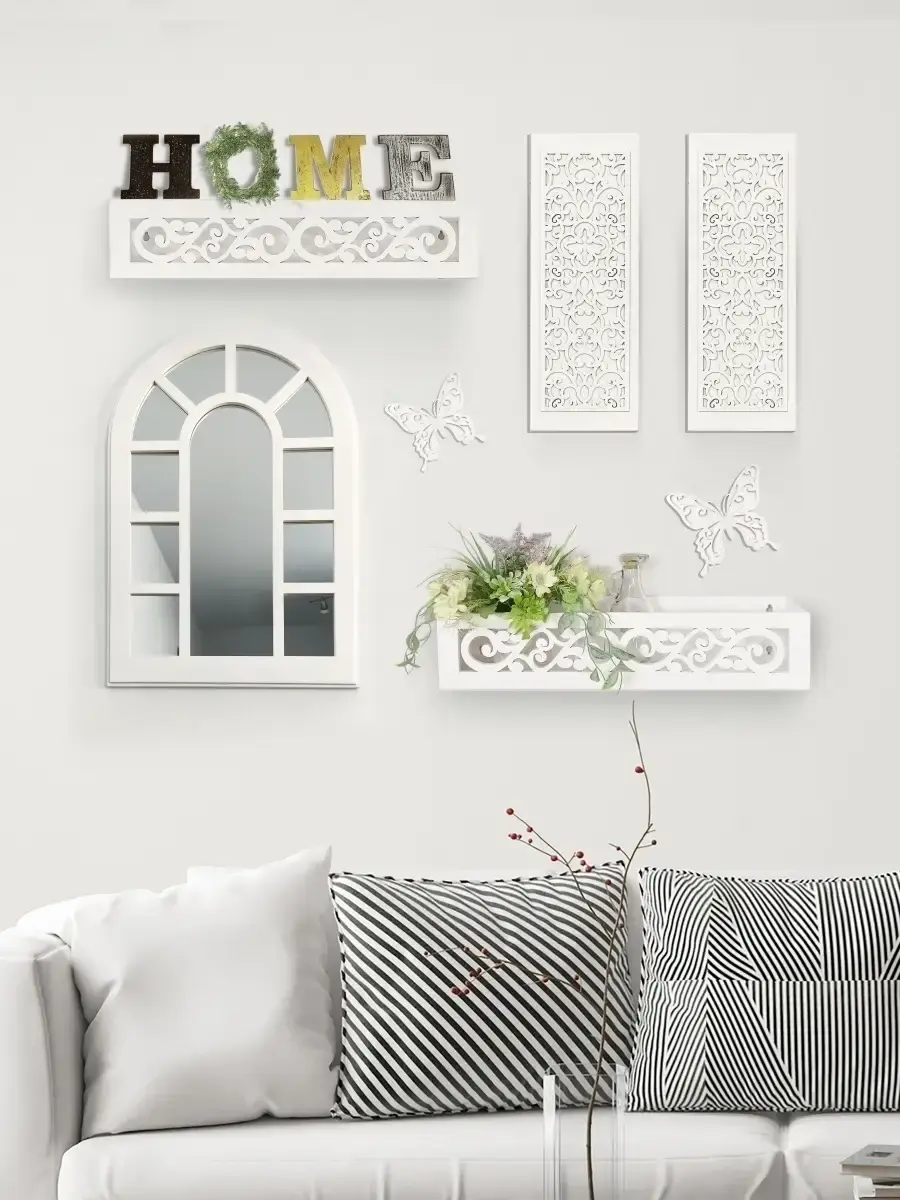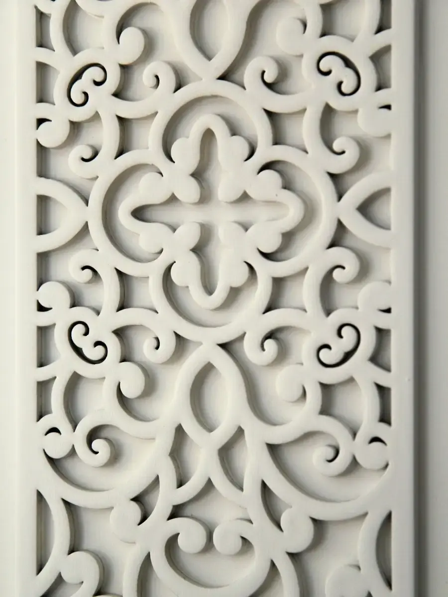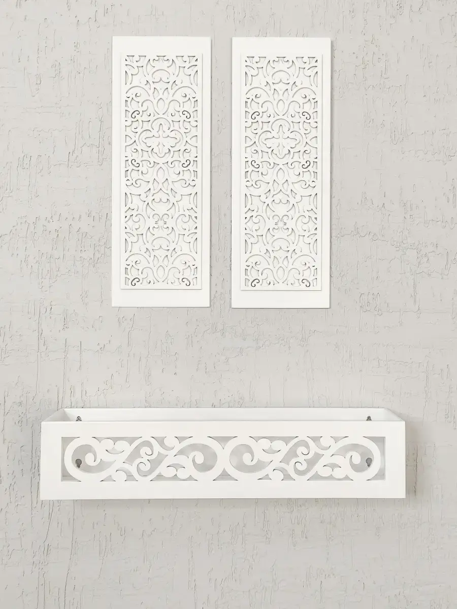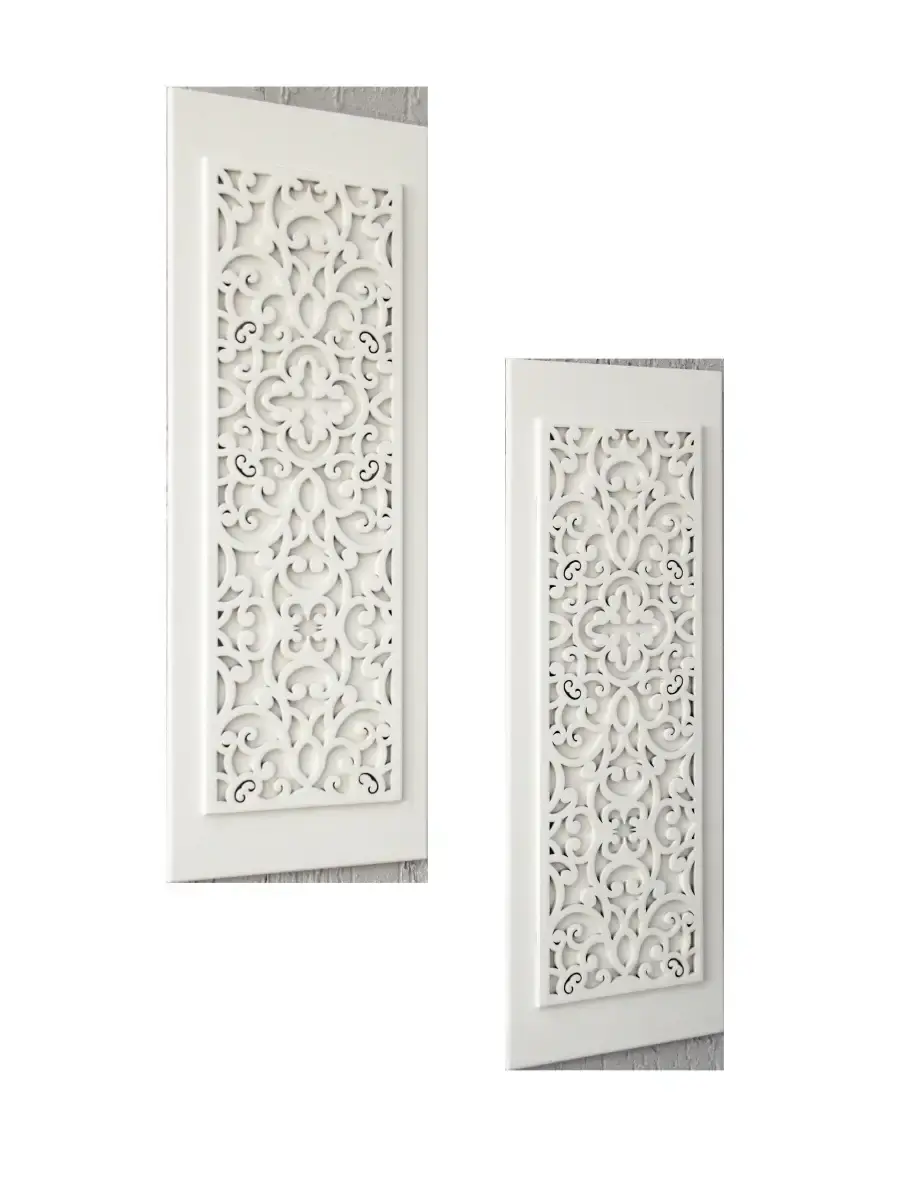 Два настенных деревянных панно с объемным узором. Арт-объект для Вашего интерьера в современном стиле. Размер одного панно 18х48см. Настенный декор выполнен из фанеры, покраска акриловой эмалью на водной основе с эффектом старения. Настенный декор можно комбинировать с квадратным панно, словами и полками в раме. Крепление для стены в комплекте. Крепления для стены в комплекте.