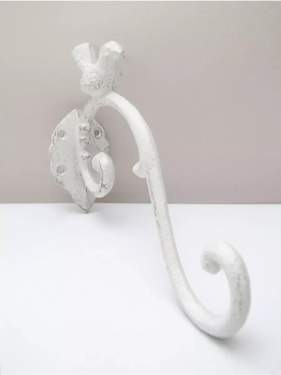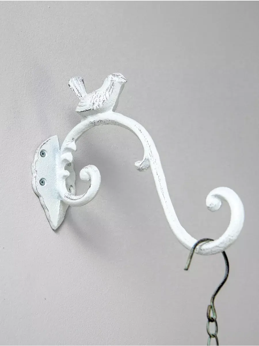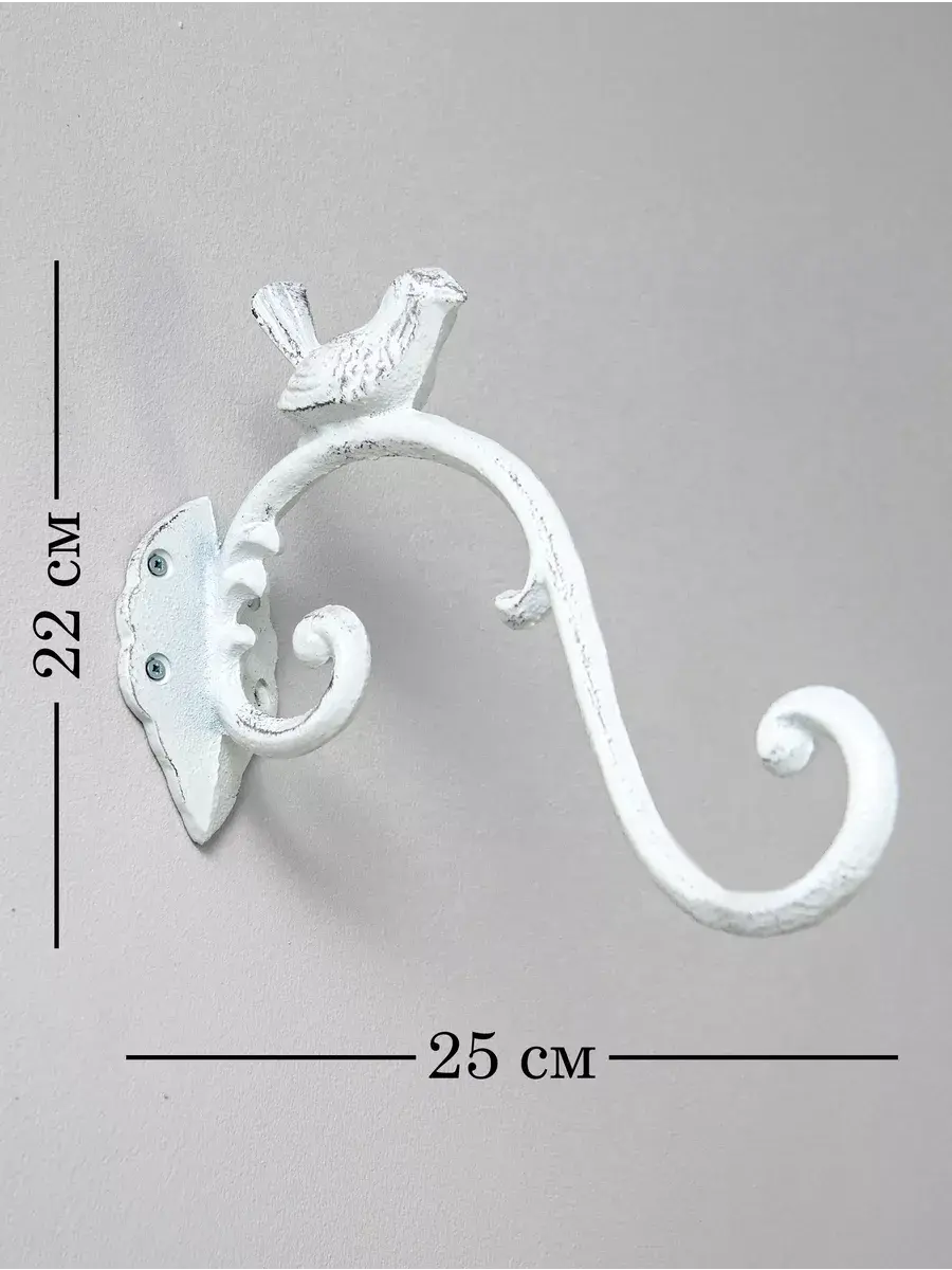Держатель для кашпо белого цвета с бежевой патиной, украшен птичкой, размер крючка 22*25 (см фото).
