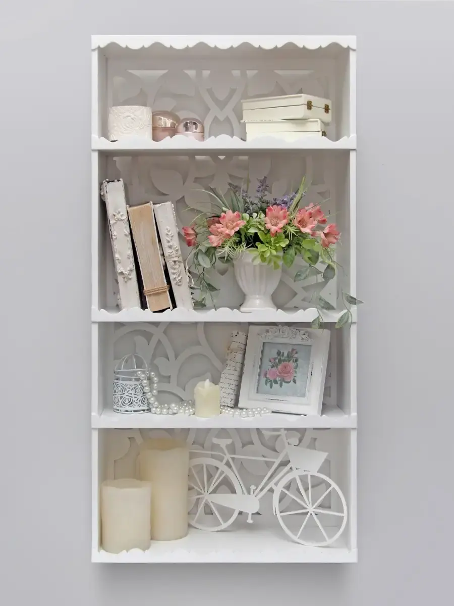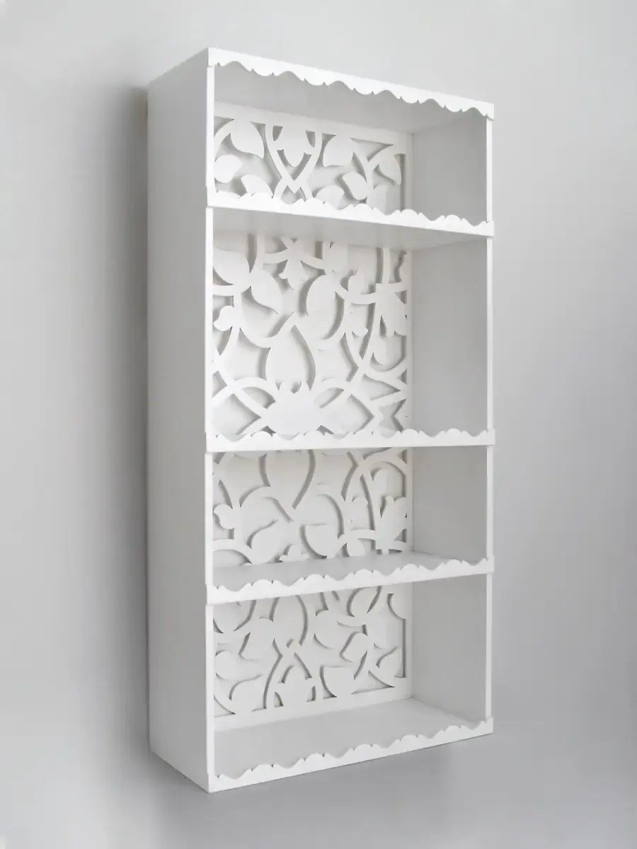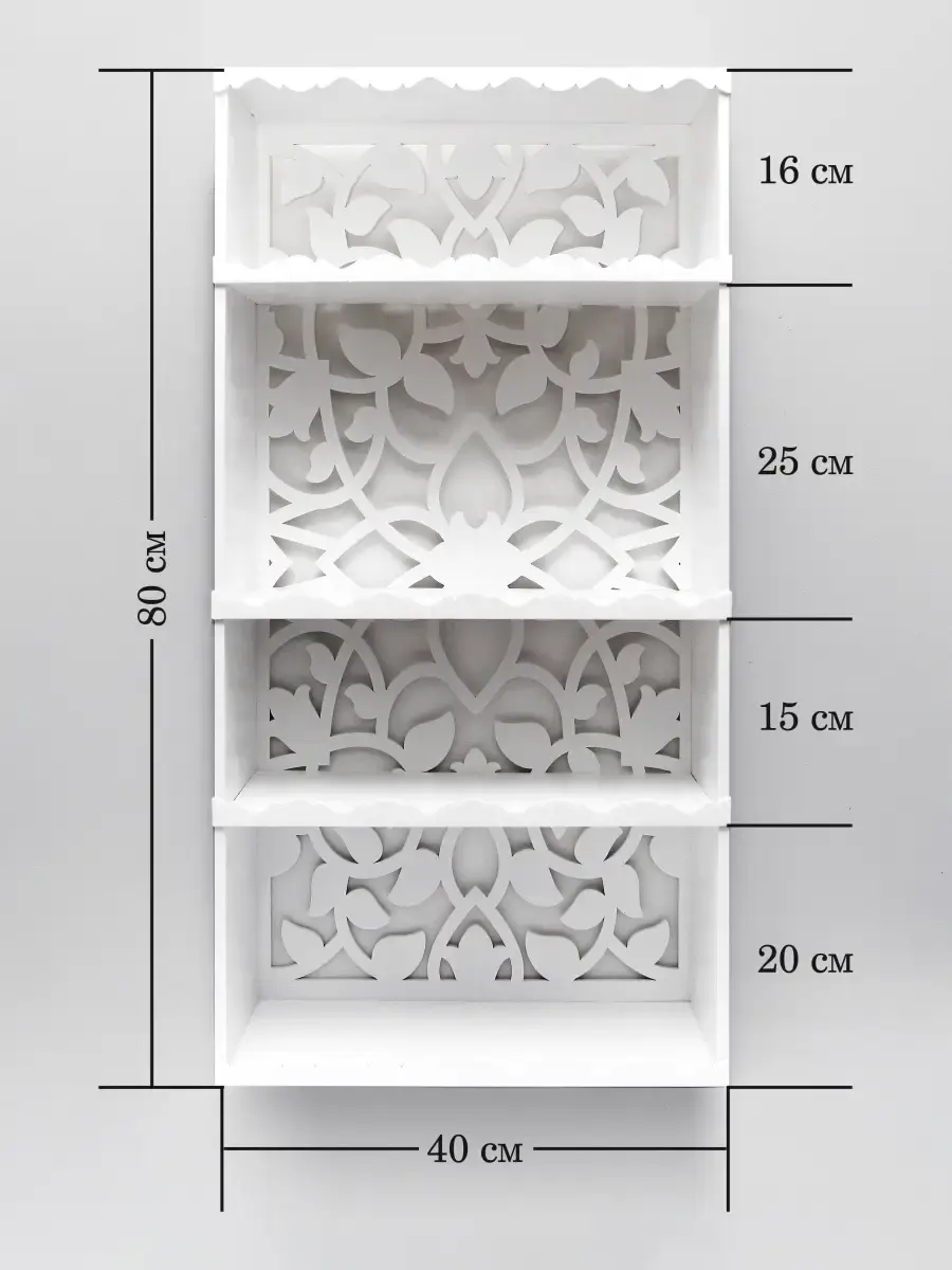 Полка-органайзер с ажурной резной спинкой. Изготовлена из высококачественной шлифованной березовой фанеры. Размер полки 80х40х16 см. Расстояние между полками сверху вниз: 16, 25, 15, 20 см.Ширина полки 15 см.