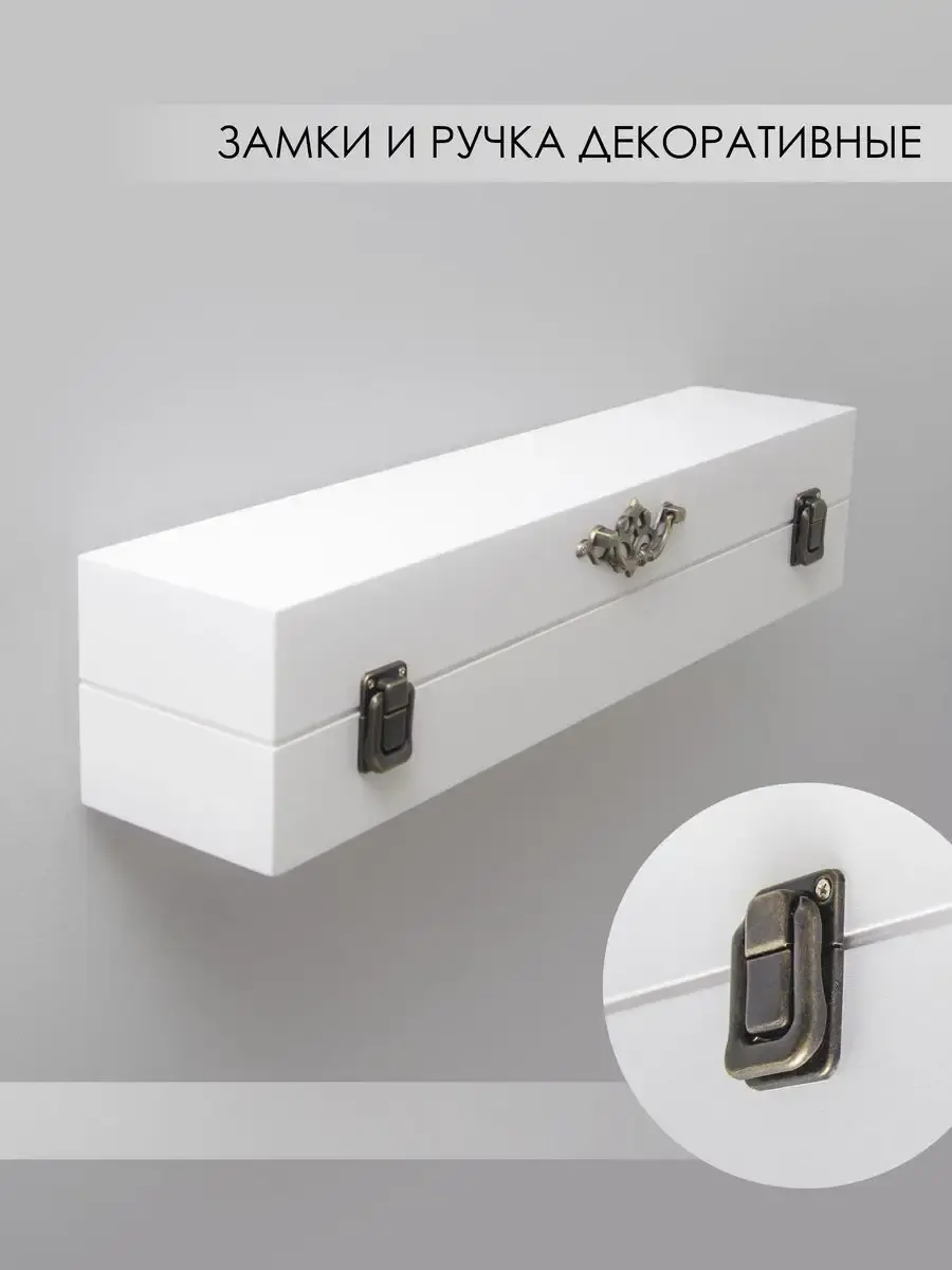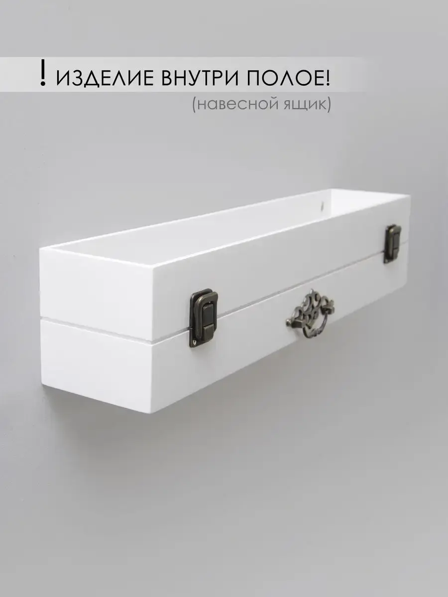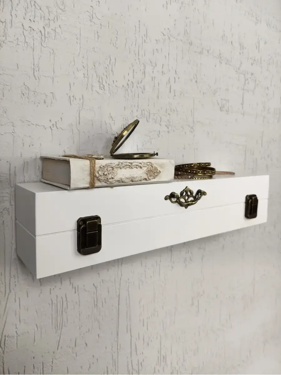 Декоративная настенная деревянная полка "Сундук". Очень красивую композицию можно создать из нескольких полок. Покрашена акриловой эмалью на водной основе. Фурнитура декоративная, полка не открывается.Крепления для стены в комплекте.Размер полки 49х10х11 см.