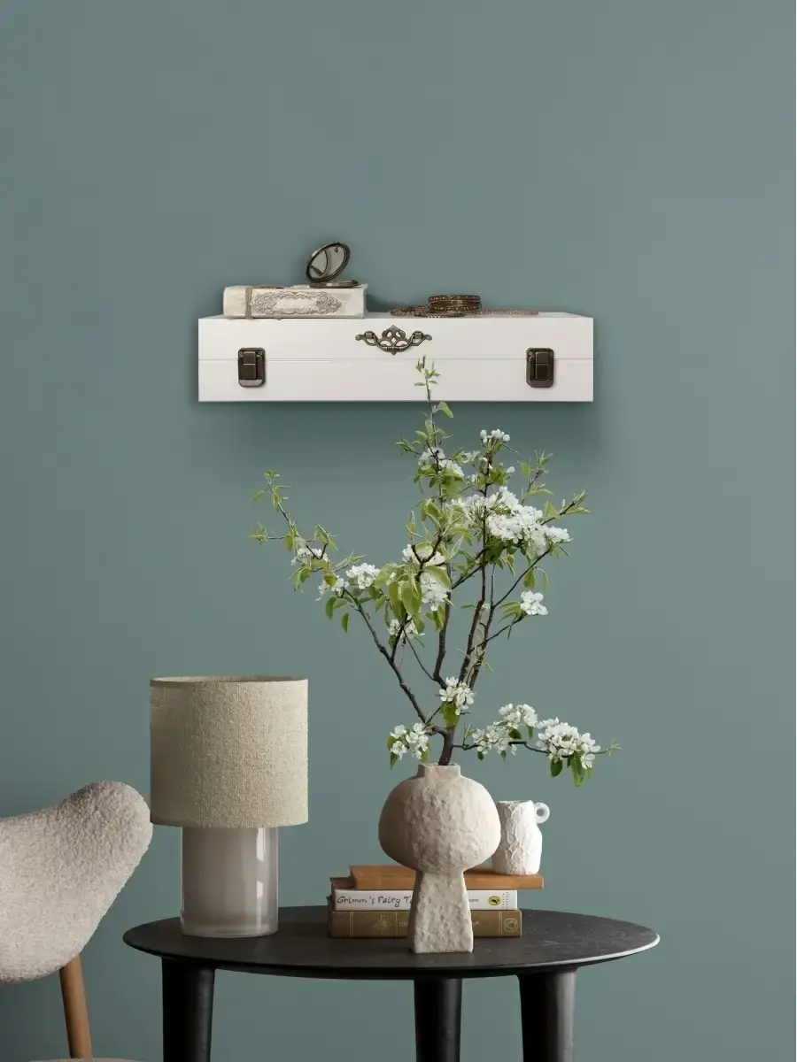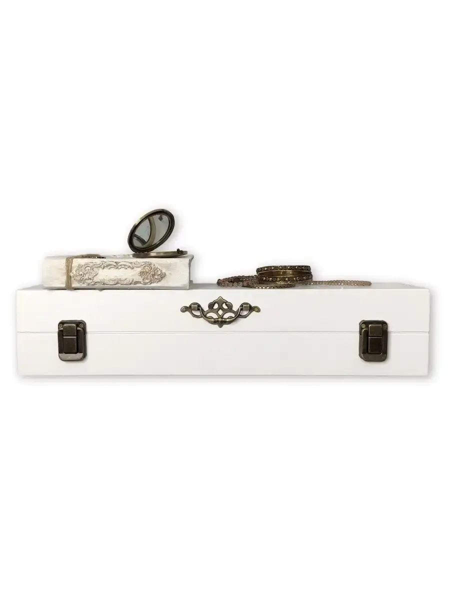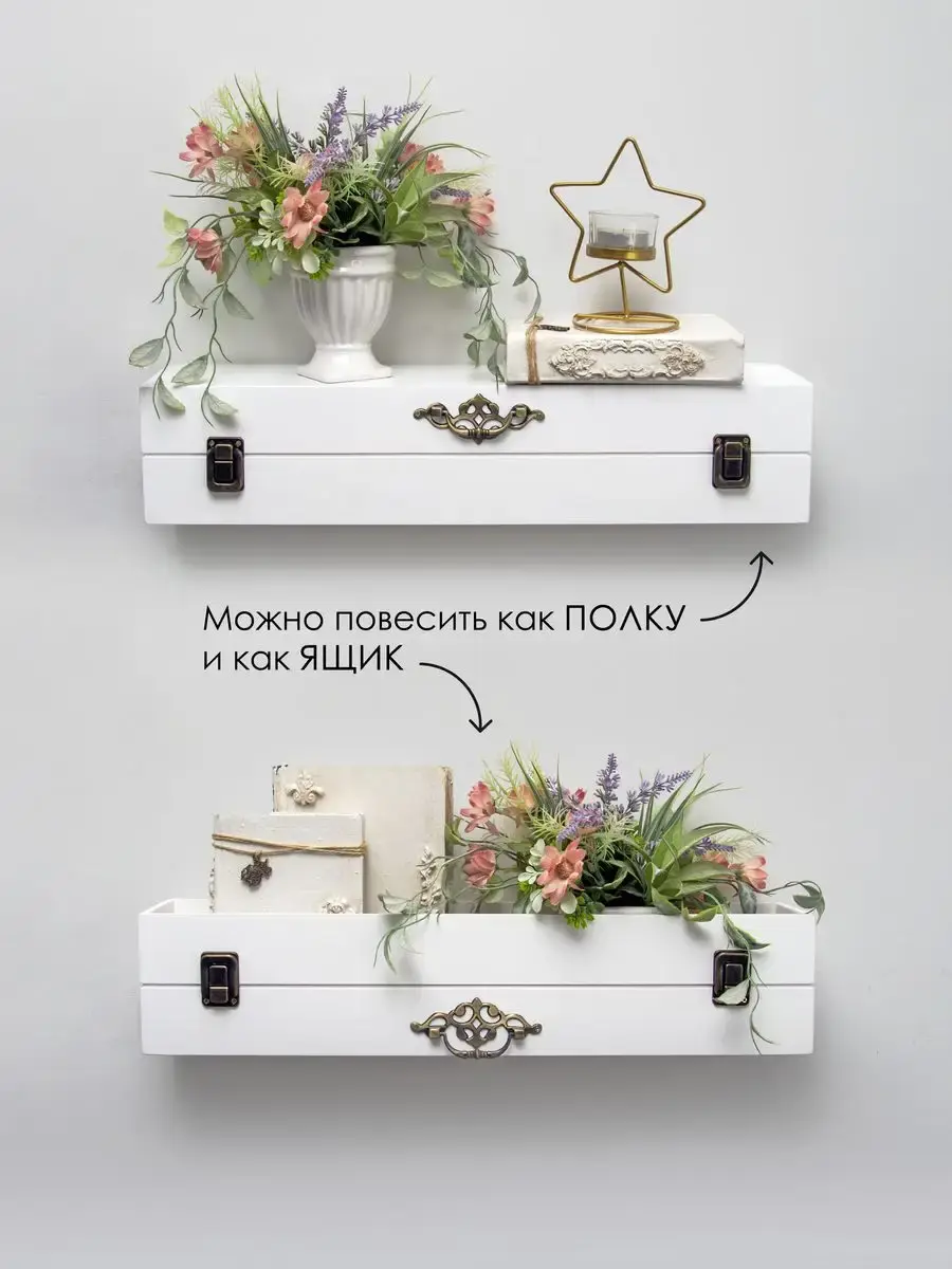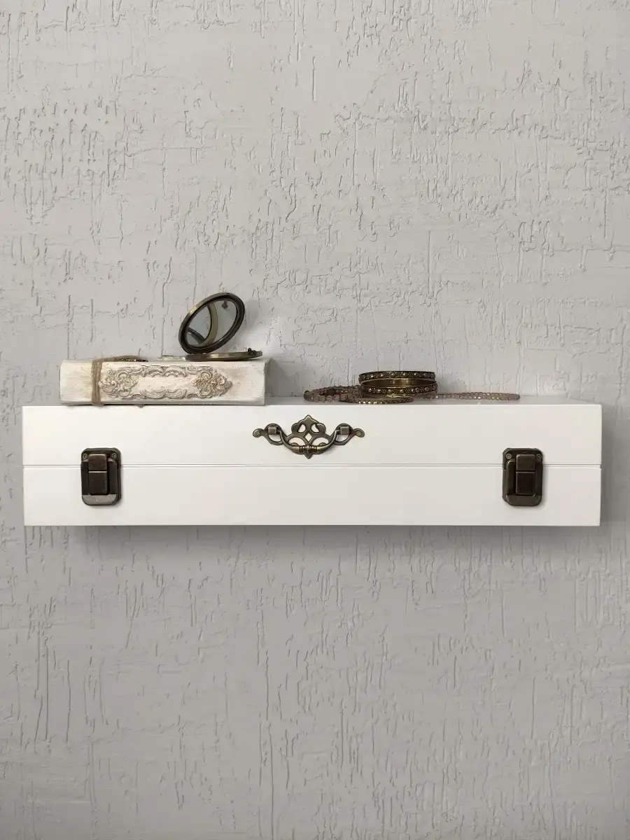 Декоративная настенная деревянная полка "Сундук". Очень красивую композицию можно создать из нескольких полок. Покрашена акриловой эмалью на водной основе. Фурнитура декоративная, полка не открывается.Крепления для стены в комплекте.Размер полки 49х10х11 см.