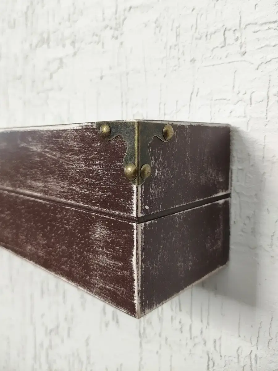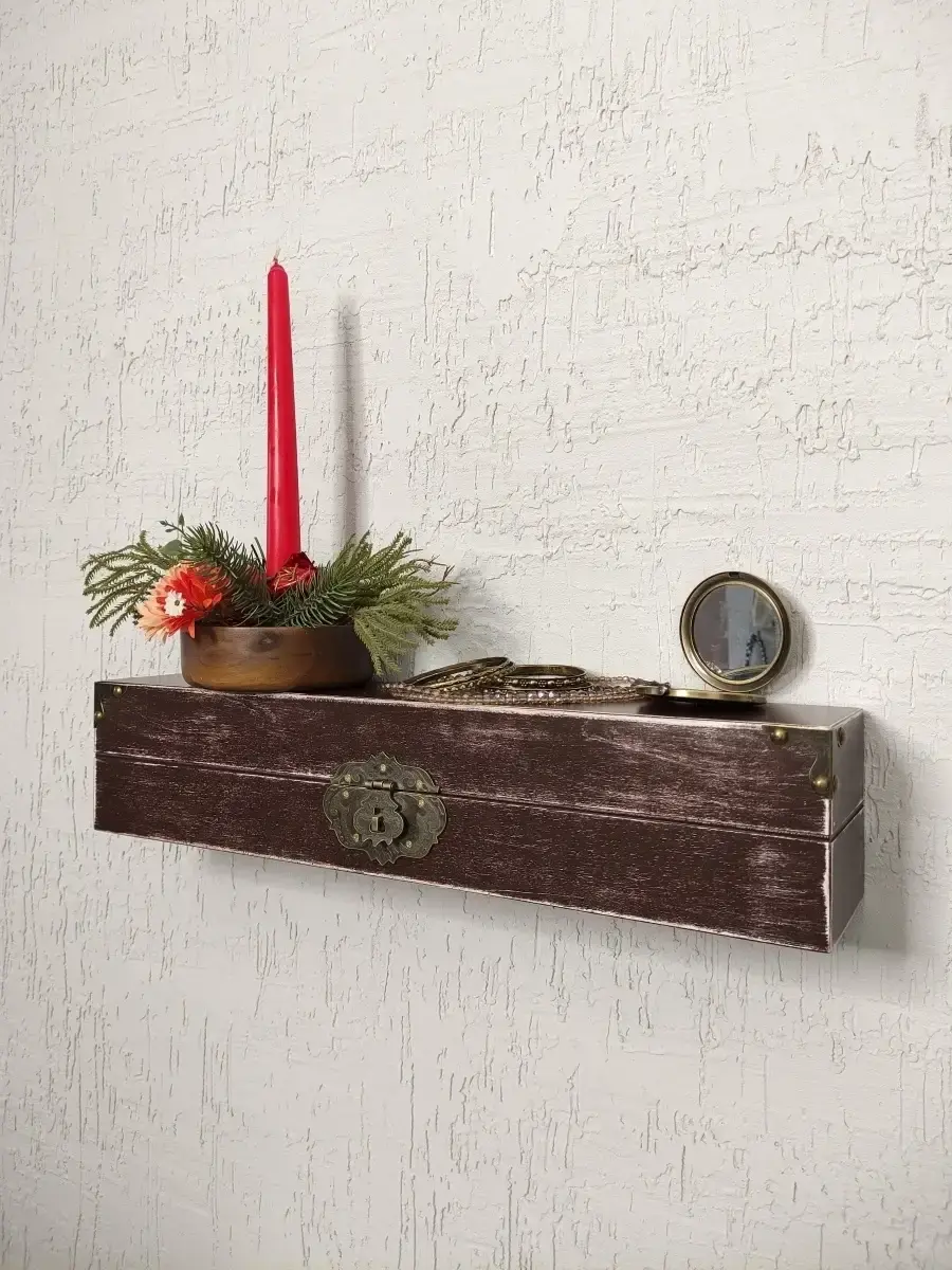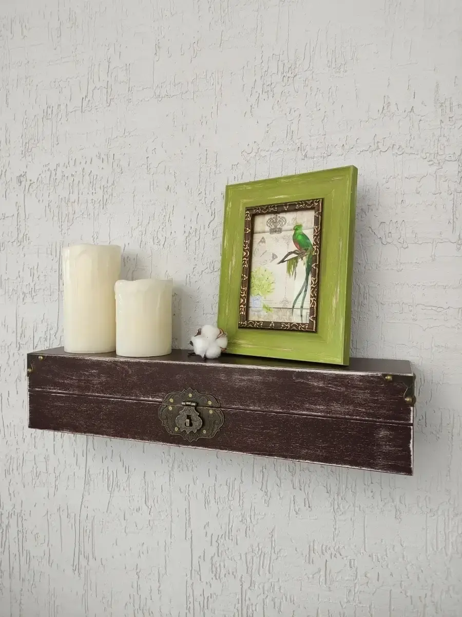 Декоративная настенная деревянная полка "Сундук". Очень красивую композицию можно создать из нескольких полок. Покрашена акриловой эмалью на водной основе. Фурнитура декоративная, полка не открывается.Крепления для стены в комплекте.Размер полки 49х10х11 см.