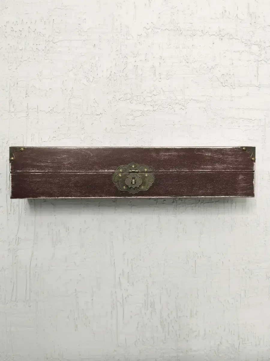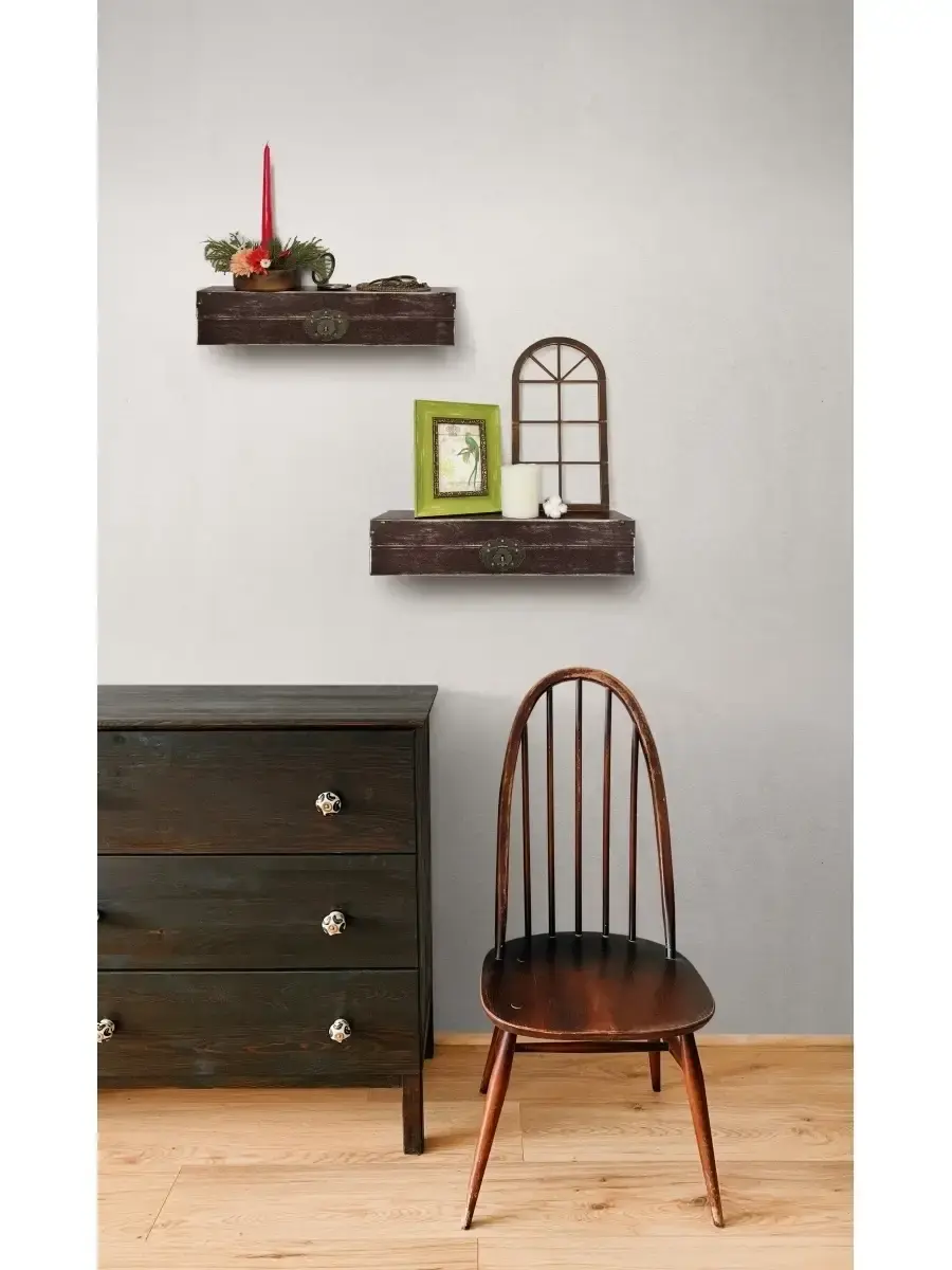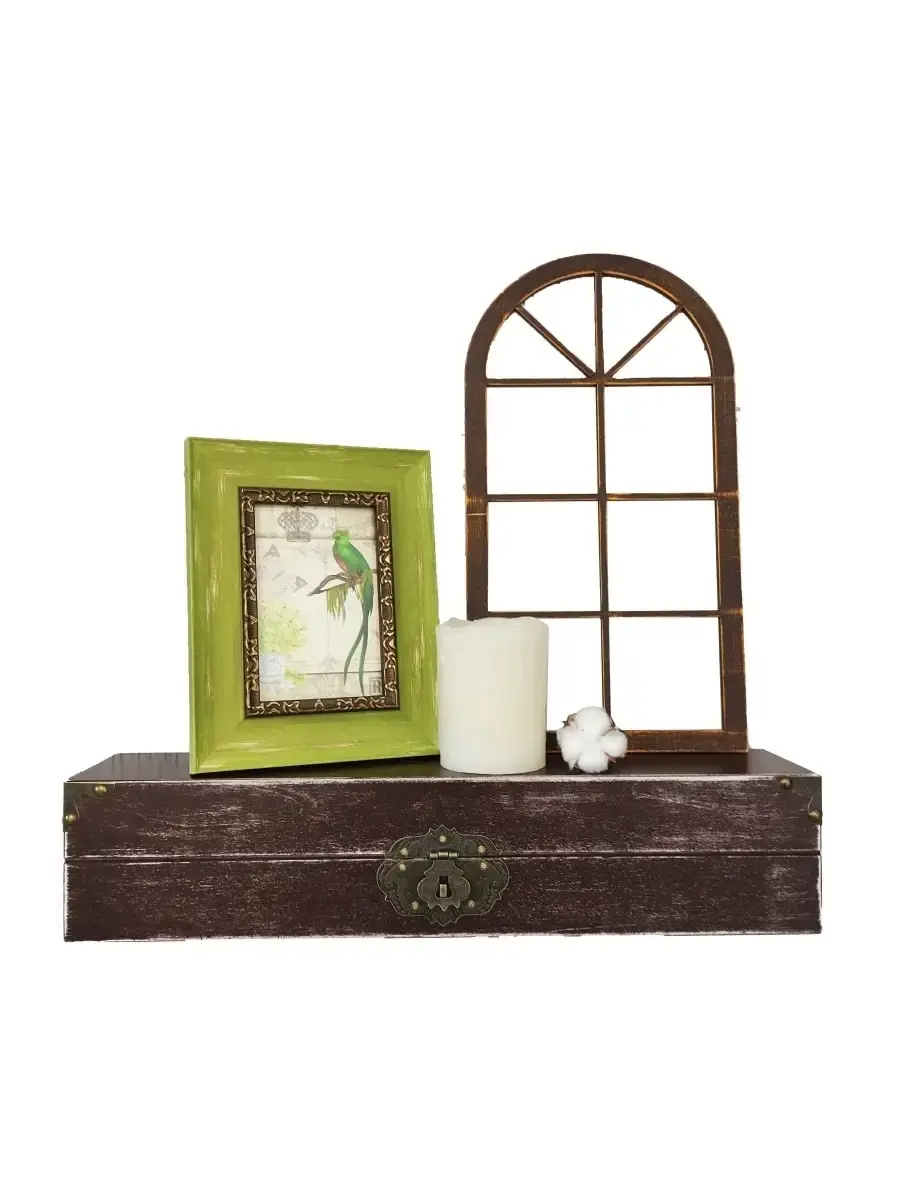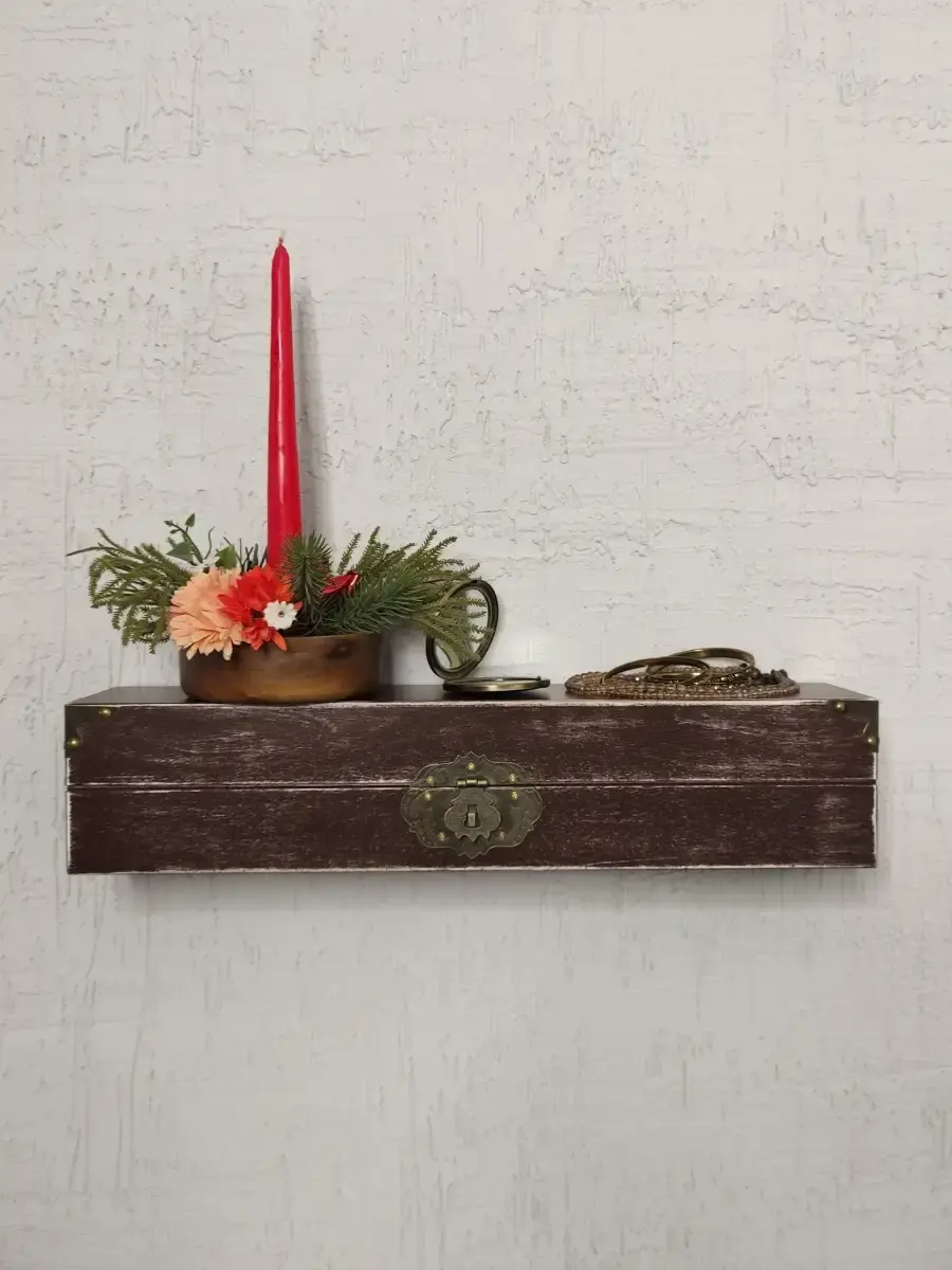 Декоративная настенная деревянная полка "Сундук". Очень красивую композицию можно создать из нескольких полок. Покрашена акриловой эмалью на водной основе. Фурнитура декоративная, полка не открывается.Крепления для стены в комплекте.Размер полки 49х10х11 см.
