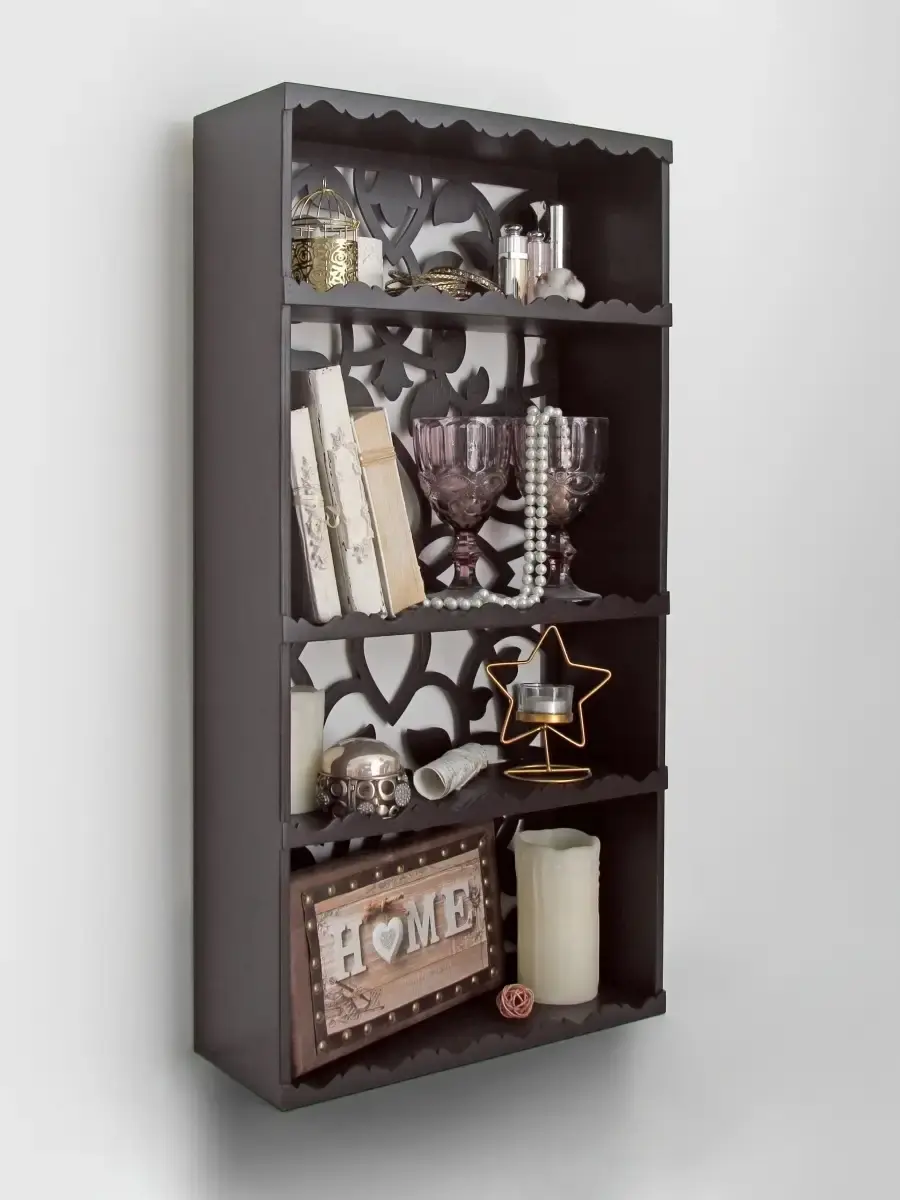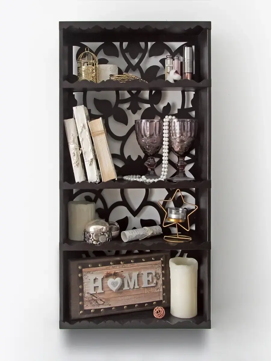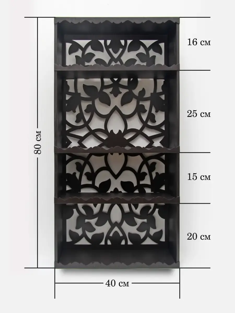 Полка-органайзер с ажурной резной спинкой. Изготовлена из высококачественной шлифованной березовой фанеры. Размер полки 80х40х16 см. Расстояние между полками сверху вниз: 16, 25, 15, 20 см.Ширина полки 15 см.