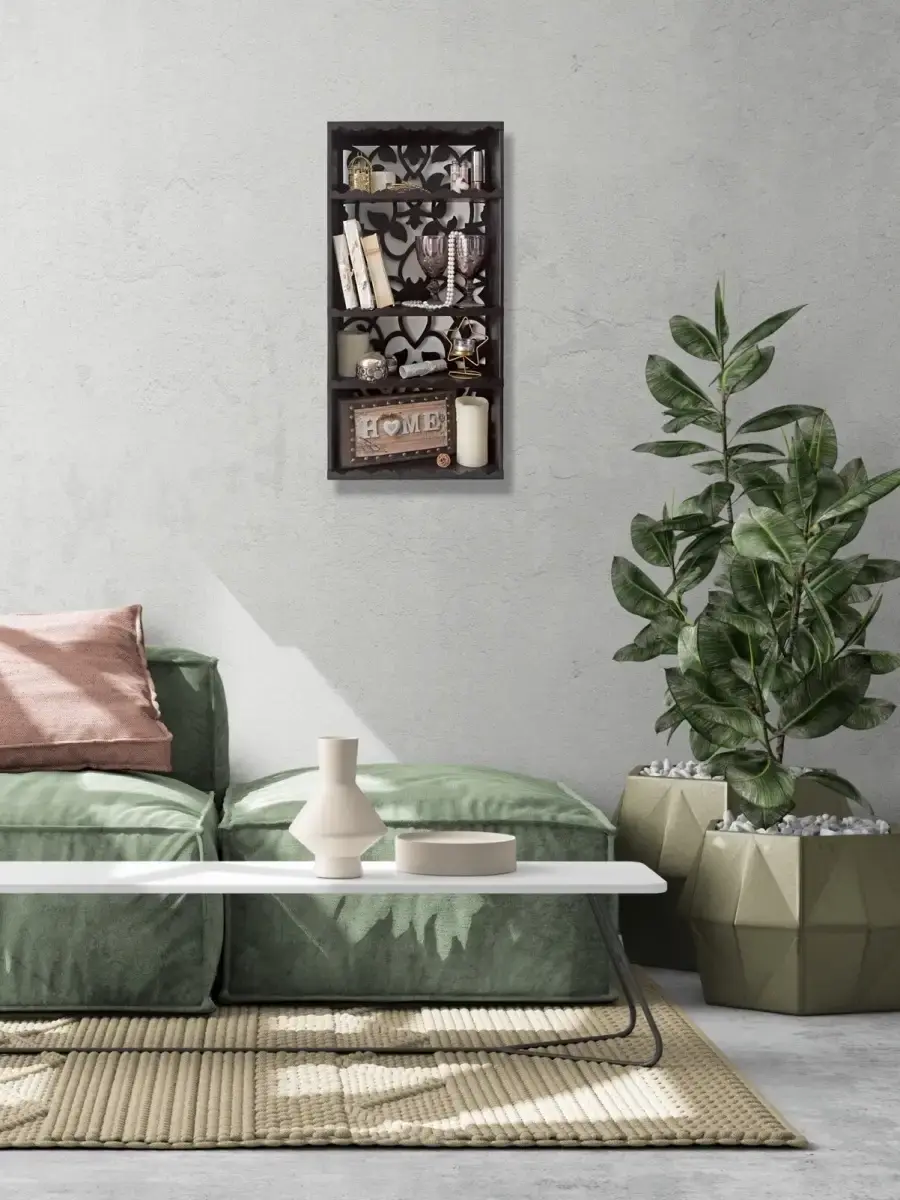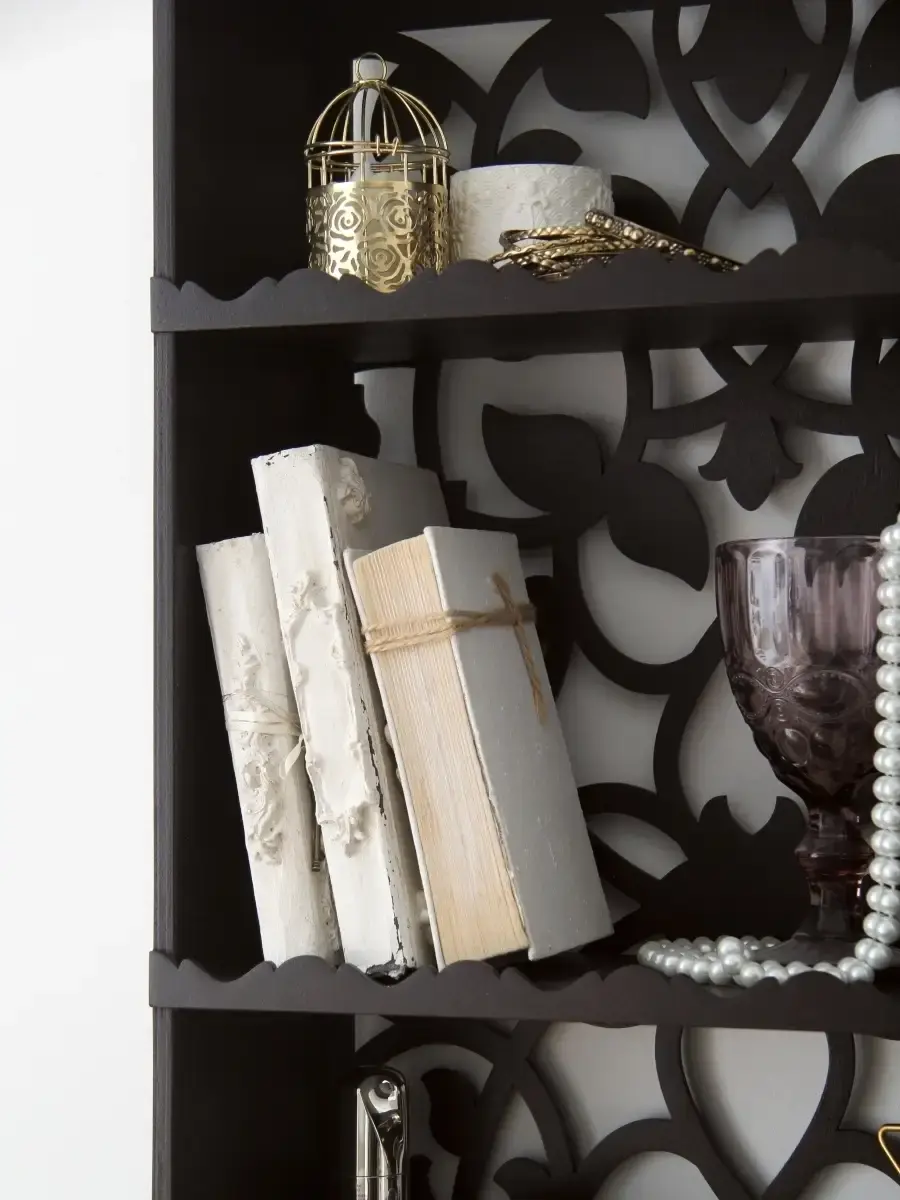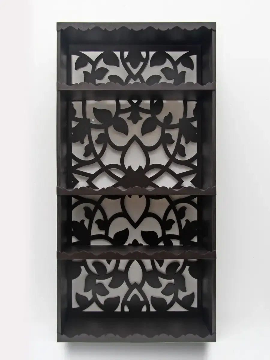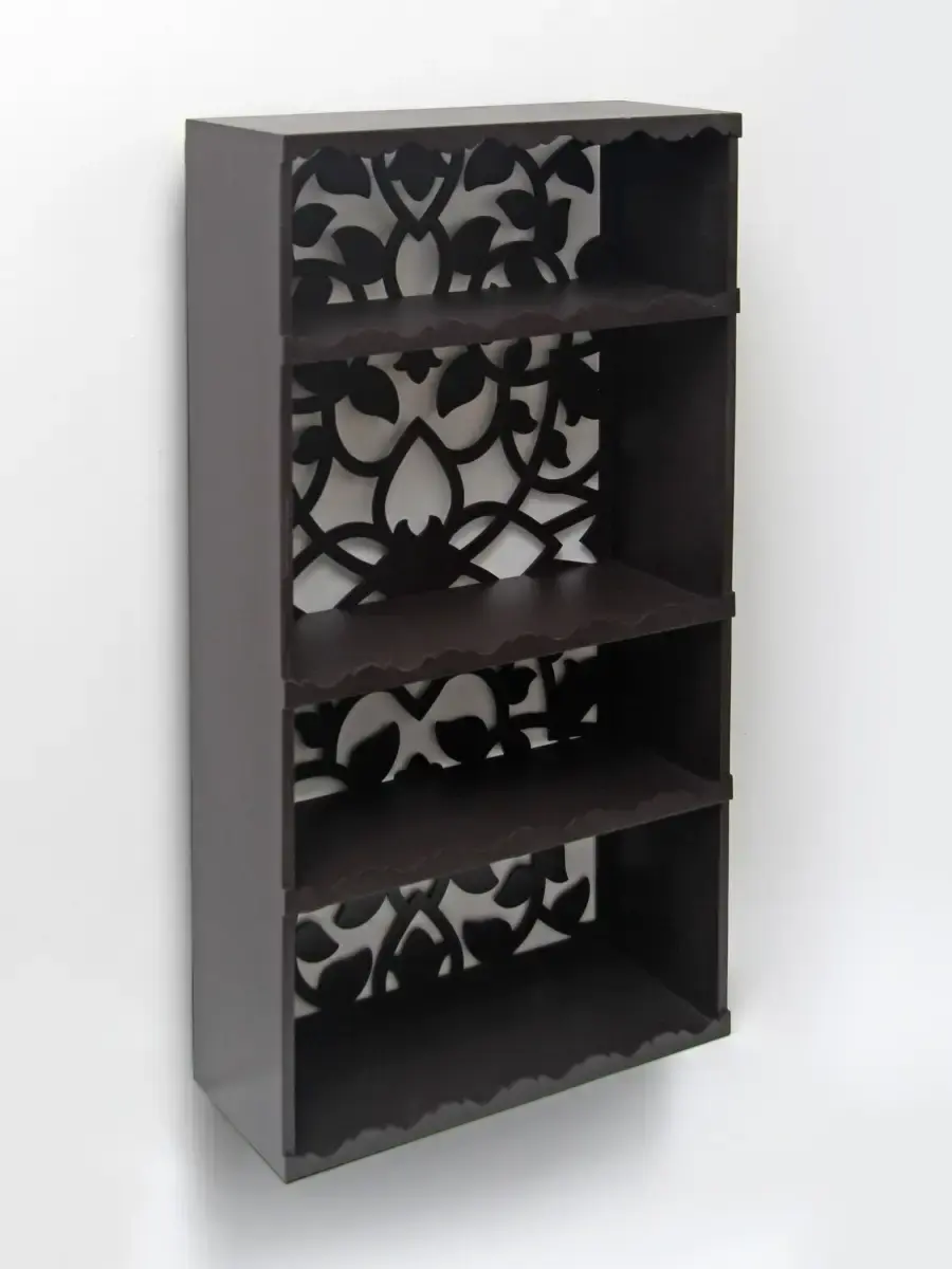 Полка-органайзер с ажурной резной спинкой. Изготовлена из высококачественной шлифованной березовой фанеры. Размер полки 80х40х16 см. Расстояние между полками сверху вниз: 16, 25, 15, 20 см.Ширина полки 15 см.