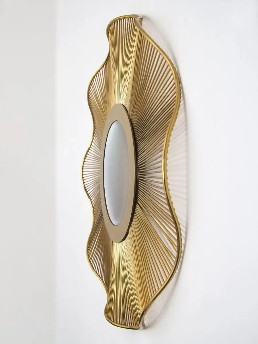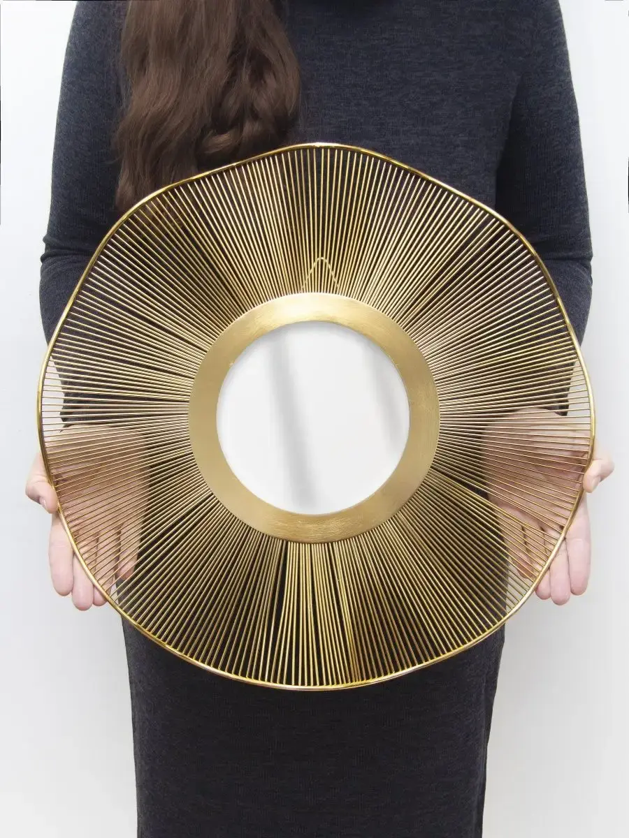 Настенный декор для современного интерьера. Большое металлическое настенное зеркало. Настенная художественная скульптура, металлический солнечный цветок с акцентом "Золотая планета". Золотое металлическое зеркало со вставкой из натурального зеркала. Панно представлены в трех размерах: 75 см, 60 см, 46 см и комплект из трех панно разного размера. Настенный Арт объект украсит интерьер гостиной, прихожей, спальной комнат. Оформление стен этими панно подойдет для любого интерьера, универсальные цвета золотой, синий. Металлический декор для стен добавляет вашему интерьеру много блеска, освежающего ощущения природы и создает непринужденную атмосферу. Это идеальный выбор для современного дома. Художественный цветок ручной работы с ручной росписью - лучший подарок для друзей и семьи. Подарки на новоселье или свадьбу. Украсьте свой дом или сад этим потрясающим 3D-декором для стен в форме цветка. Декор изготовлен из металла, имеет идеальную форму, сварен из гладких металлических спиц, а затем отполирован. Подходит для любых чистых и гладких стен, плитки, окон, металла, пластика и шкафов. Это филигранное металлическое настенное искусство ручной работы с мягким кованым железом выглядит роскошно, является лучшим выбором для вашего внутреннего и наружного декора.