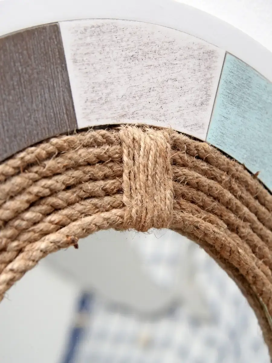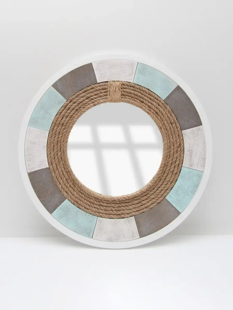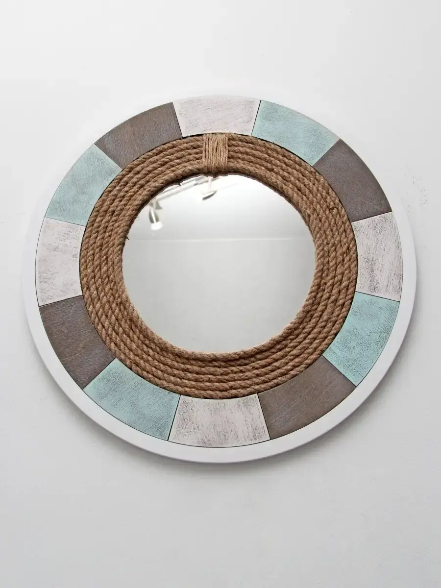 Зеркальное панно "Морской стиль" ручной работы. Рама зеркала выполнена из дерева, декорирована джутовым канатом, окрашено акриловой эмалью с эффектом старения. Диаметр панно 40 см, диаметр зеркала 19,5 см..ПРЕДМЕТ ДОМАШНЕГО ДЕКОРА - Придайте декоративную атмосферу в квартире или загородном доме с помощью этих красивых зеркал в деревянных рамах ручной работы. Идеально подходит интерьера в морском стиле, для мотивов кантри, деревенского дома, модерна, винтаж и мотивов деревянной хижины. Крепление для стены в комплекте.