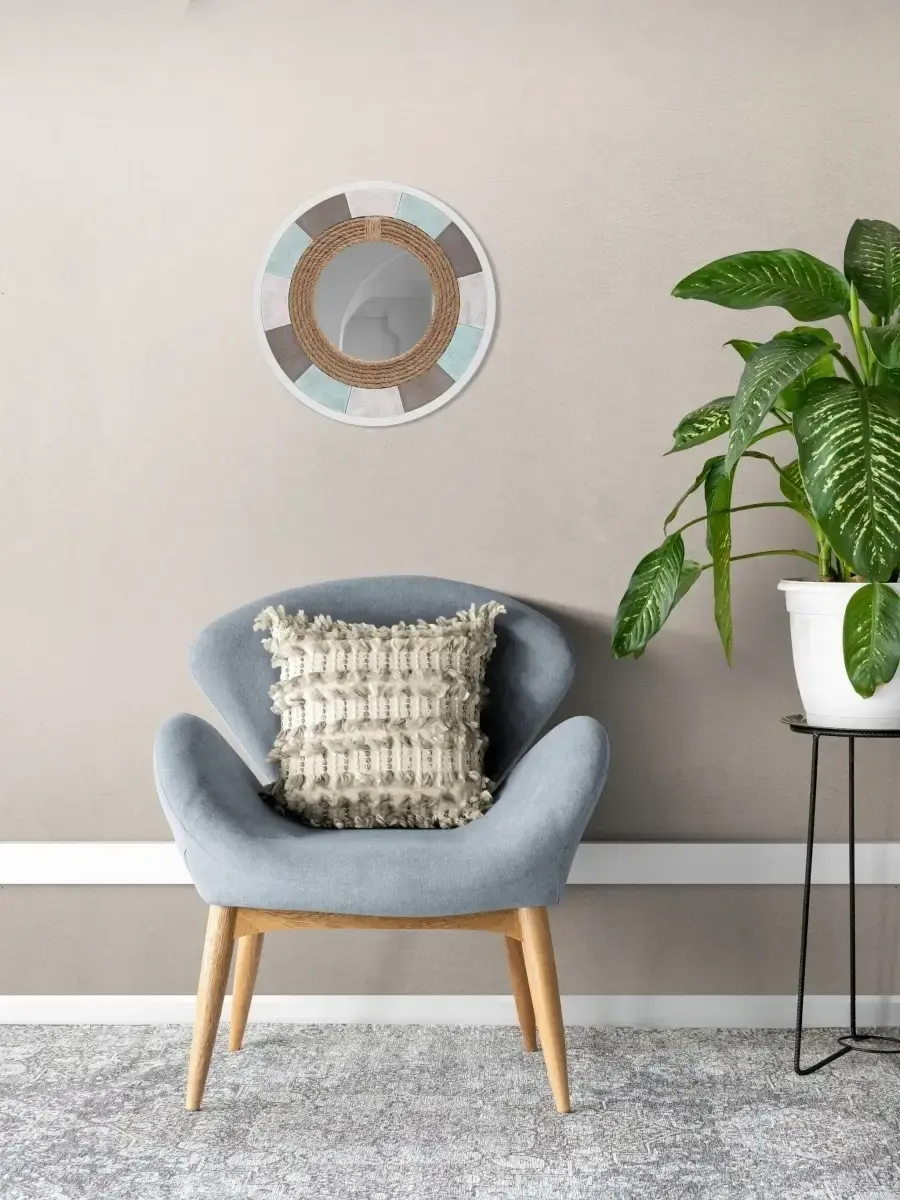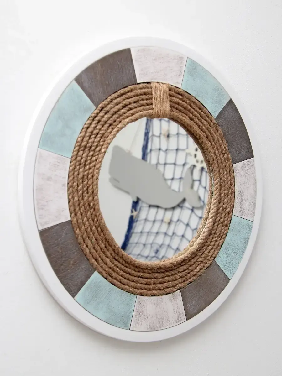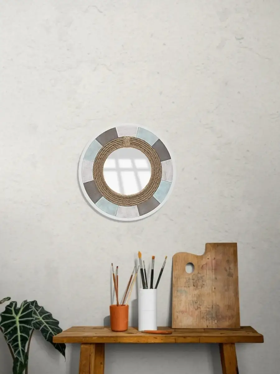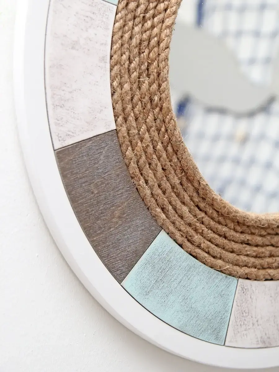 Зеркальное панно "Морской стиль" ручной работы. Рама зеркала выполнена из дерева, декорирована джутовым канатом, окрашено акриловой эмалью с эффектом старения. Диаметр панно 40 см, диаметр зеркала 19,5 см..ПРЕДМЕТ ДОМАШНЕГО ДЕКОРА - Придайте декоративную атмосферу в квартире или загородном доме с помощью этих красивых зеркал в деревянных рамах ручной работы. Идеально подходит интерьера в морском стиле, для мотивов кантри, деревенского дома, модерна, винтаж и мотивов деревянной хижины. Крепление для стены в комплекте.