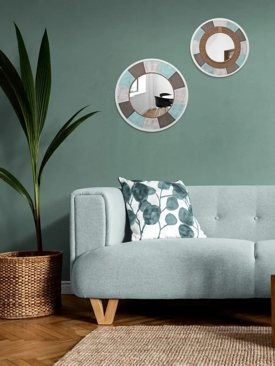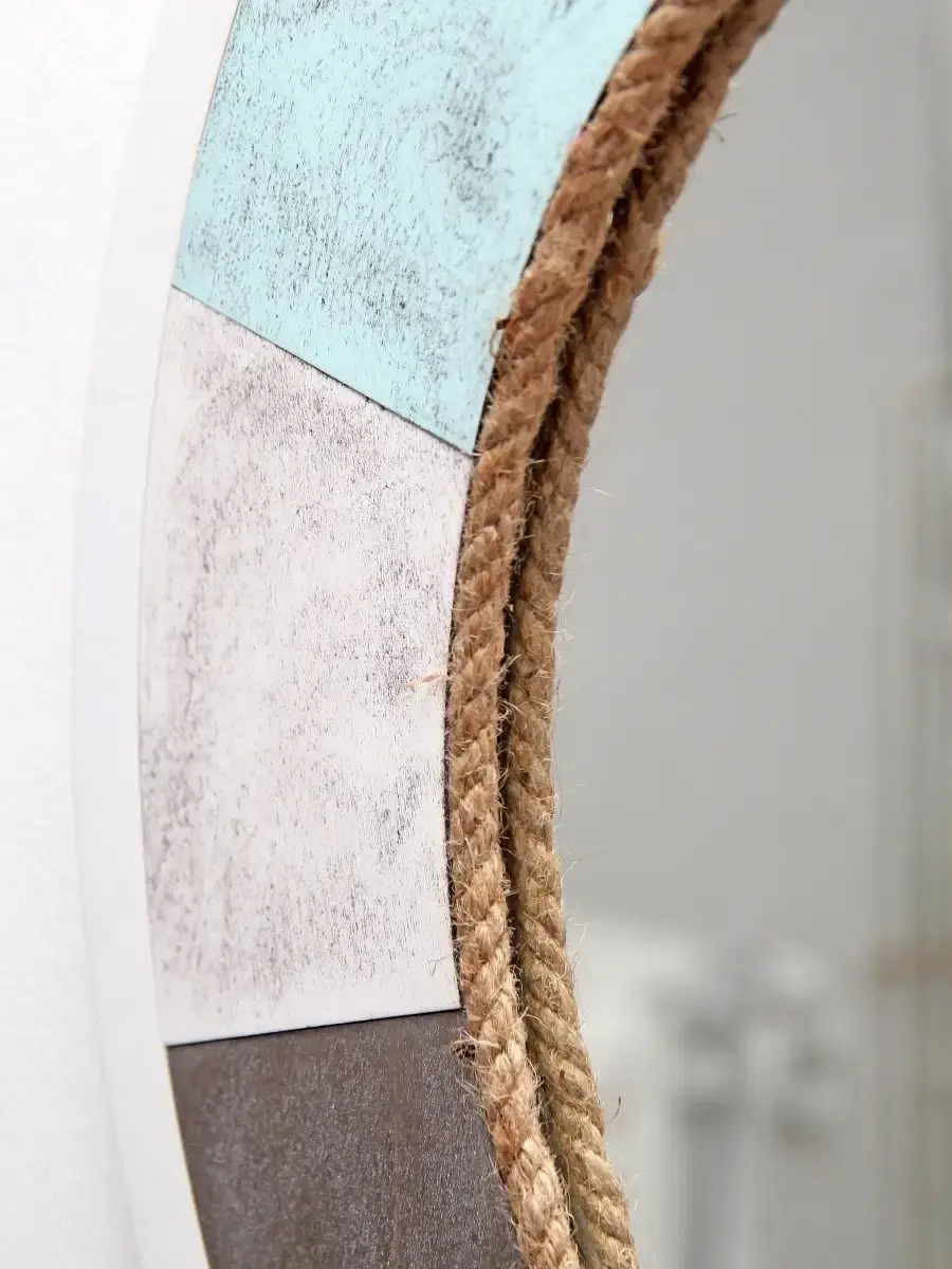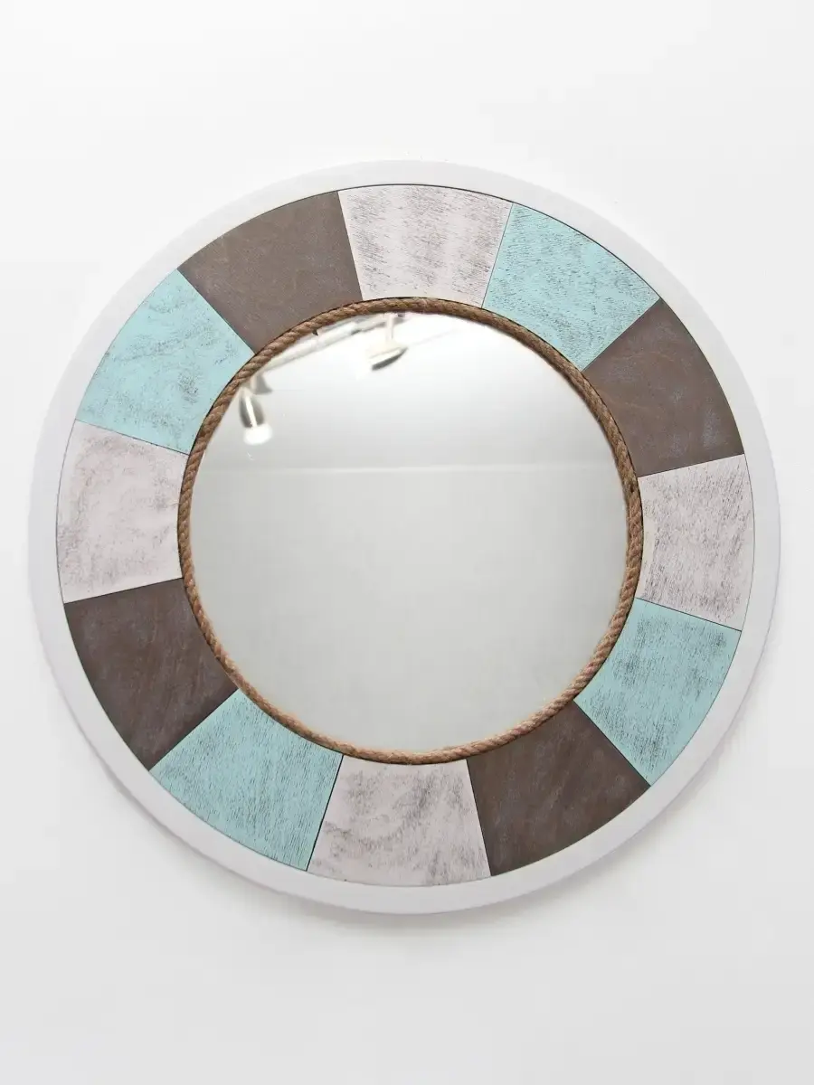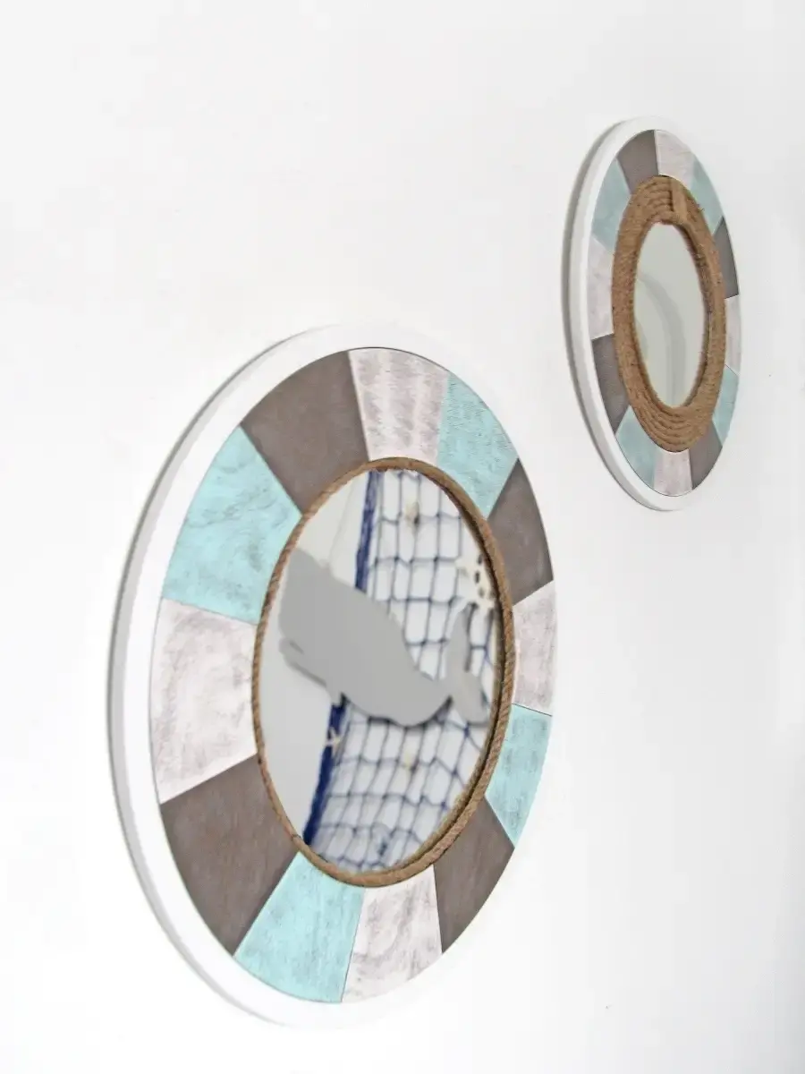 Зеркальное панно "Морской стиль" ручной работы. Рама зеркала выполнена из дерева, декорирована джутовым канатом, окрашено акриловой эмалью с эффектом старения. Диаметр панно 49 см, диаметр зеркала 28,5 см. ПРЕДМЕТ ДОМАШНЕГО ДЕКОРА - Придайте декоративную атмосферу в квартире или загородном доме с помощью этих красивых зеркал в деревянных рамах ручной работы. Идеально подходит интерьера в морском стиле, для мотивов кантри, деревенского дома, модерна, винтаж и мотивов деревянной хижины. Крепление для стены в комплекте.