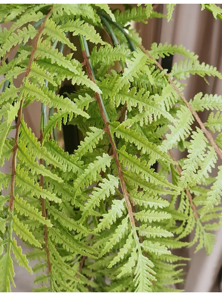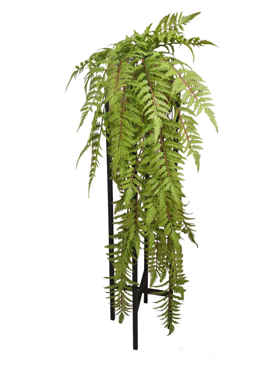 Папоротник интерьерный ампельный для настенного кашпо или для высокой напольной вазы. Большая, богатая ветка ярко-зеленого папоротника для декора стен и потолков в интерьере кафе, ресторанов. Ампелные растения для озеленения затемненых пространств, для создания уюта и природных уголков. Папоротник поставляется без кашпо. Длинными листьями папоротника можно украсить высокую вазу или подставку для растений. Листья из мягкого пластика, каждый лист на проволоке, очень реалистичный. Ветки легко можно мыть. Длина куста 120 см. Длина каждого отдельного листочка 30 см.