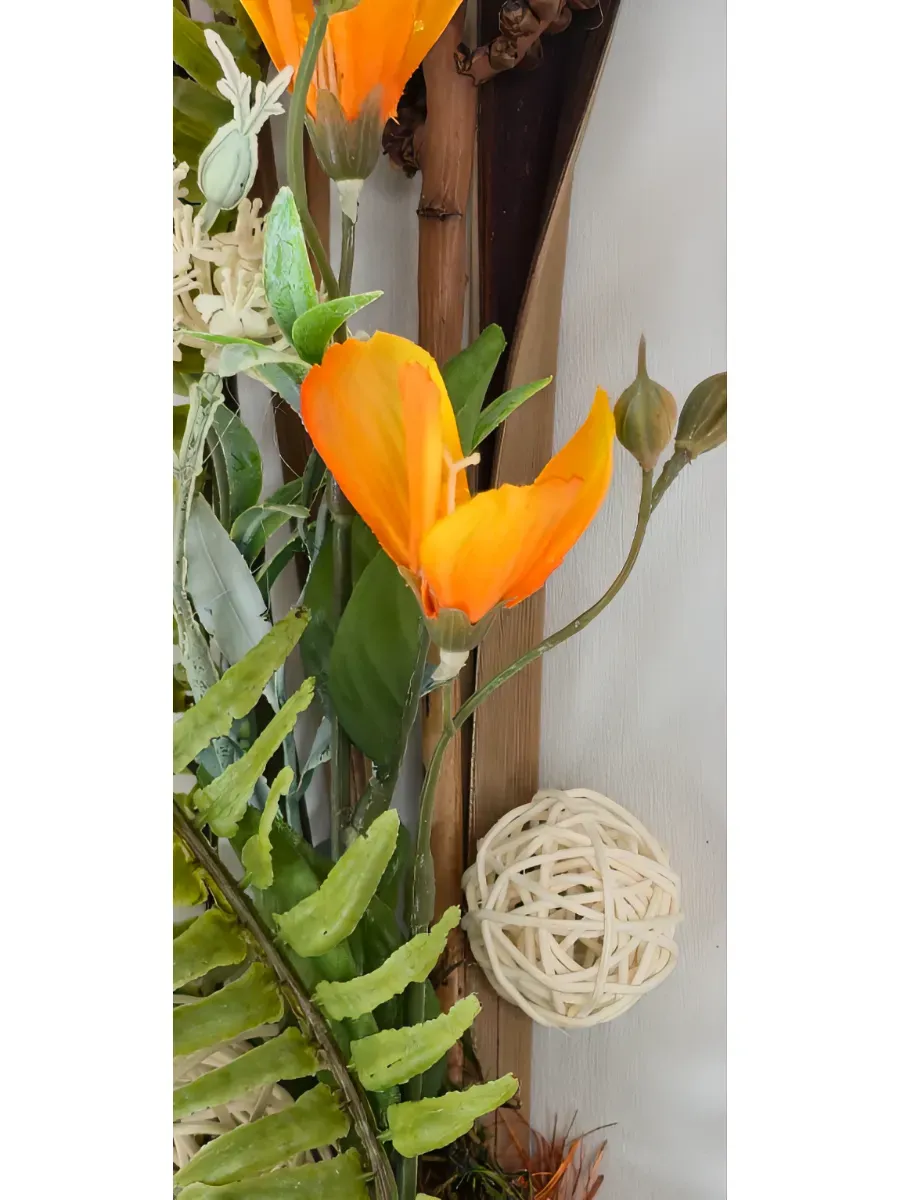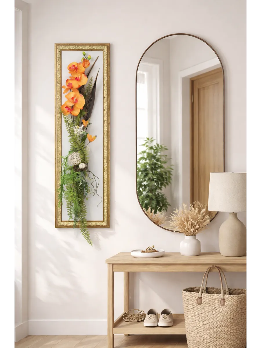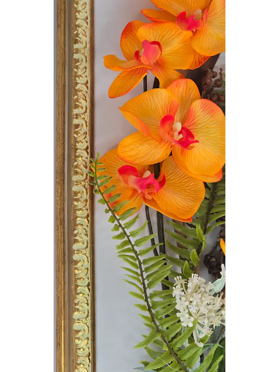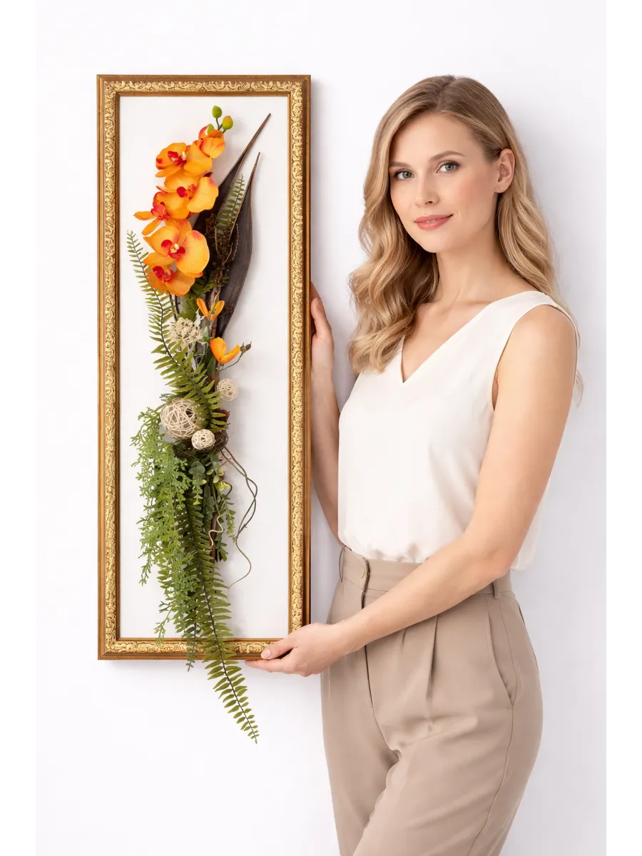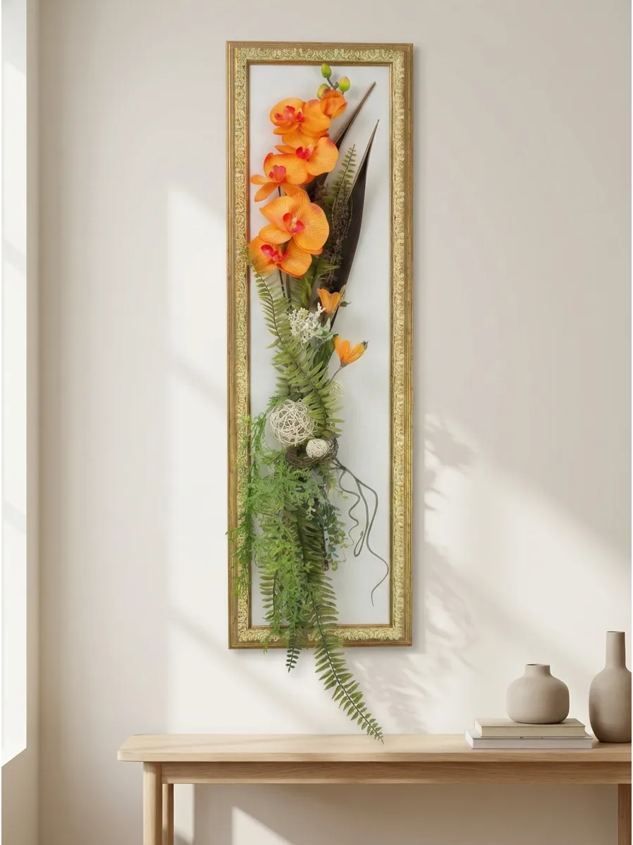 Композиция с орхидеями в декоративной раме — эффектный интерьерный акцент, который привлекает внимание и добавляет пространству ощущение уюта и продуманного стиля. Вертикальный формат 27×94 см идеально подходит для узких стен, простенков, прихожей или зоны у зеркала.