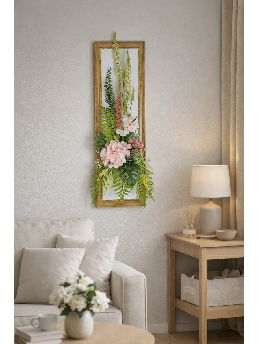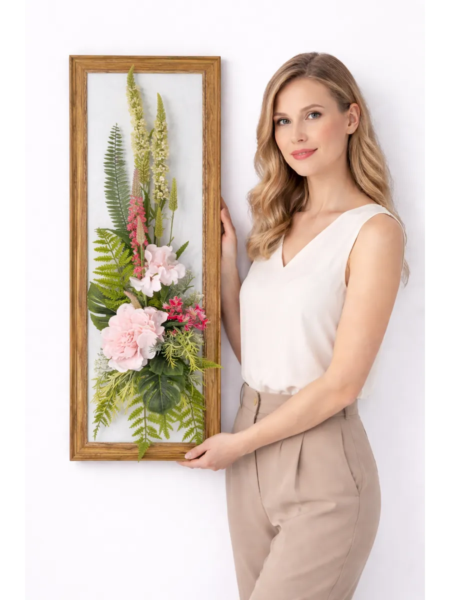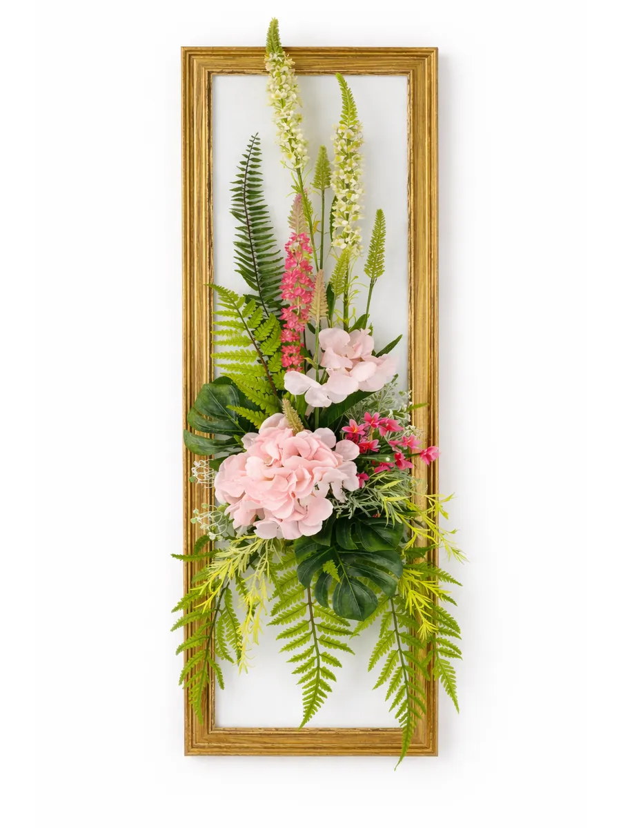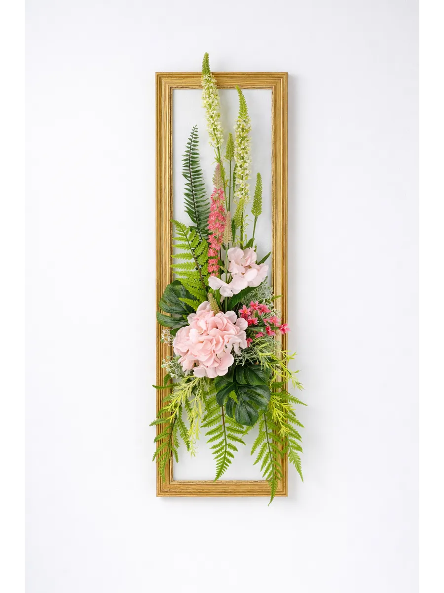 Композиция с гортензией в декоративной раме "под дерево" — эффектный интерьерный акцент, который привлекает внимание и добавляет пространству ощущение уюта и продуманного стиля. Вертикальный формат 88х30 см идеально подходит для узких стен, простенков, прихожей или зоны у зеркала.
