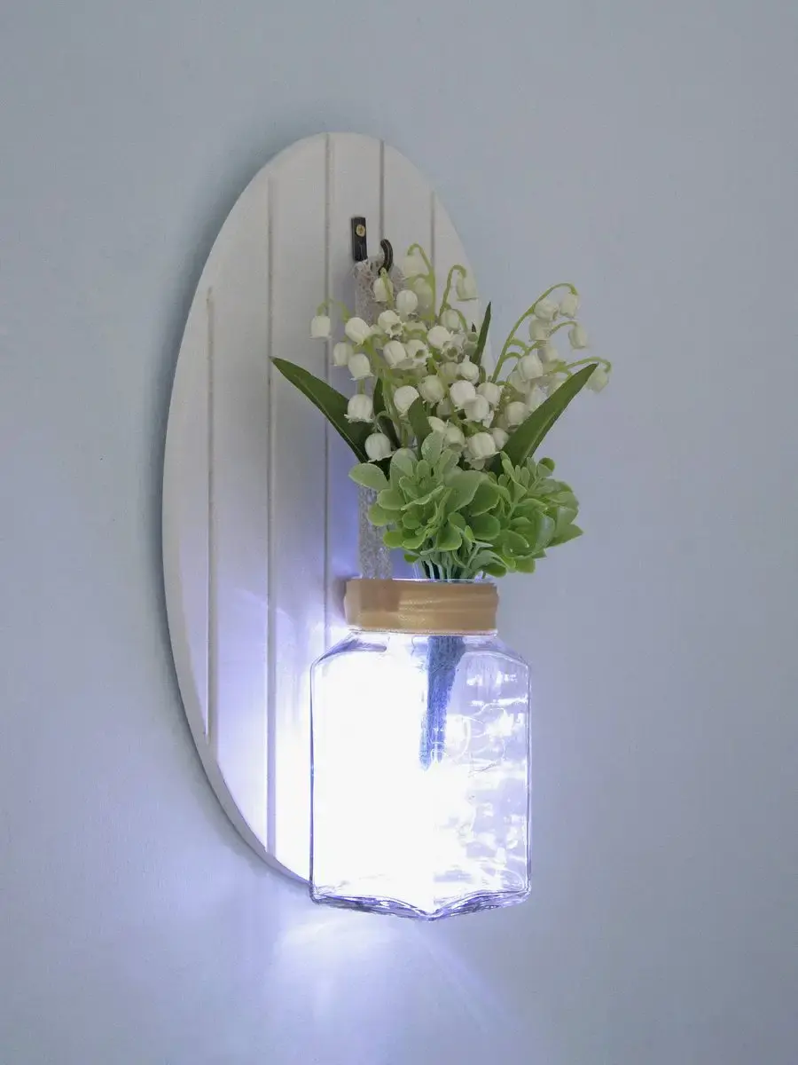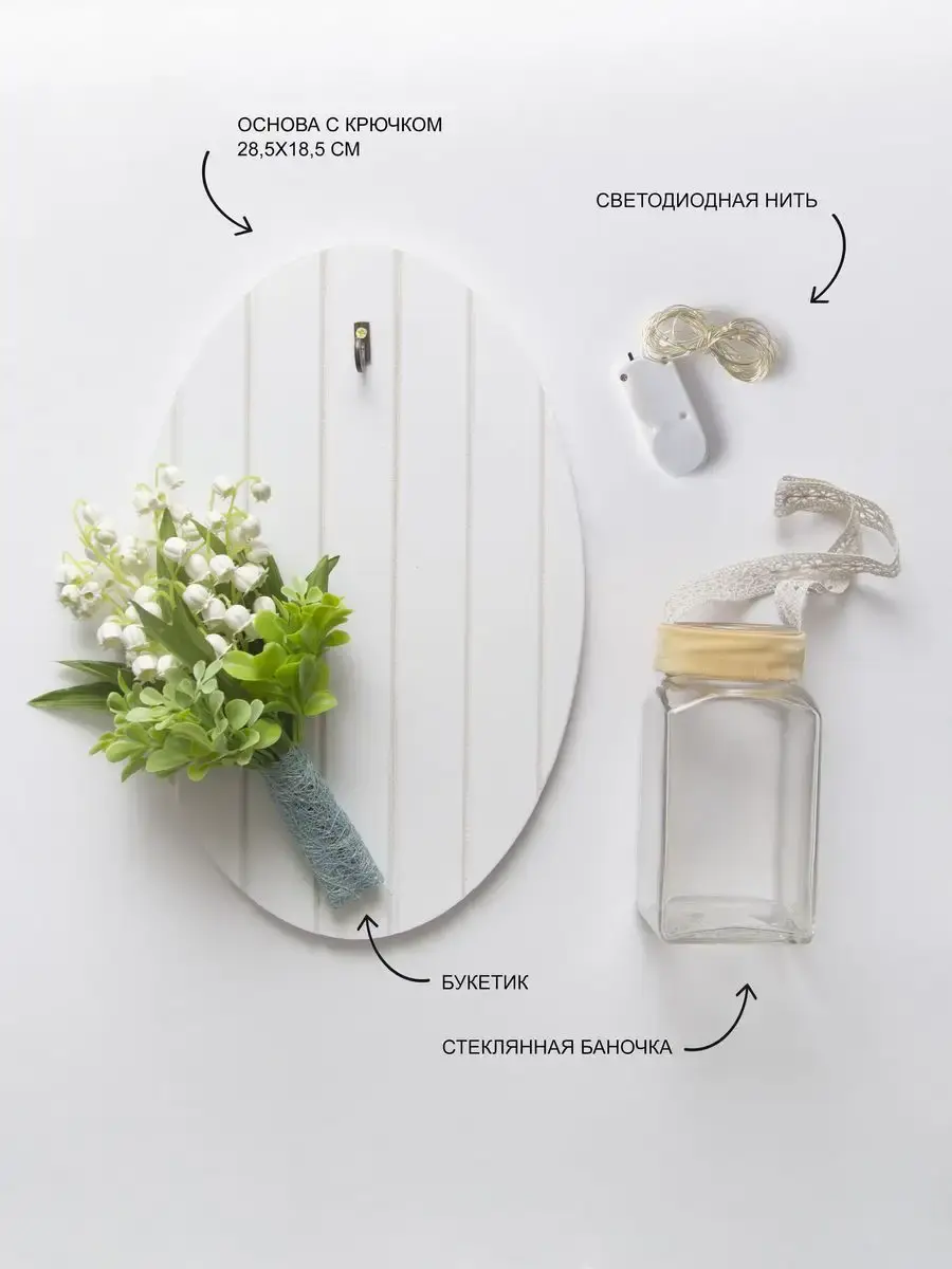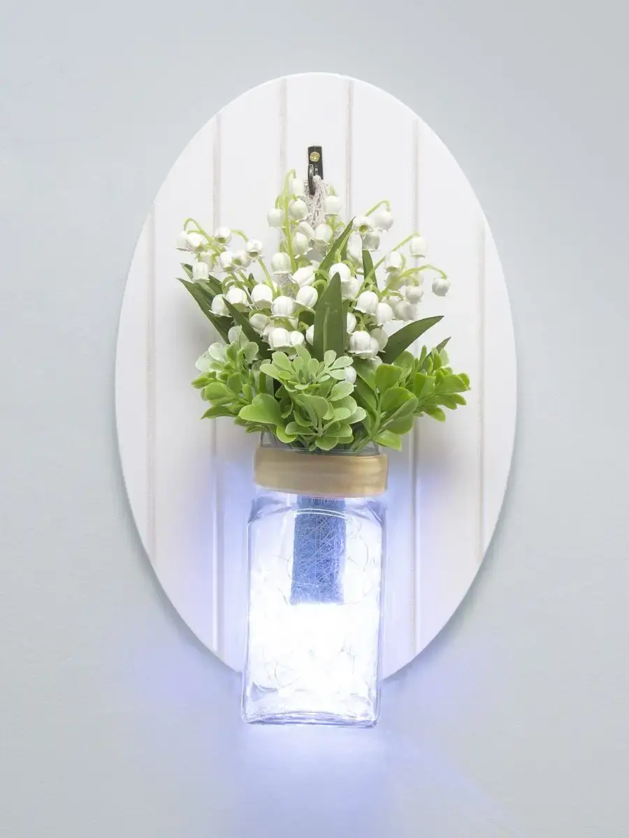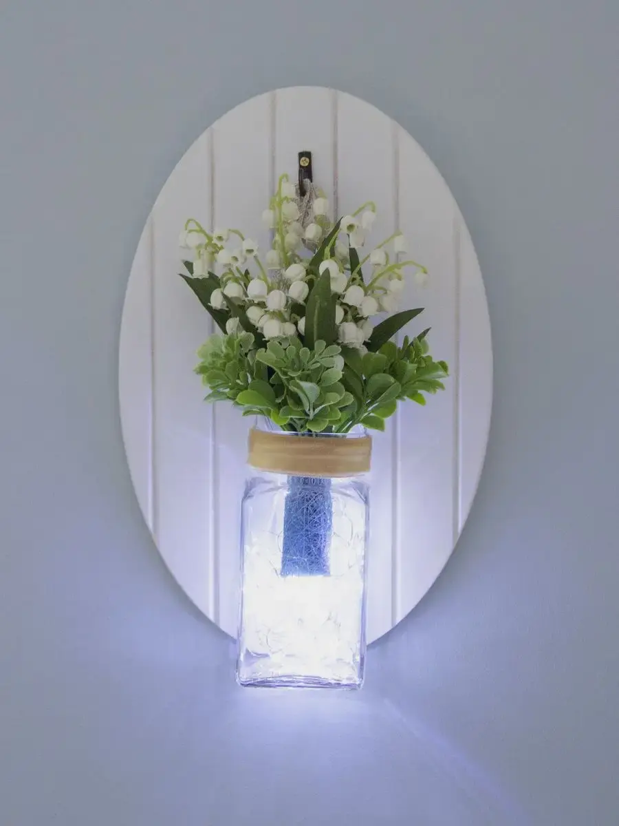 Панно настенное со светодиодными светильниками декорации растения цветы на стену. Декор состоит из нескольких предметов. Панно размером 12*28 см. с крючком на который вешается баночка, букетик и метровая светодиодная нить на батарейках (в комплекте). Модуль с батарейками спрятан в букете. Декор небольшой, учтите это при заказе. Подойдет для оформления зеркал, пара таких композиция по бокам преобразят интерьер. Крепление для стены в комплекте.