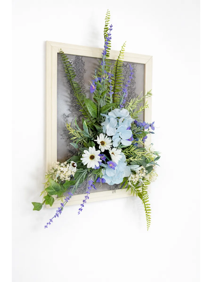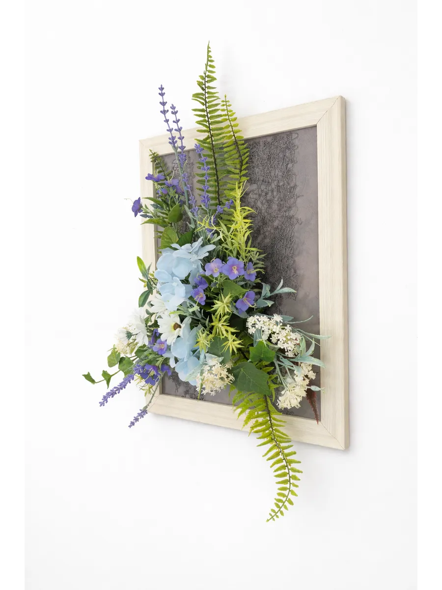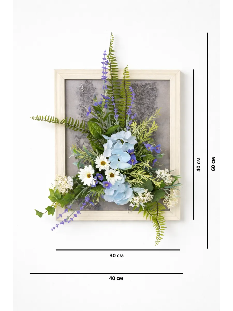 Авторская композиция из интерьерных цветов в багетной раме 60*40 см. Настенная цветочная композиция в багетной раме с искусственными интерьерными цветами. Выполнена из высококачественных искусственных цветов и растений, лаванды и гортензии, папоротника, ромашек. В комплекте шуруп с дюбелем и зубчатый крепеж на раме. Отличное украшение к зеркалу, коллекции картин с цветами или в прихожей, где живым цветам недостаточно света. Панно долго будет радовать и добавлять уюта в дом.