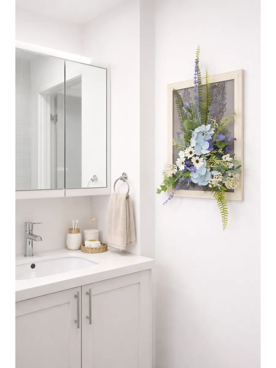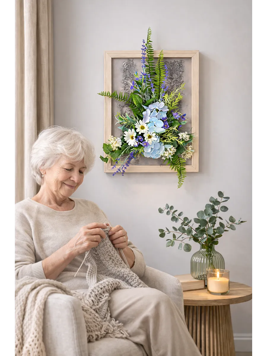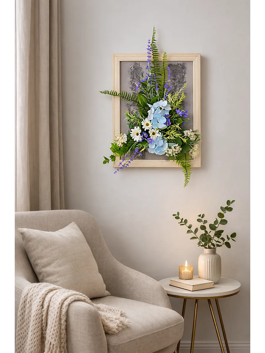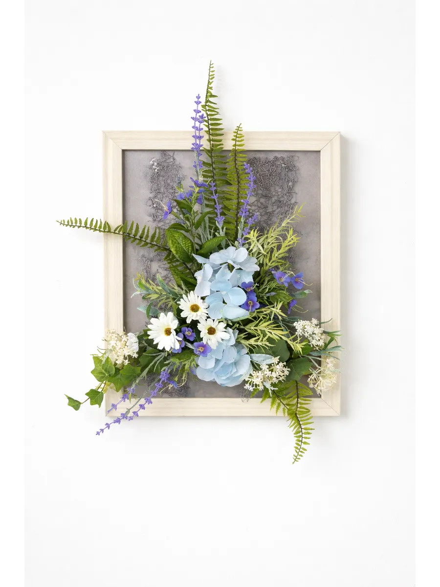 Авторская композиция из интерьерных цветов в багетной раме 60*40 см. Настенная цветочная композиция в багетной раме с искусственными интерьерными цветами. Выполнена из высококачественных искусственных цветов и растений, лаванды и гортензии, папоротника, ромашек. В комплекте шуруп с дюбелем и зубчатый крепеж на раме. Отличное украшение к зеркалу, коллекции картин с цветами или в прихожей, где живым цветам недостаточно света. Панно долго будет радовать и добавлять уюта в дом.