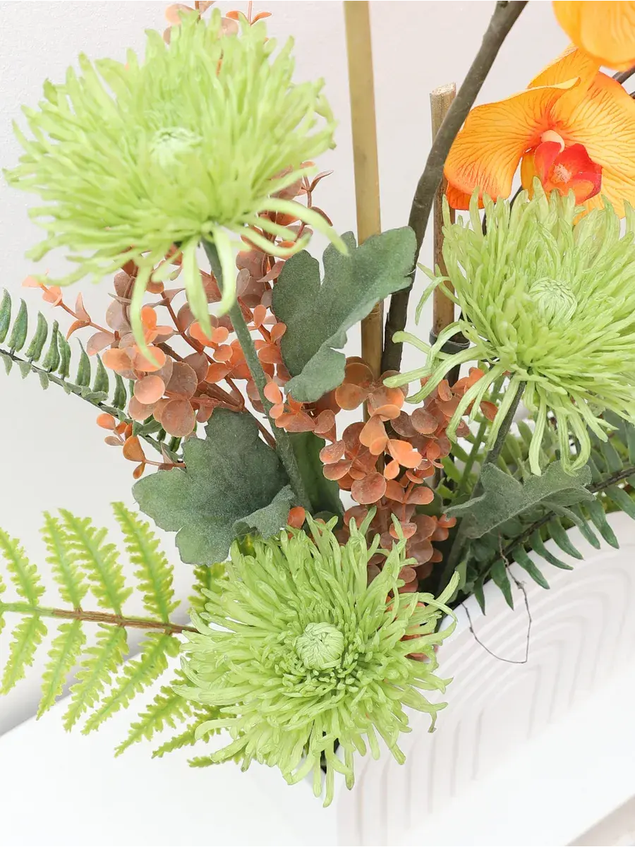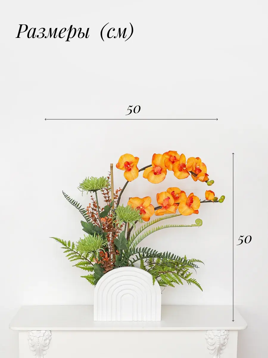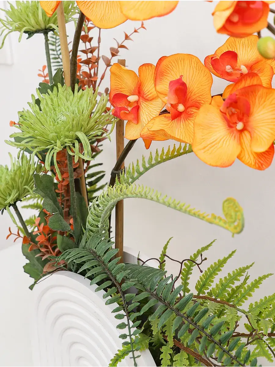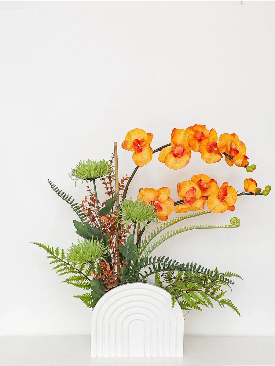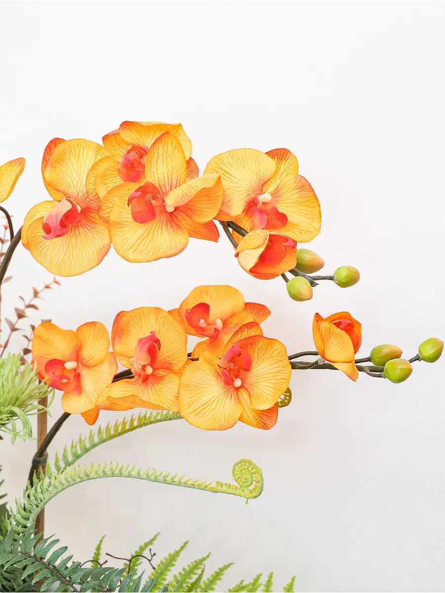 Компазиция орхидей и папоротников цветок как живой, композиция в современном стиле станет замечательным украшением для любой комнаты. Благодаря своим высоким стеблям и большому количеству цветов, орхидея прекрасно впишется в интерьер гостиной или ванной. Икебана создана для тех, кто ценит красоту природы и хочет добавить в дом частичку зелени. Это растение отлично смотрится в деревянном кашпо, подчеркивая элегантность и стиль вашего пространства.