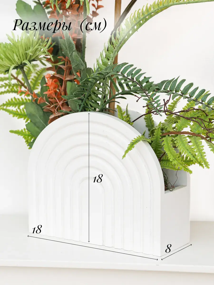 Размер композиции целиком 50*50*17 см. Цветы надежно закреплены в кашпо.