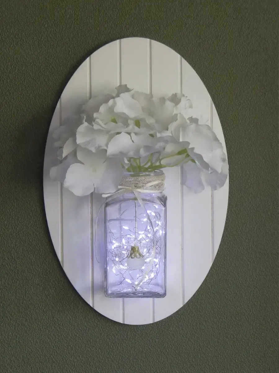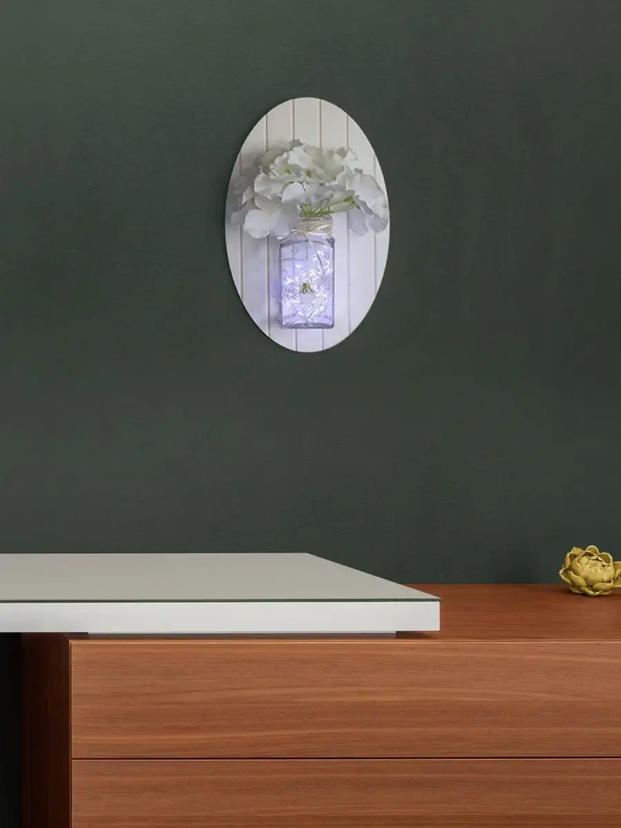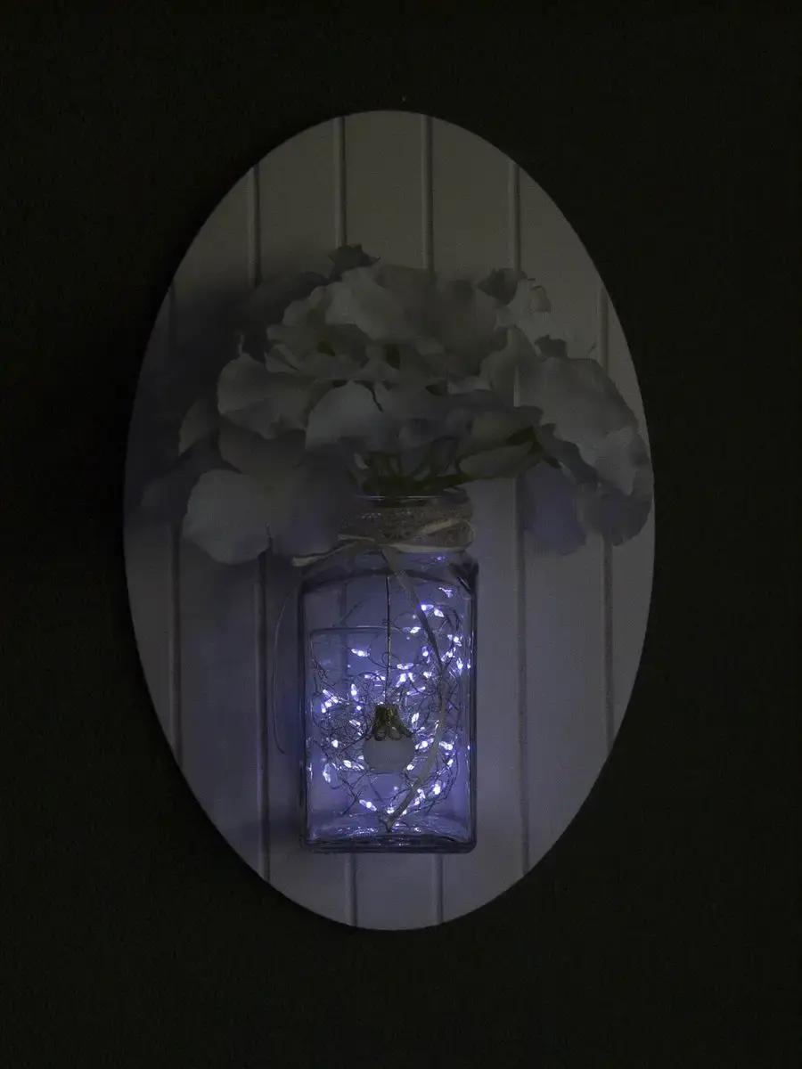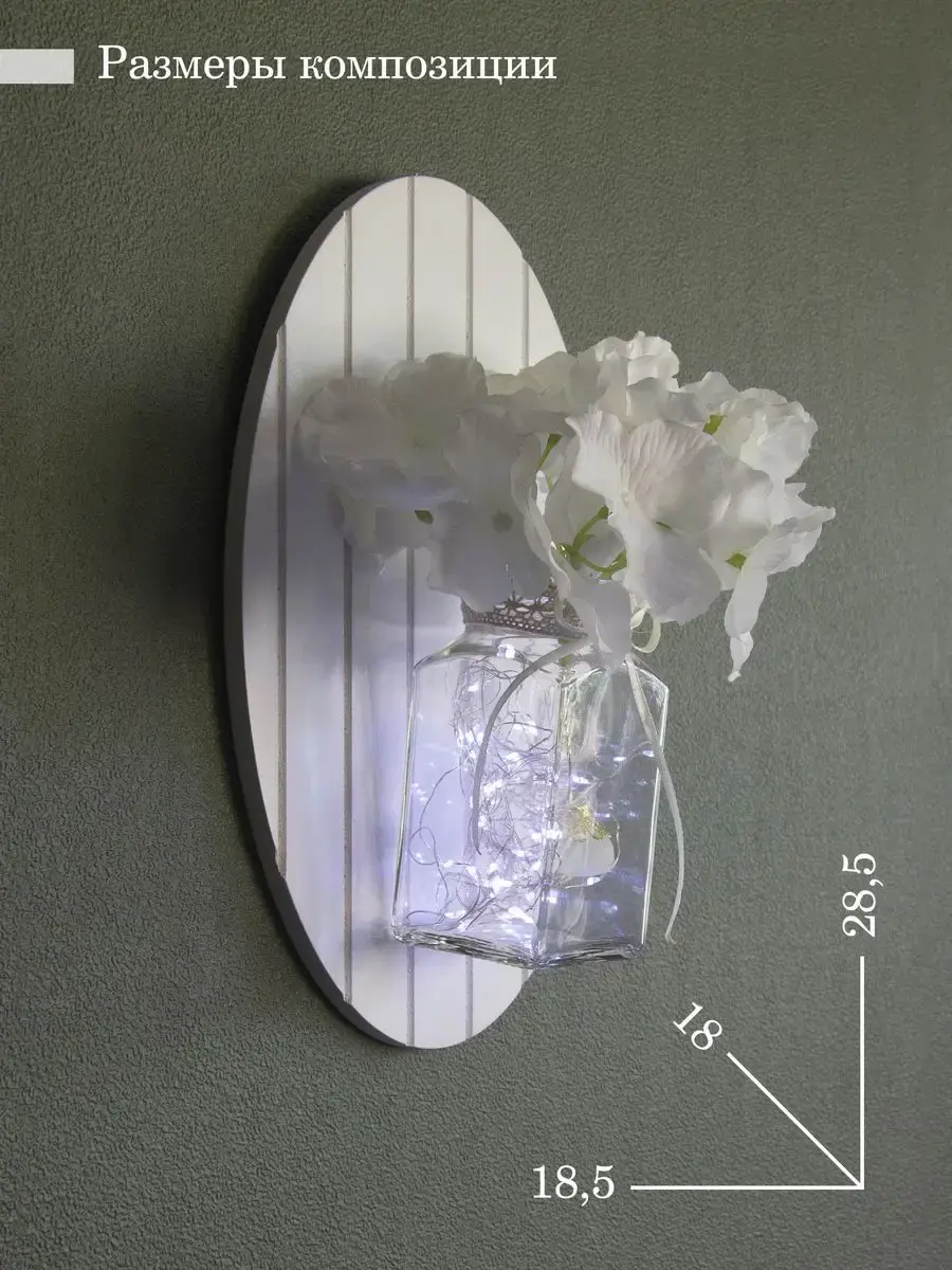 Панно настенное со светодиодными светильниками декорации растения цветы на стену. Декор состоит из нескольких предметов. Панно размером 12*28 см. с крючком на который вешается баночка, букетик и метровая светодиодная нить на батарейках (в комплекте). Модуль с батарейками спрятан в букете. Декор небольшой, учтите это при заказе. Подойдет для оформления зеркал, пара таких композиция по бокам преобразят интерьер. Крепление для стены в комплекте.