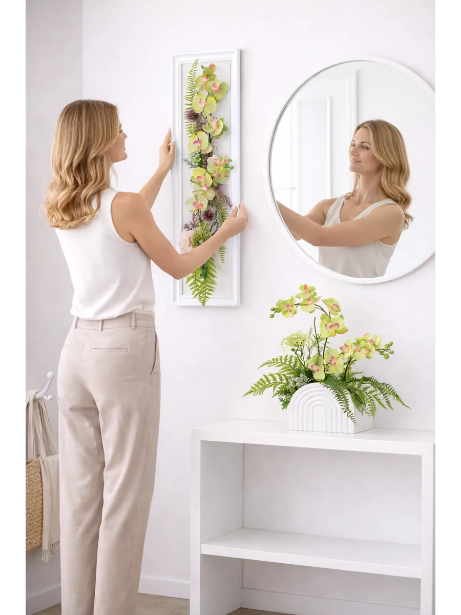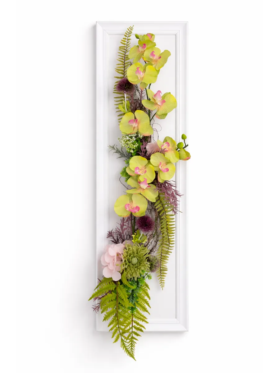 Композиция с орхидеями в декоративной раме — эффектный интерьерный акцент, который привлекает внимание и добавляет пространству ощущение уюта и продуманного стиля. Вертикальный формат 27×96 см идеально подходит для узких стен, простенков, прихожей или зоны у зеркала.