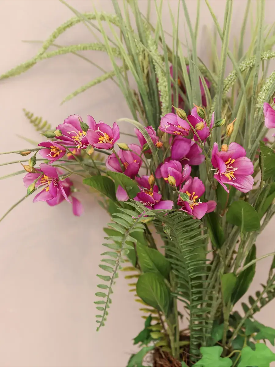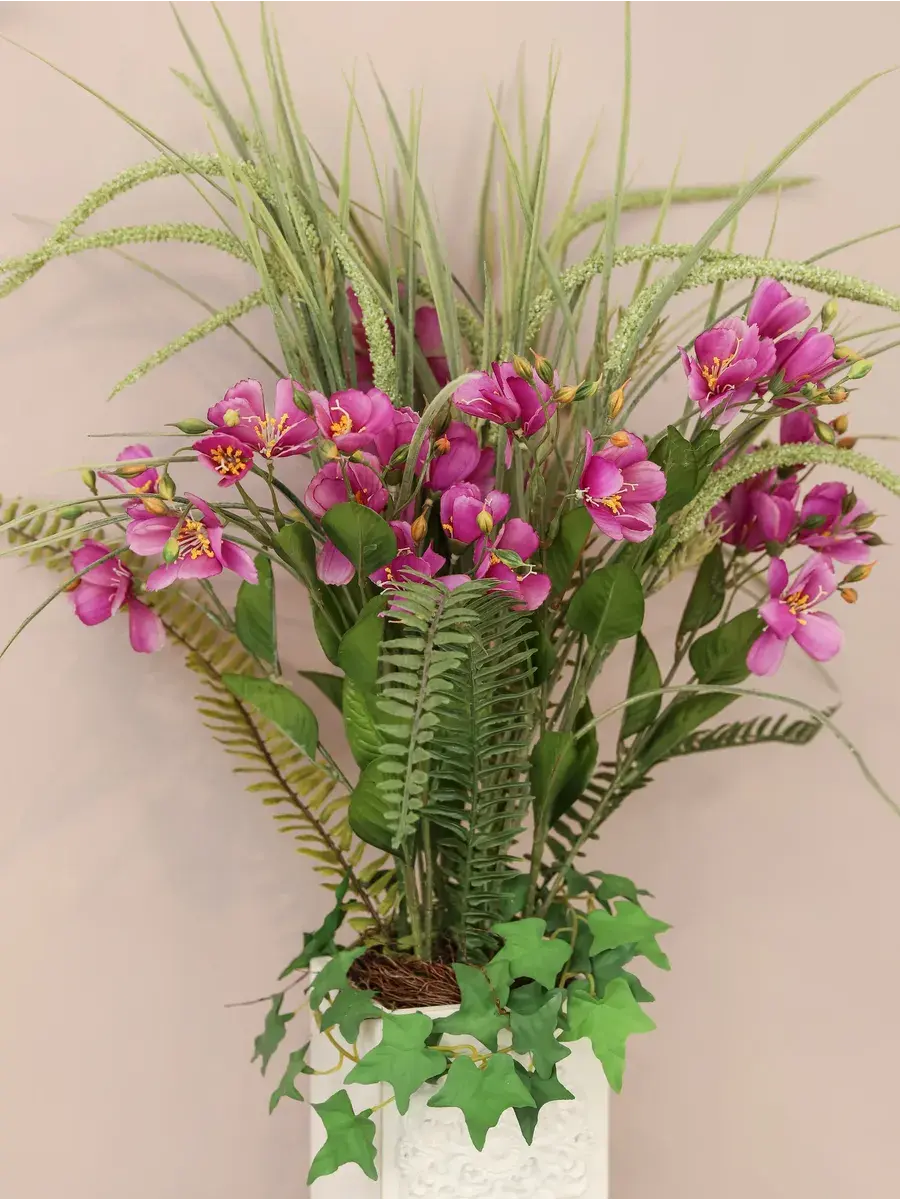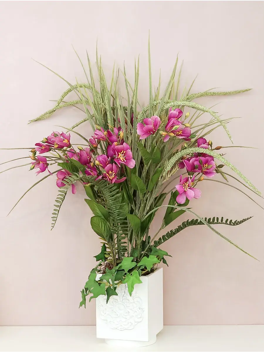Благодаря своим высоким стеблям и большому количеству цветов, прекрасно впишется в интерьер гостиной или ванной. Икебана создана для тех, кто ценит красоту природы и хочет добавить в дом частичку зелени. Это растение отлично смотрится в деревянном кашпо, подчеркивая элегантность и стиль вашего пространства.