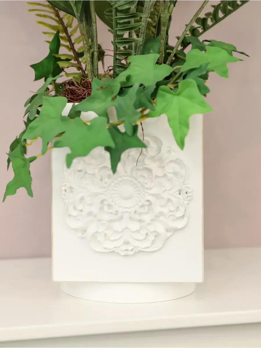 Небольшая изысканная композиция из искусственных цветов, плюща и папоротников в деревянном кашпо с лепниной.