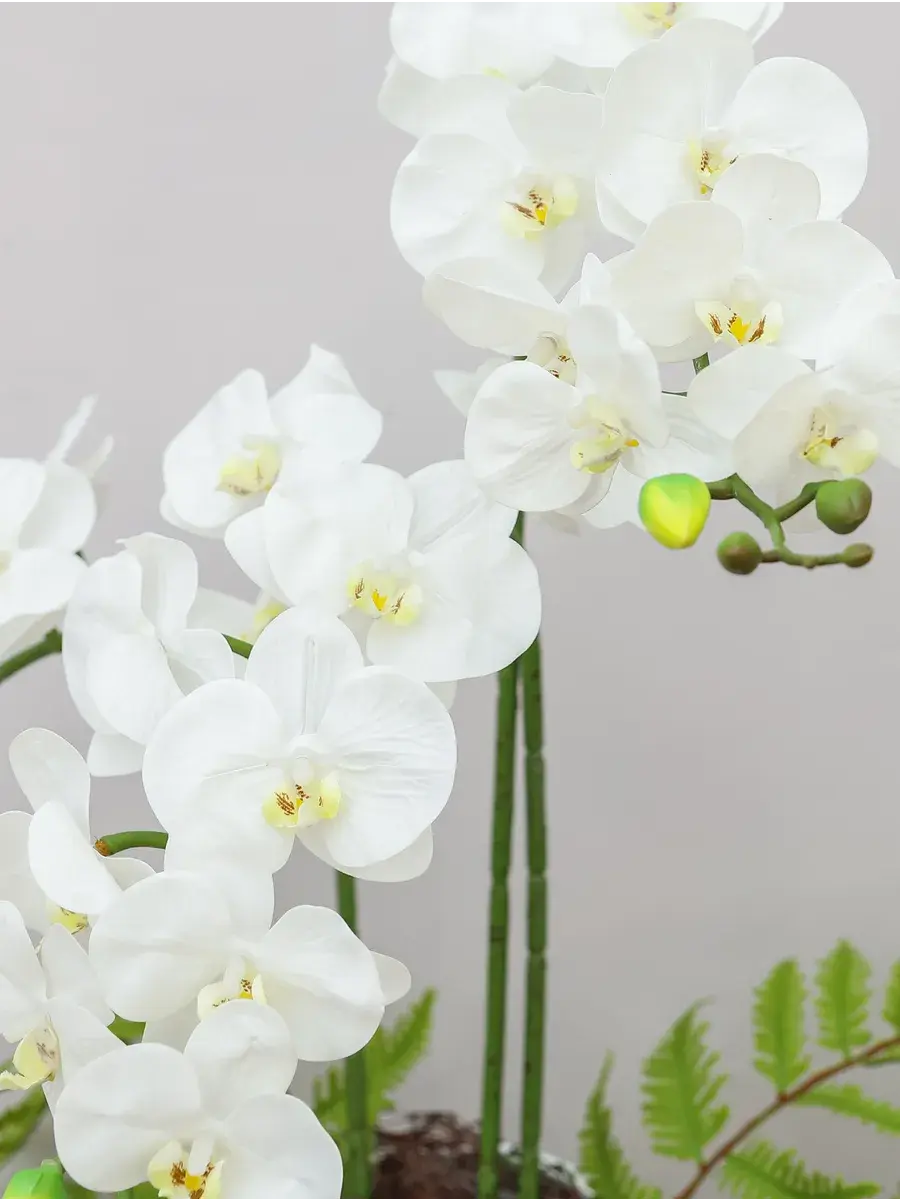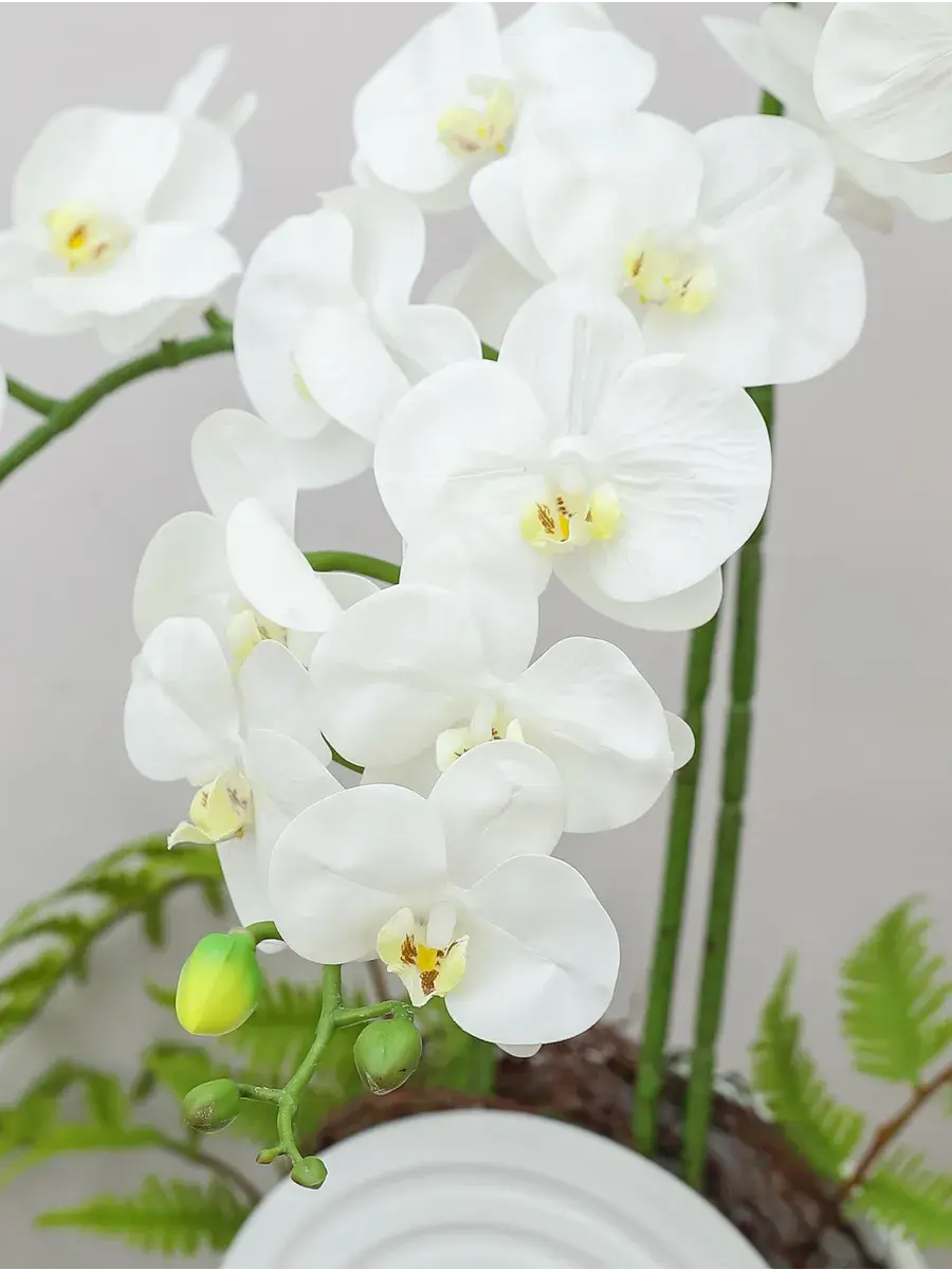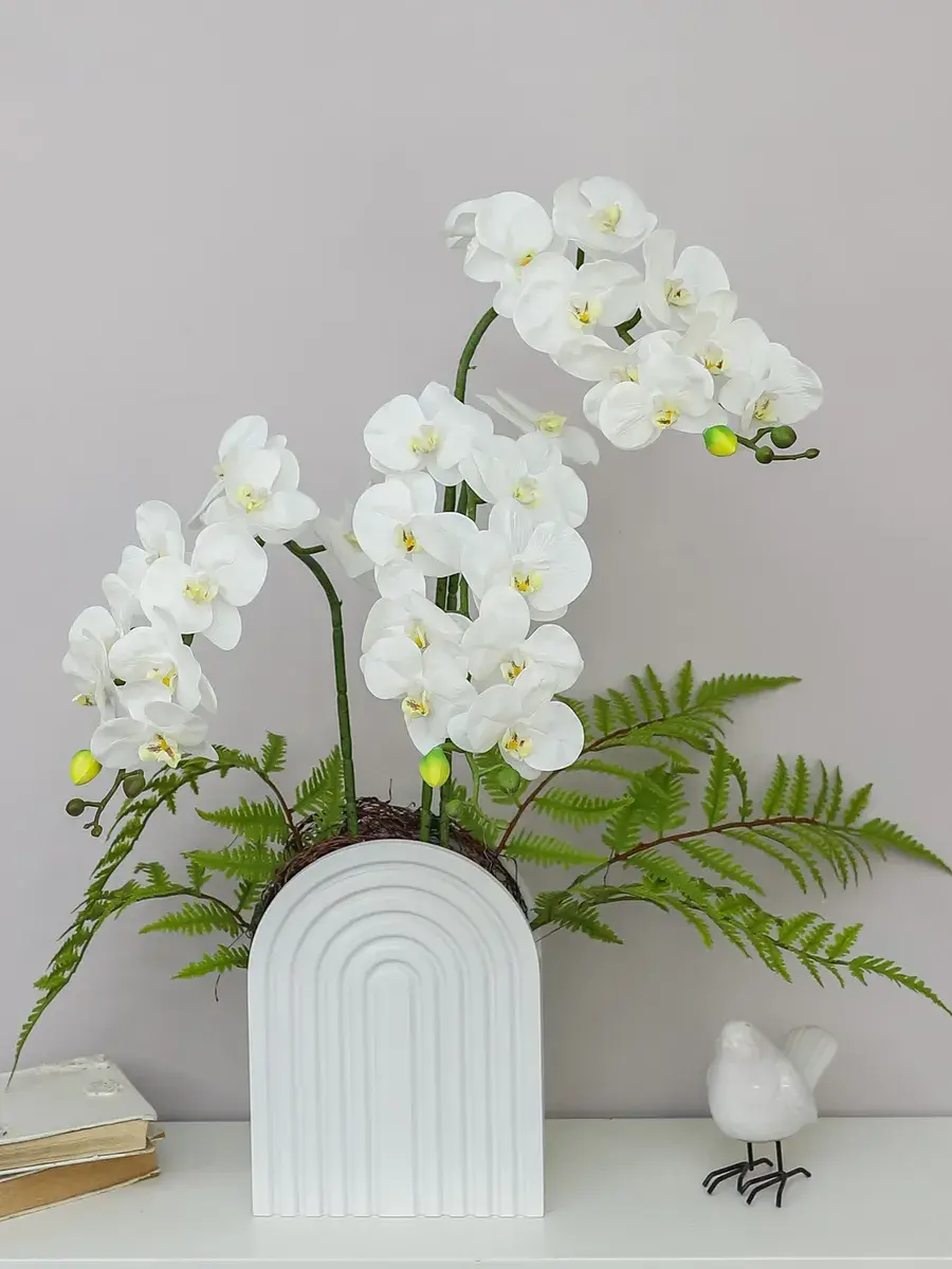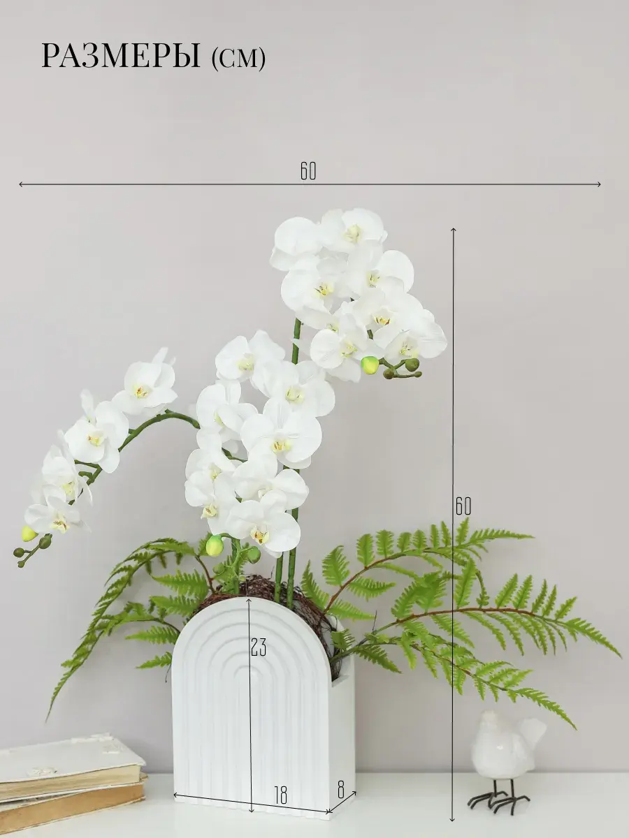 Орхидея фаленопсис — цветок как живой, композиция в современном стиле станет замечательным украшением для любой комнаты. Благодаря своим высоким стеблям и большому количеству цветов, белая орхидея прекрасно впишется в интерьер гостиной или ванной. Икебана создана для тех, кто ценит красоту природы и хочет добавить в дом частичку зелени. Это растение отлично смотрится в деревянном кашпо, подчеркивая элегантность и стиль вашего пространства.