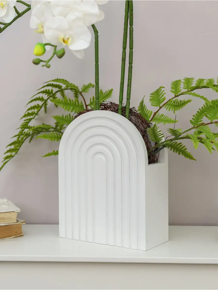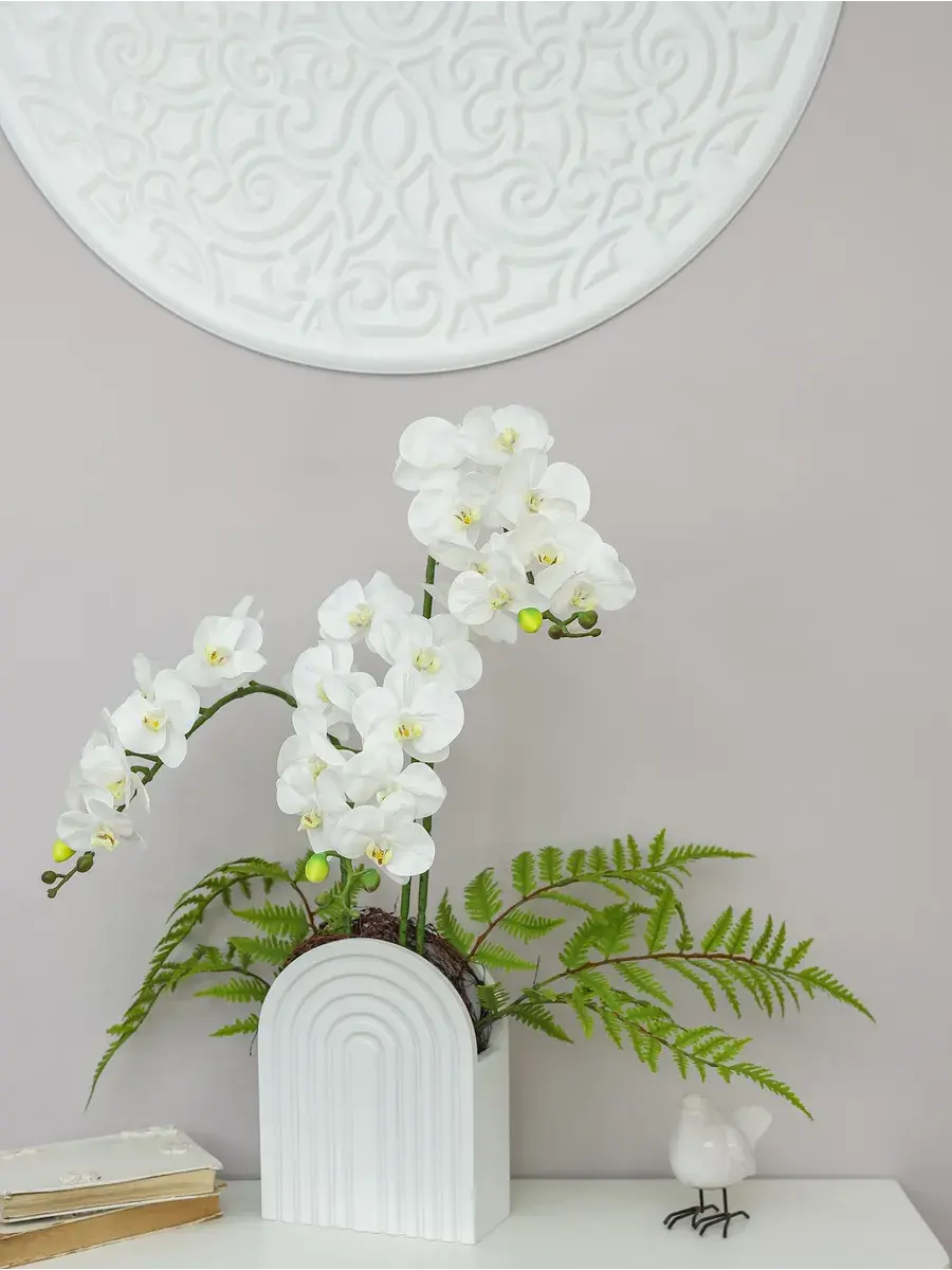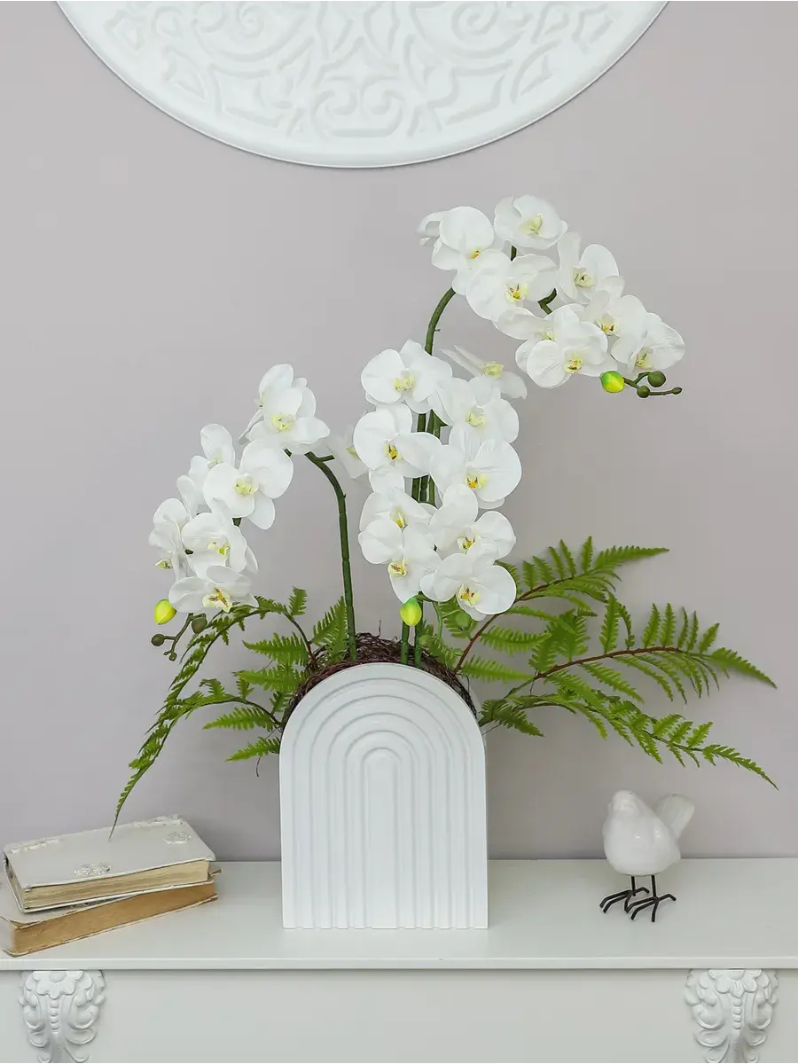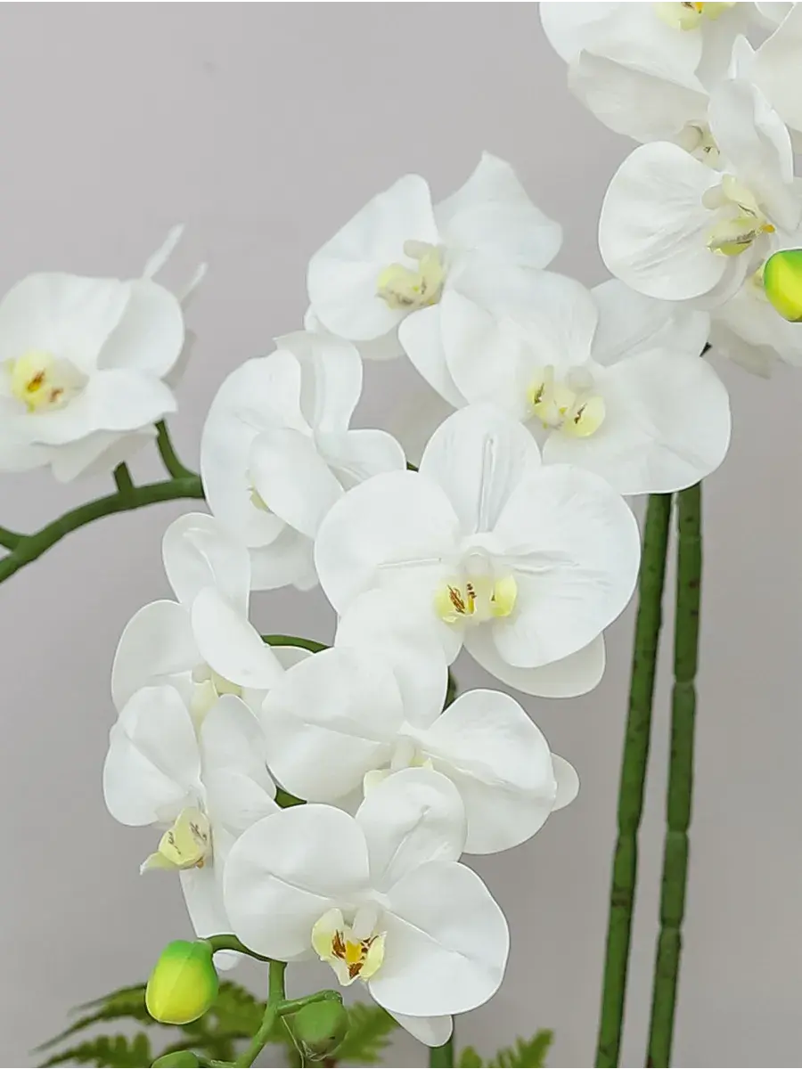 Орхидея фаленопсис — цветок как живой, композиция в современном стиле станет замечательным украшением для любой комнаты. Благодаря своим высоким стеблям и большому количеству цветов, белая орхидея прекрасно впишется в интерьер гостиной или ванной. Икебана создана для тех, кто ценит красоту природы и хочет добавить в дом частичку зелени. Это растение отлично смотрится в деревянном кашпо, подчеркивая элегантность и стиль вашего пространства.