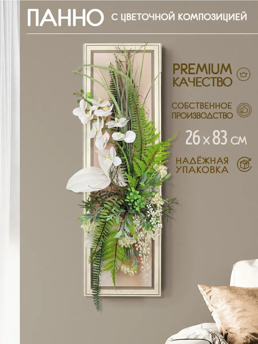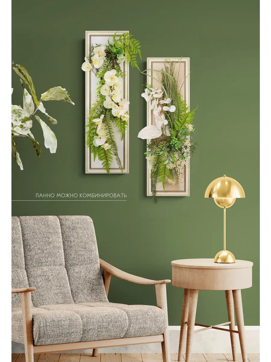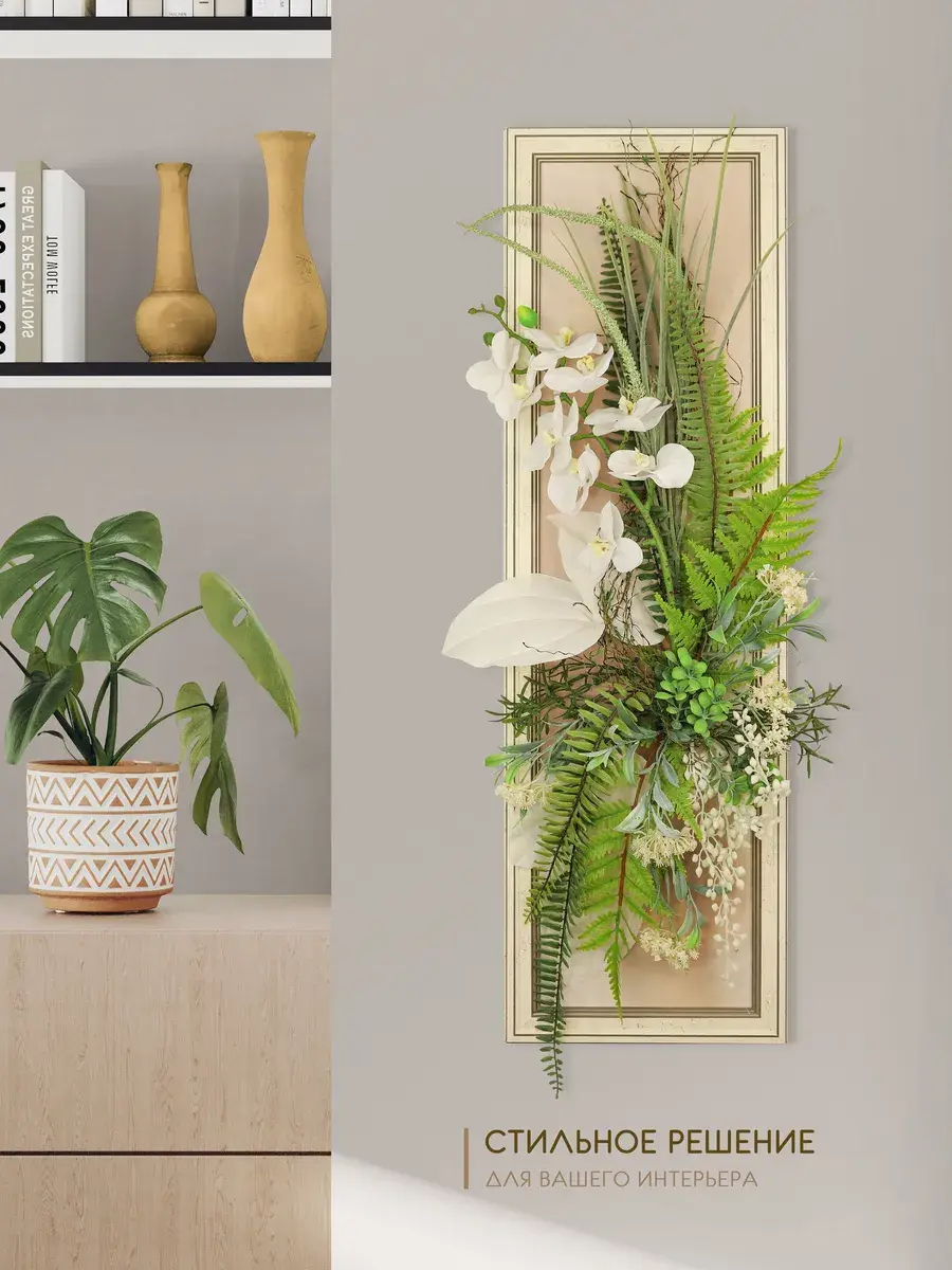 Настенное панно с искусственными цветами станет ярким акцентом в вашем интерьере. Эта композиция в раме оформлена стильными цветами, которые гармонично дополняют композицию, создавая атмосферу уюта и нежности. Подходит для украшения гостиной или спальни, придавая пространству особый шарм. Длинные лианы эффектно свисают, добавляя динамичности, а яркие растения словно оживляют стену. Настенное украшение станет не только красивым элементом декора, но и практичным решением для тех, кто хочет избежать забот о живых растениях. Панно легко монтируется на стену, что позволяет быстро изменить обстановку в комнате. Оно отлично впишется в любые стили интерьера, от классического до современного, придавая пространству дома завершённый вид. Это изделие не только радует глаз, но и создает теплую атмосферу в вашем доме.