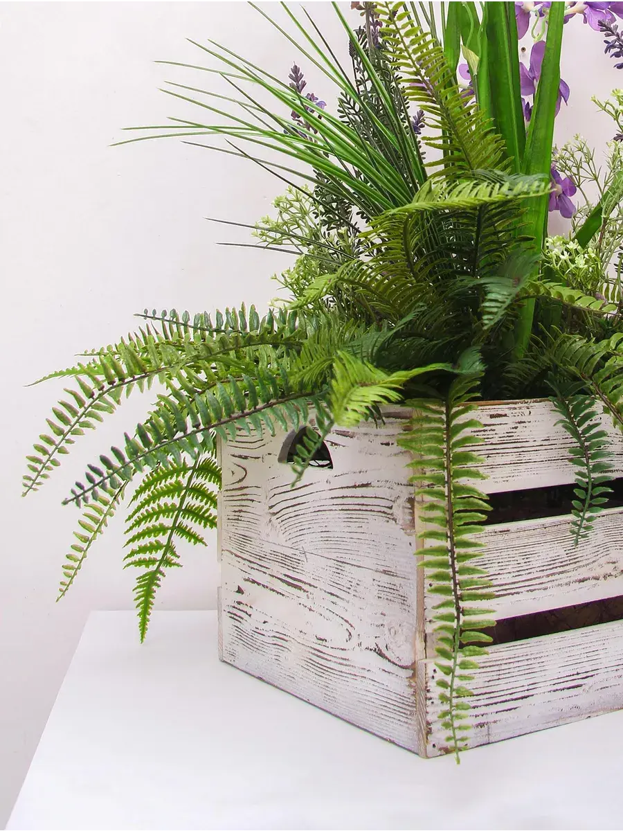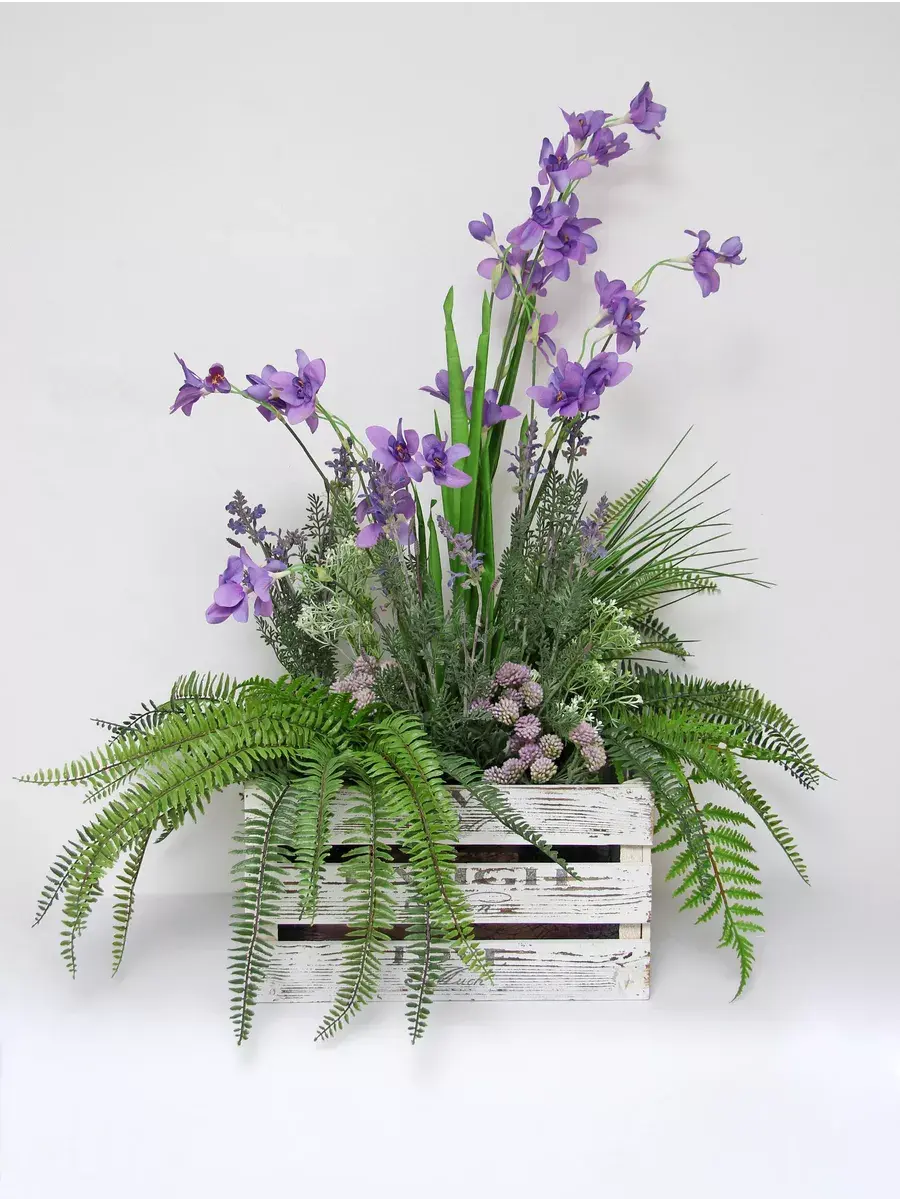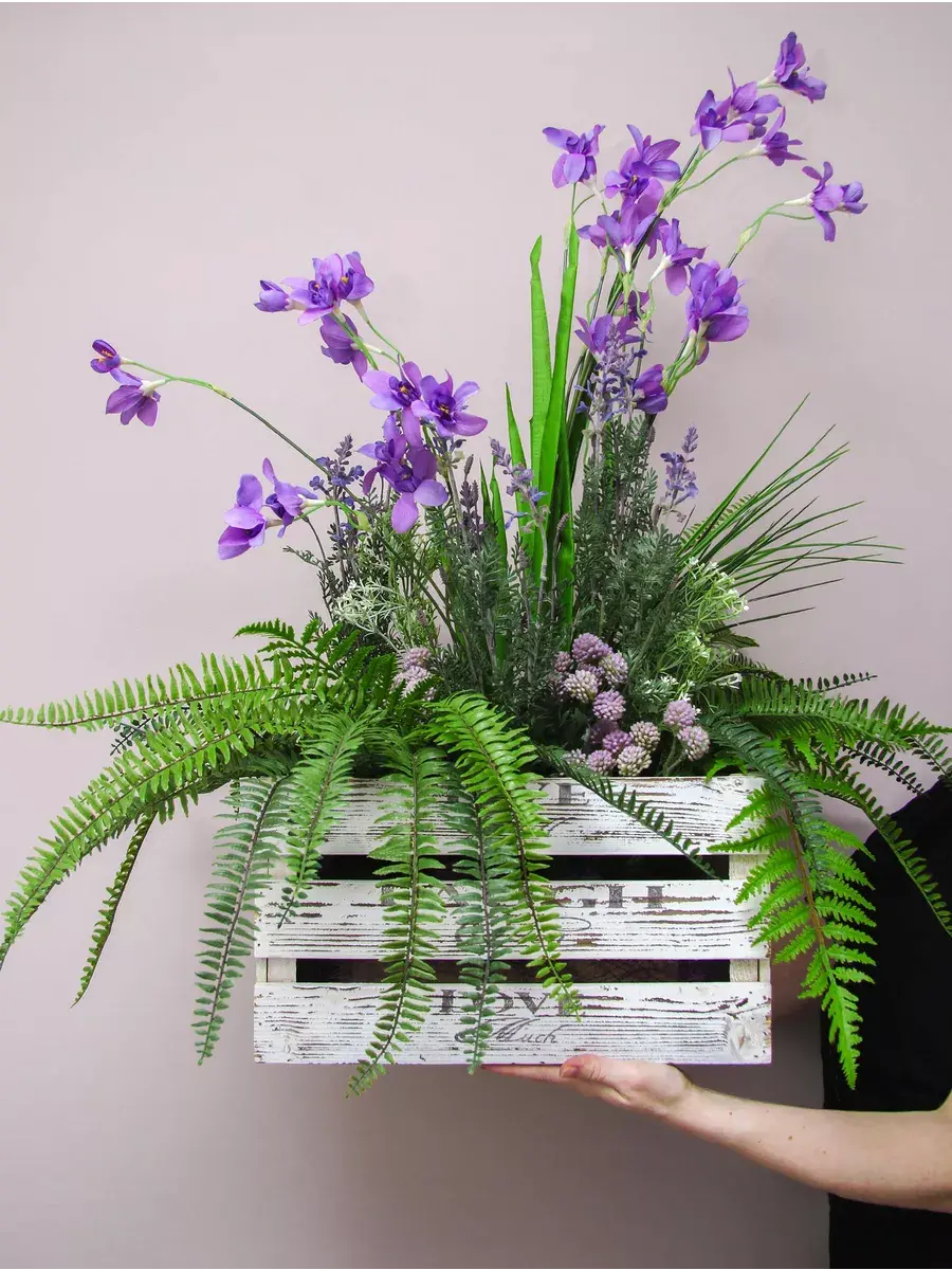 Цветочная композиция в деревянном кашпо.
